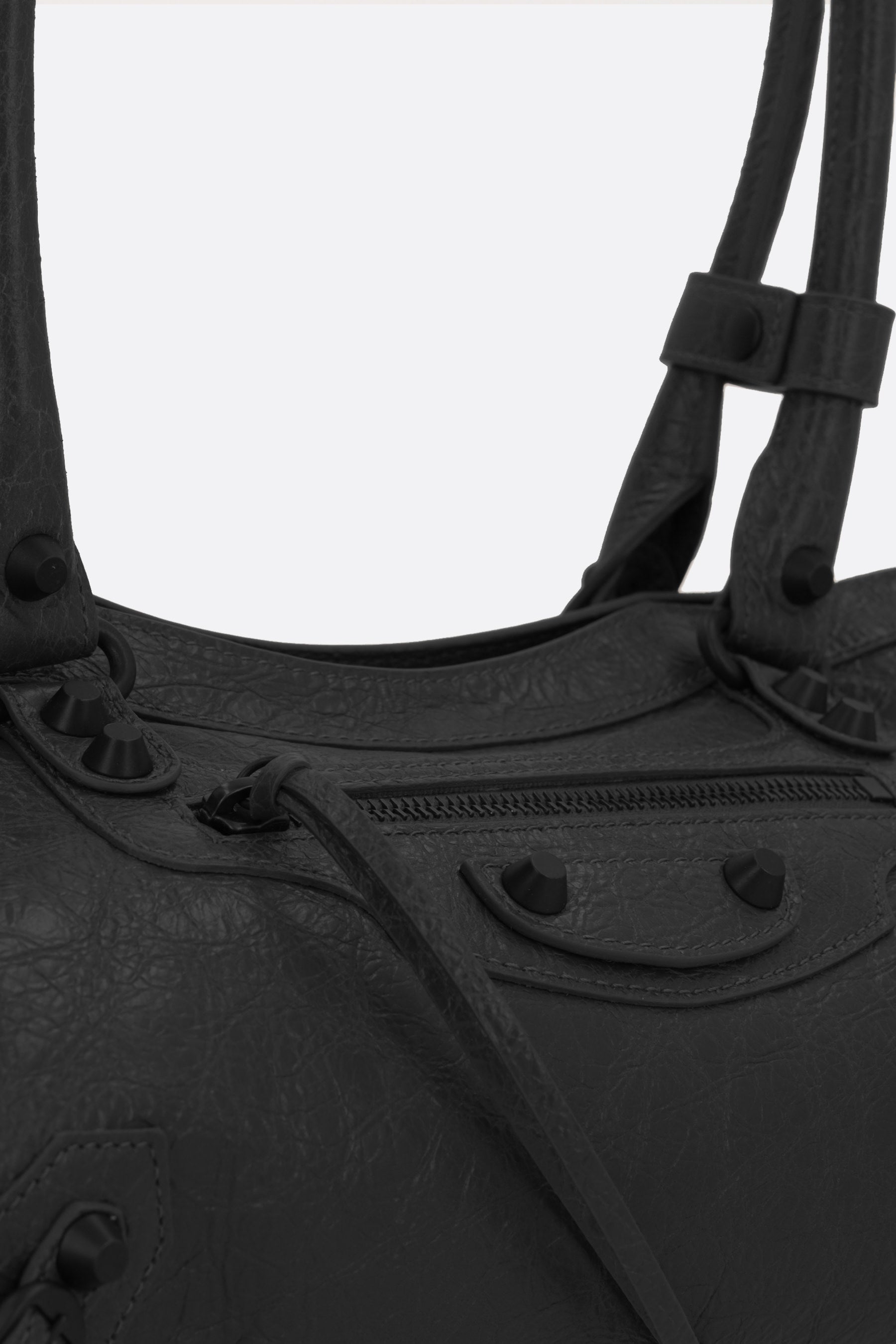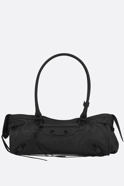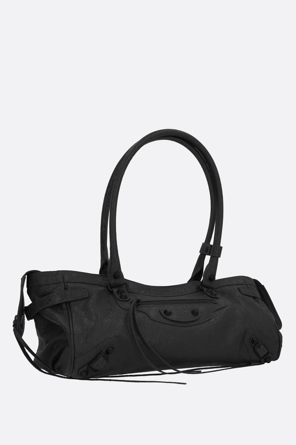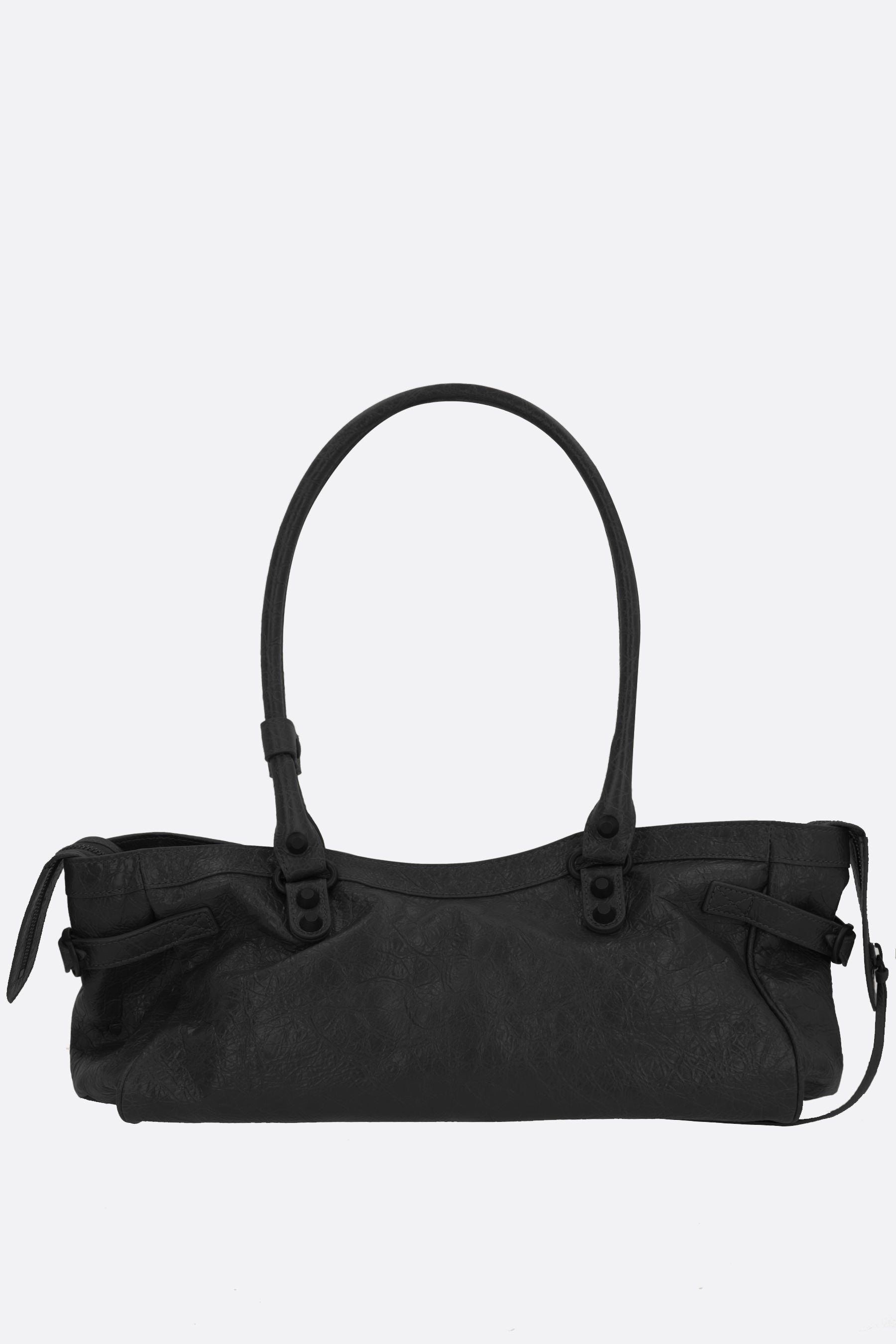 Balenciaga shoulder bag crafted from black Arena Storico leather, embellished with antique brass metal studs and buckles. Featuring a zip closure and double shoulder straps. The black canvas-lined interior includes a flat pocket, while a front zip pocket completes the design.