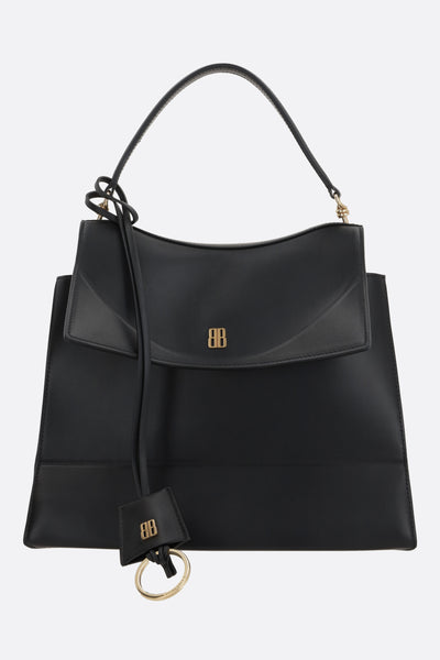 Balenciaga handbag crafted from smooth black leather. It features gold-tone hardware, a magnetic button closure on a folded flap, a top handle, an adjustable/removable strap, and side snap buttons to adjust the width. The black leather-lined interior includes two flat pockets. The design is completed by the iconic BB Nano metal logo on the flap, a removable key holder with a spiral ring, and a zipped pocket on the back.