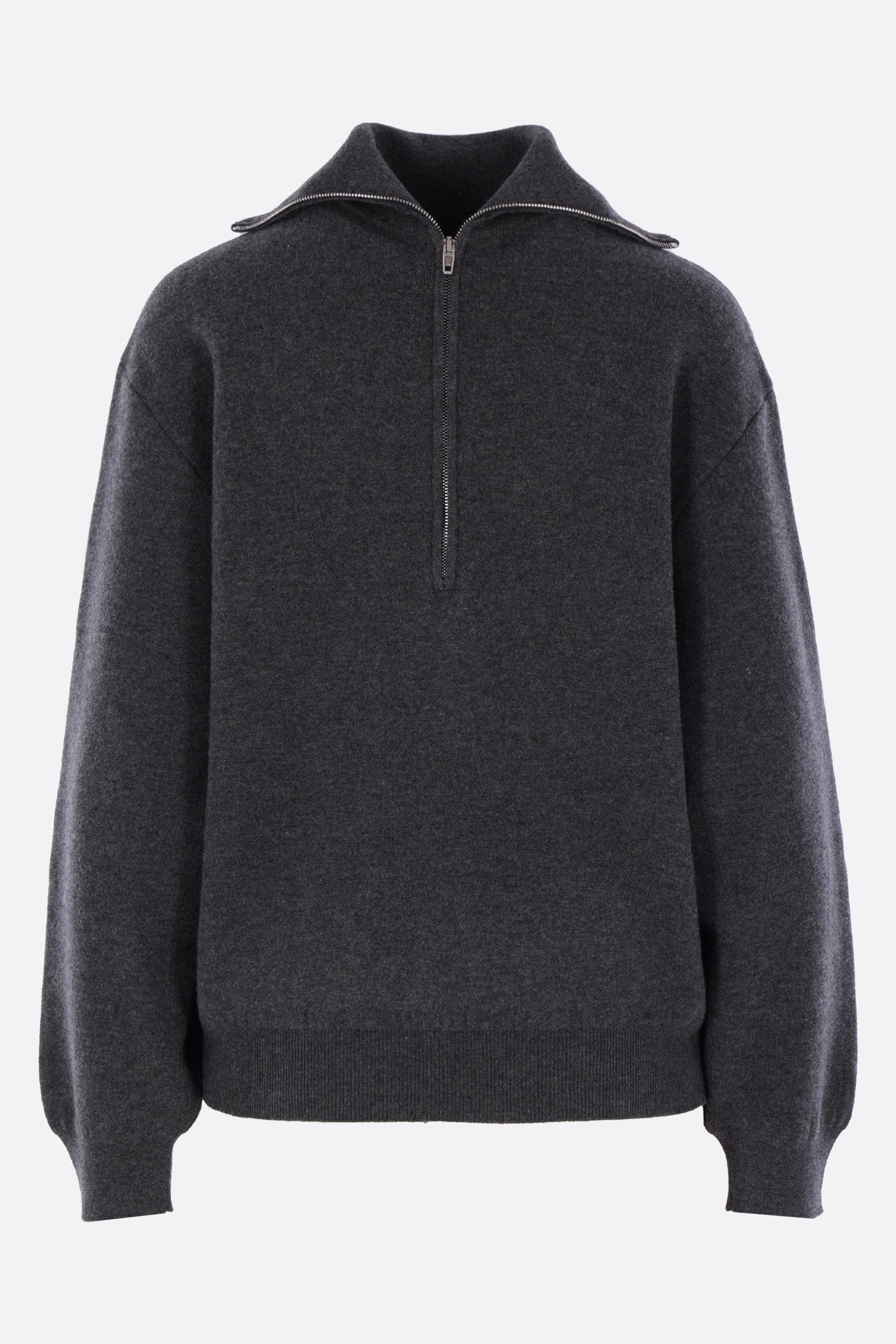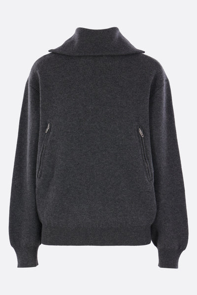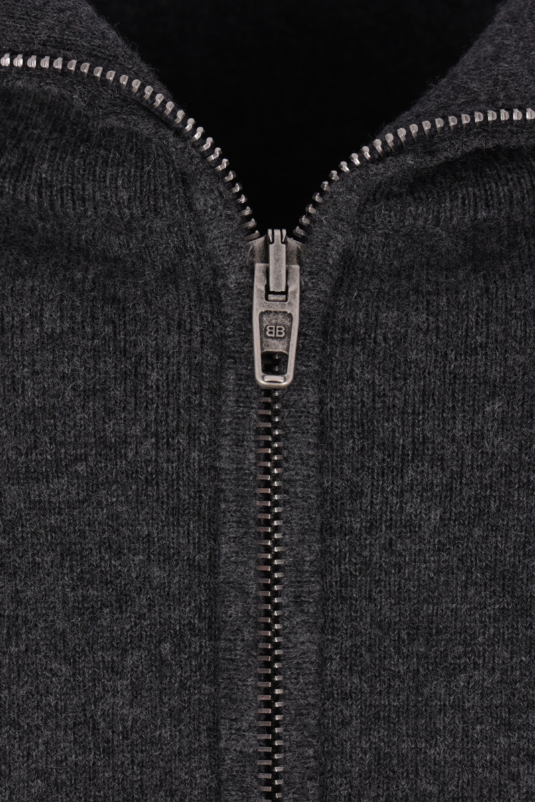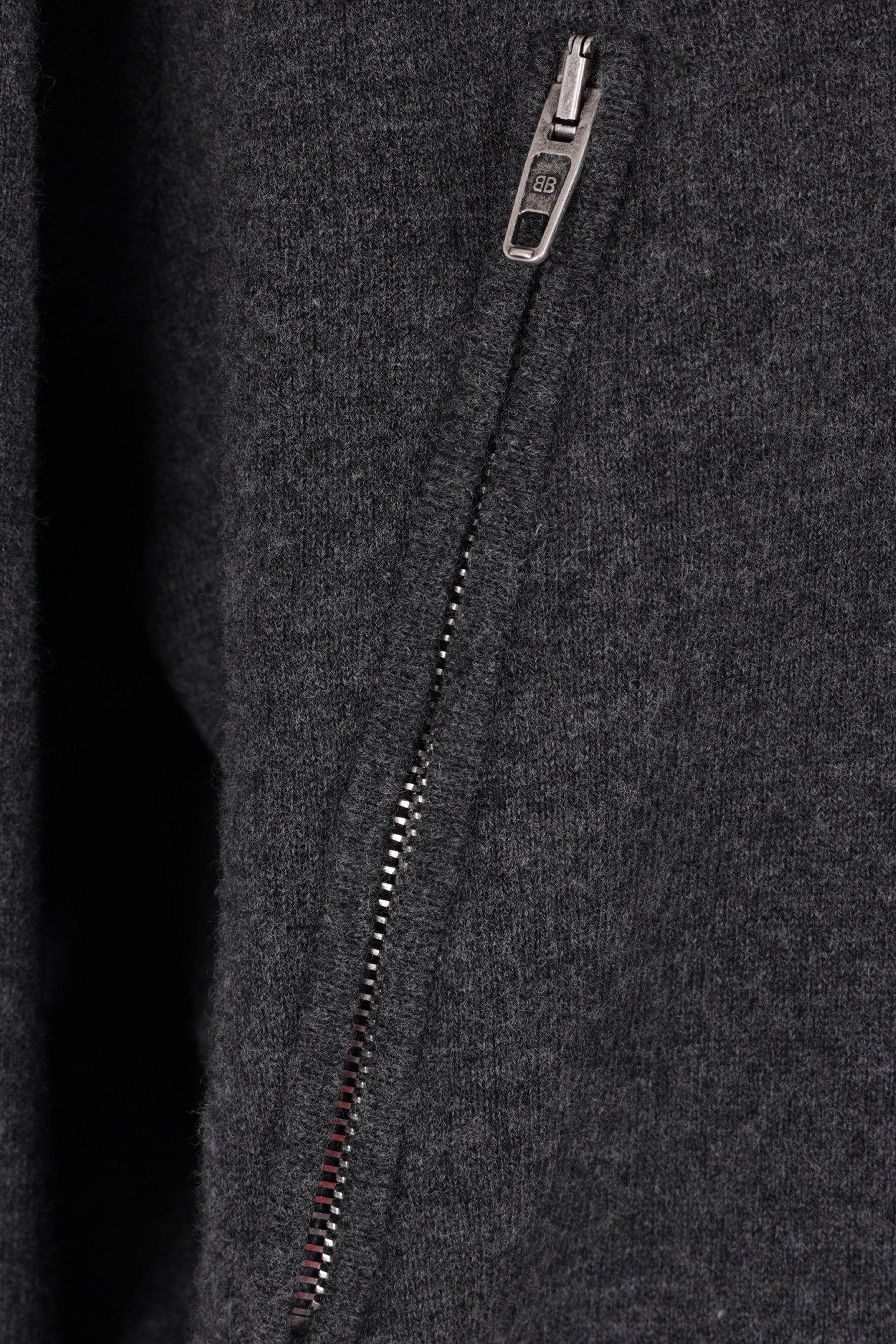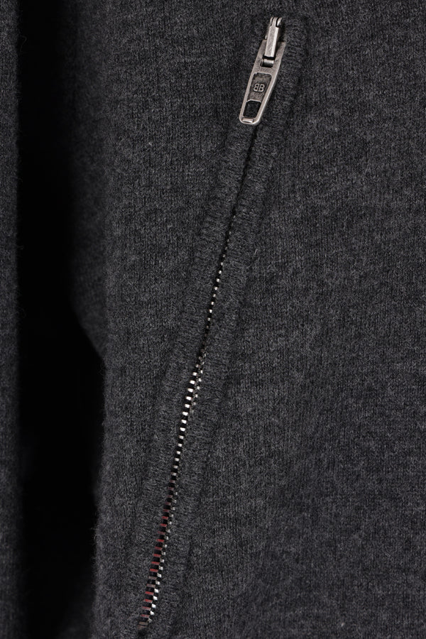 Balenciaga sweater crafted from dark gray wool-blend knit with a back-to-front construction. Features a high collar, partial zip closure, side zip pockets, long sleeves, and ribbed edges.
