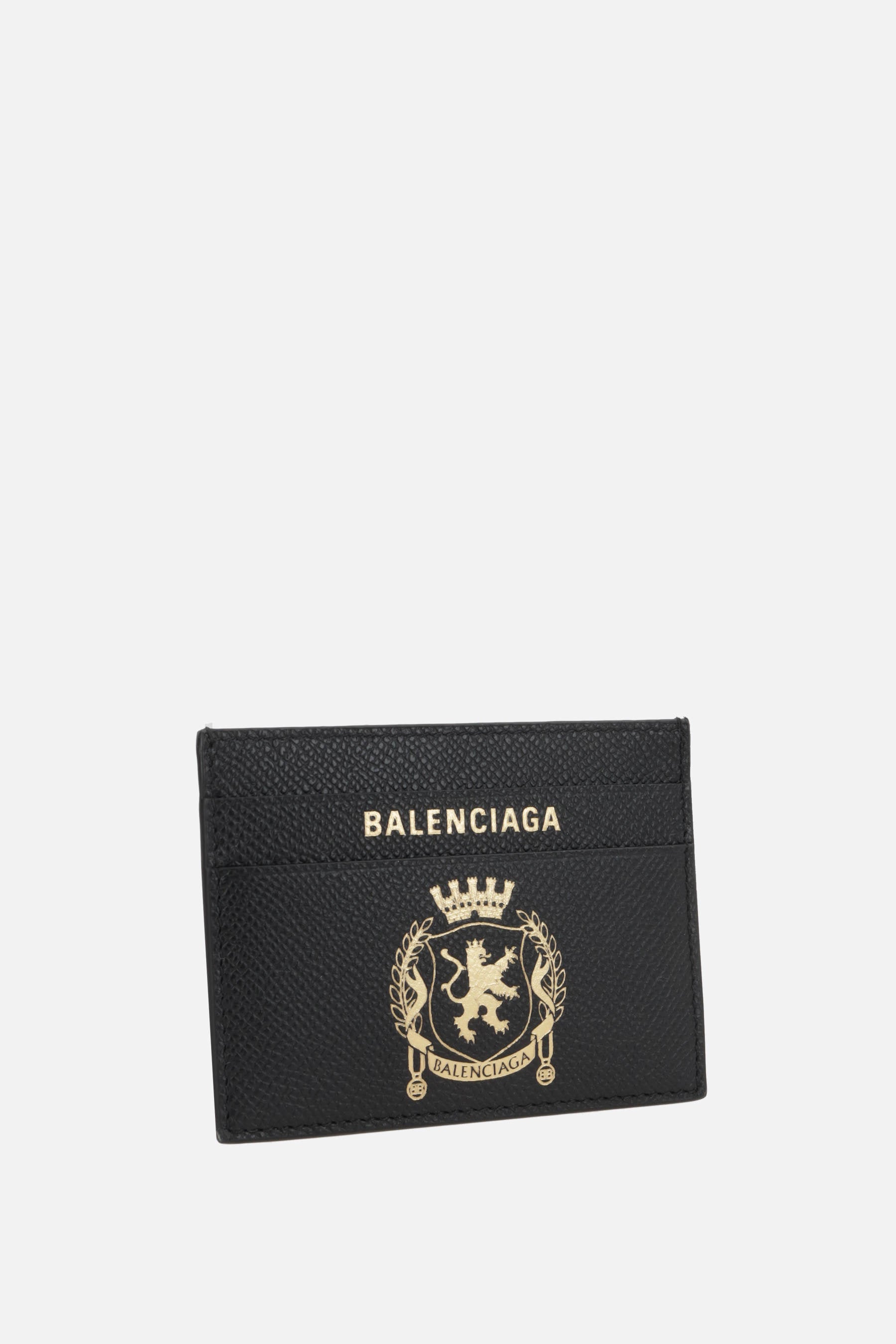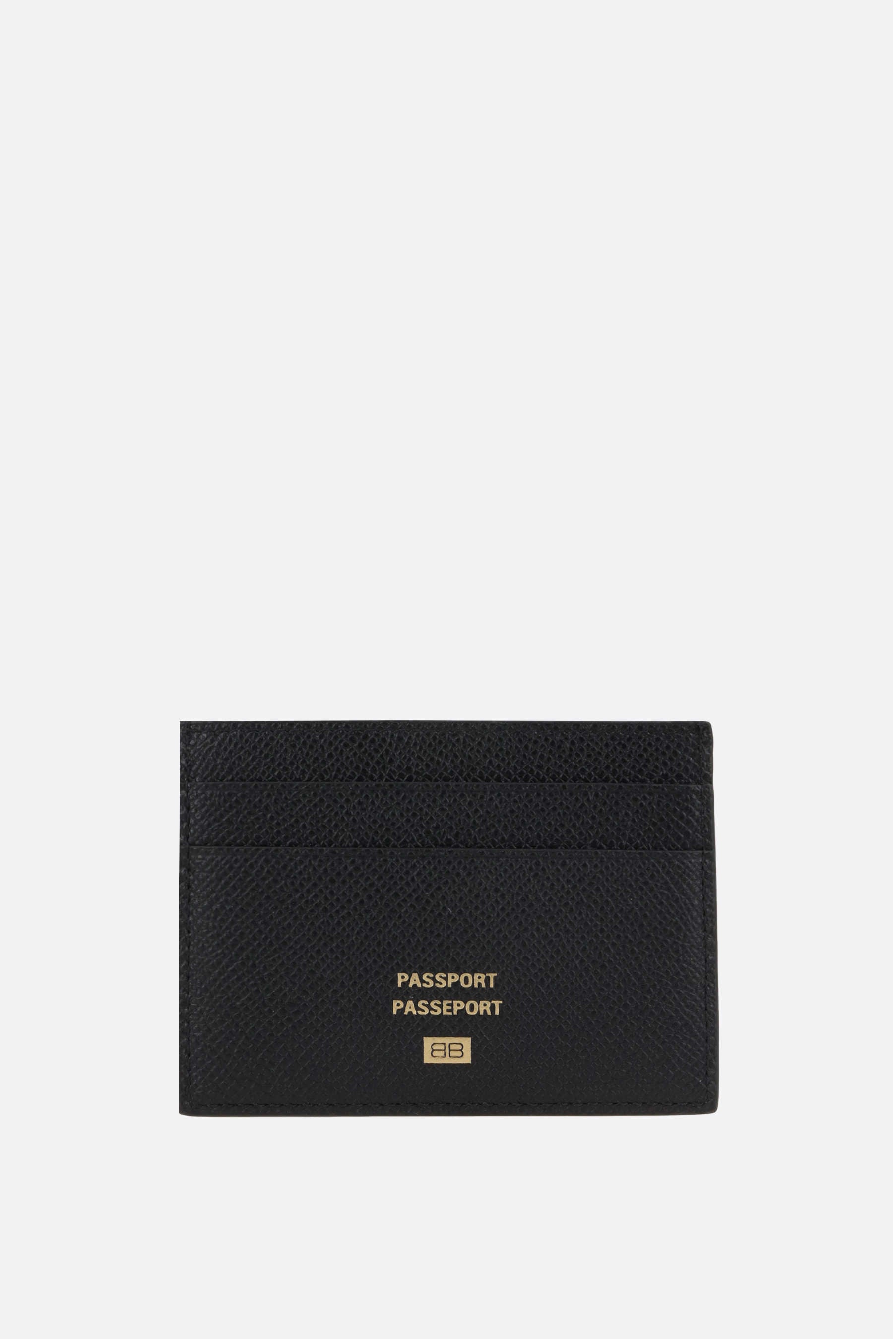 Balenciaga credit card holder crafted from black textured leather with Balenciaga logo embossed on the front and Passport lettering embossed on the back. Featuring a central compartment and four card slots. Leather-lined interior.
