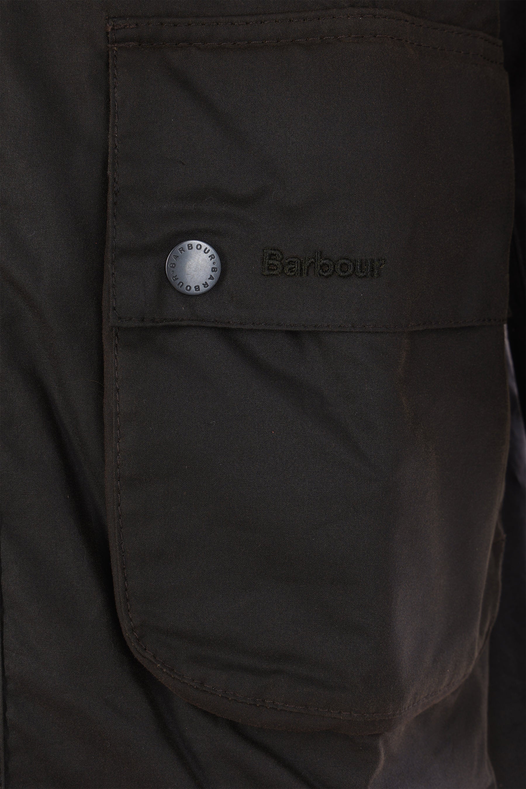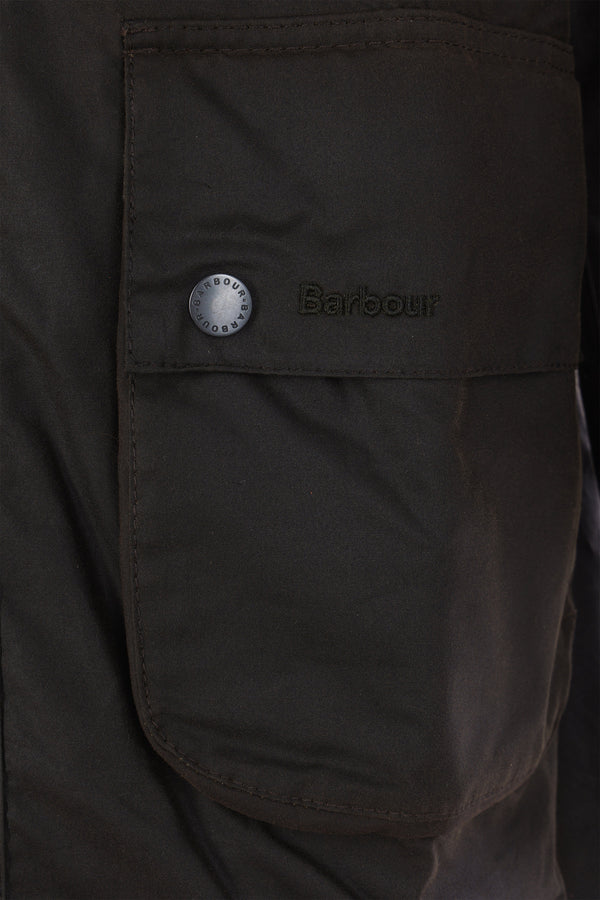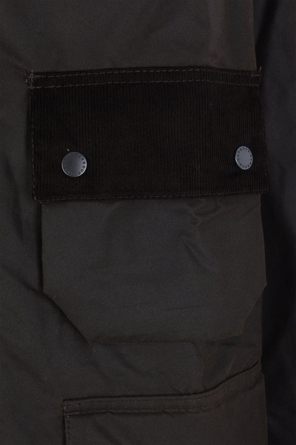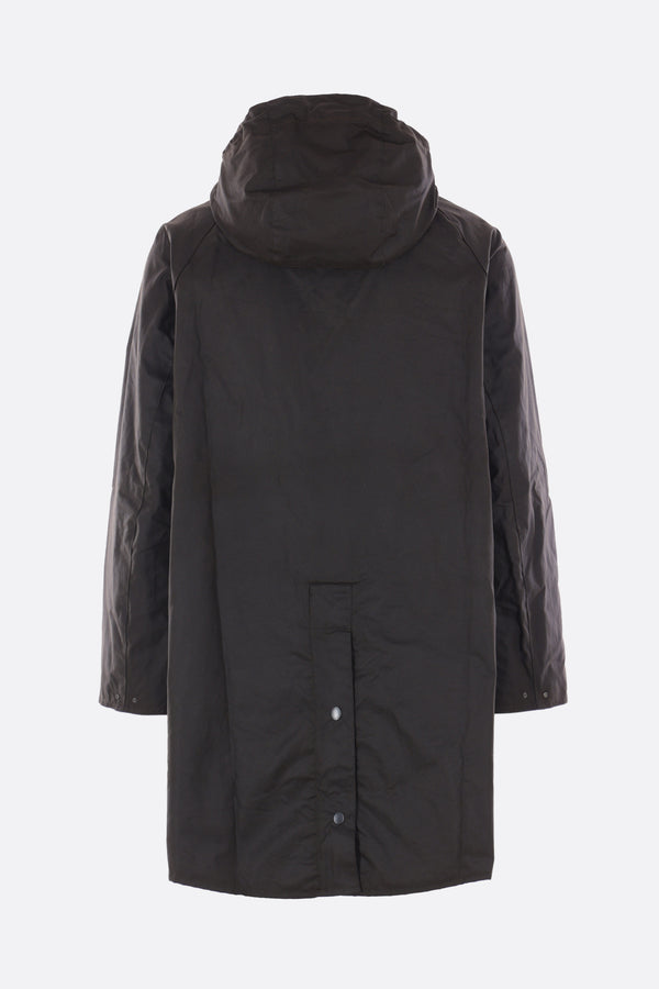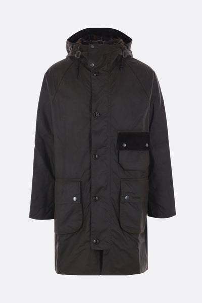 Barbour oversized parka made from dark green waxed cotton with corduroy details. Features a high collar, hood with drawstring, double-slider zip and button front closure, multiple pockets, long sleeves with adjustable cuffs, straight hem with buttoned central vent, and tartan flannel lined interior.