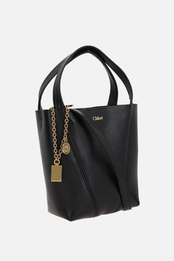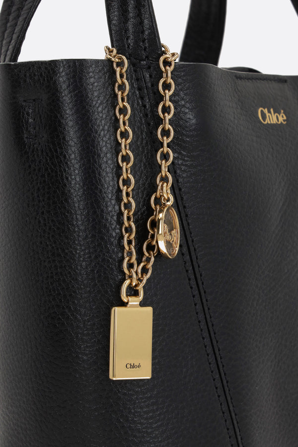 Chloé tote bag crafted from black grained leather. Features gold-tone hardware, double handles, adjustable/removable strap and a decorative chain with "Chloé" and "Horse" pendants. Unlined interior. Wear on the shoulder or slide the handles through the ring for relaxed hand carry.