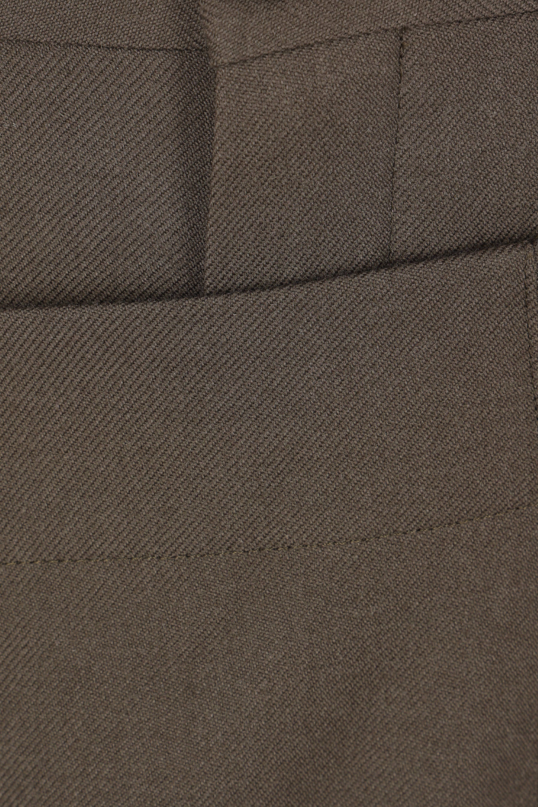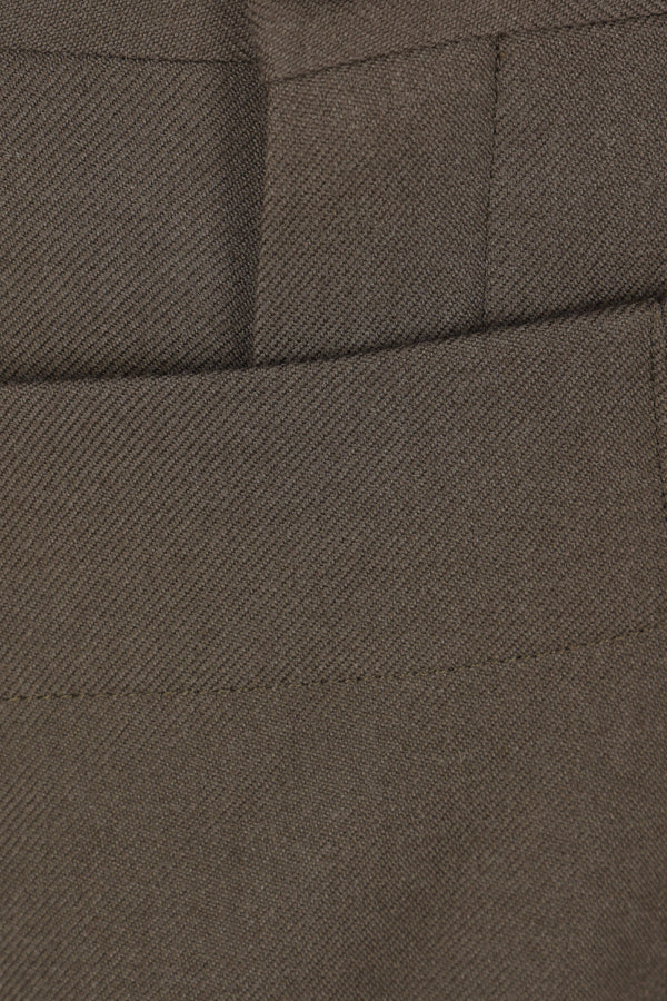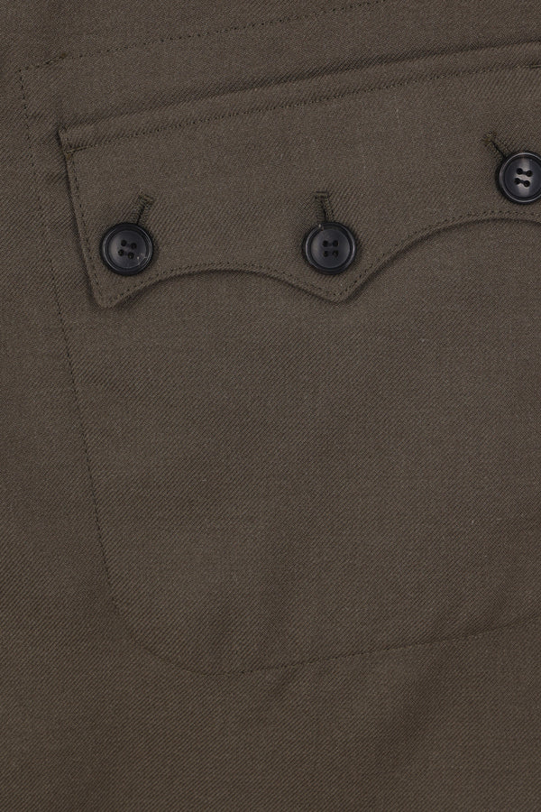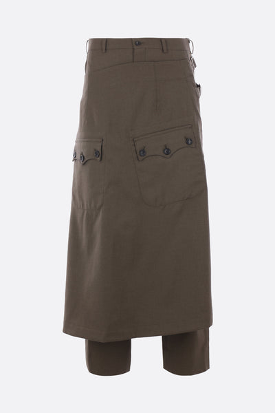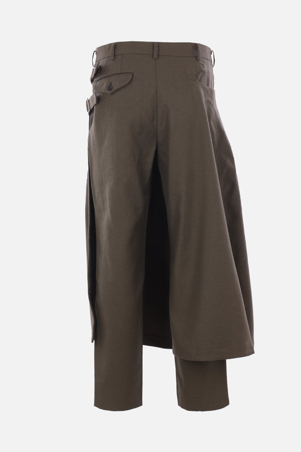 Comme des Garçons Homme Plus wrap kilt-trousers crafted from khaki wool gabardine. Featuring button/zip closure, belt loops, multiple pockets, overlapping front panel with adjustable side strap, and partially lined interior.