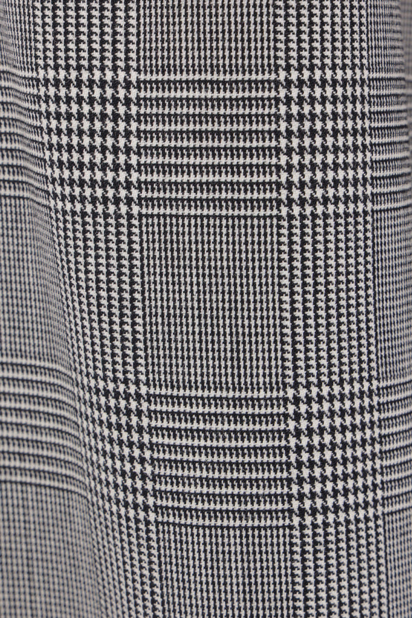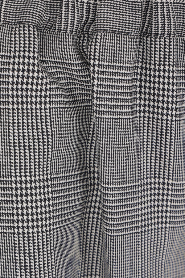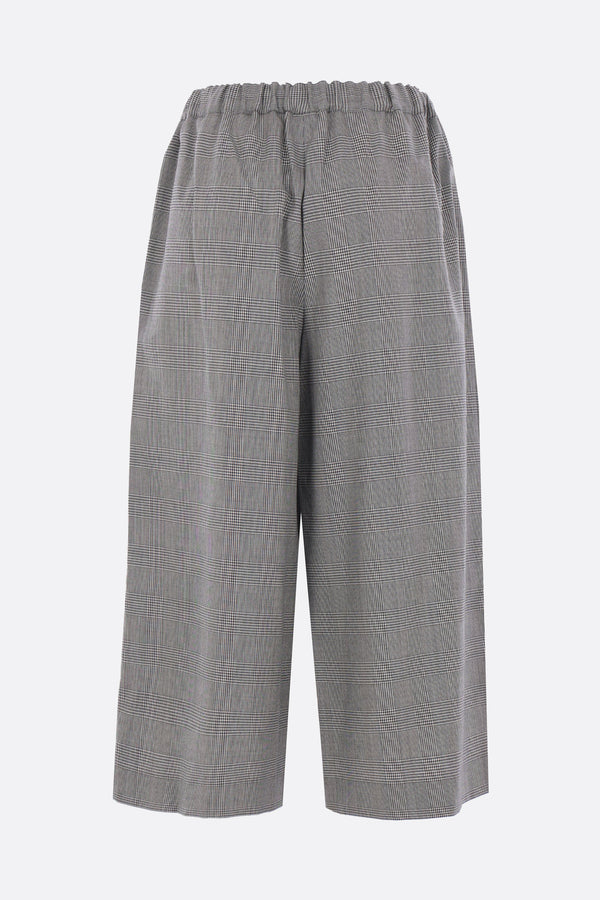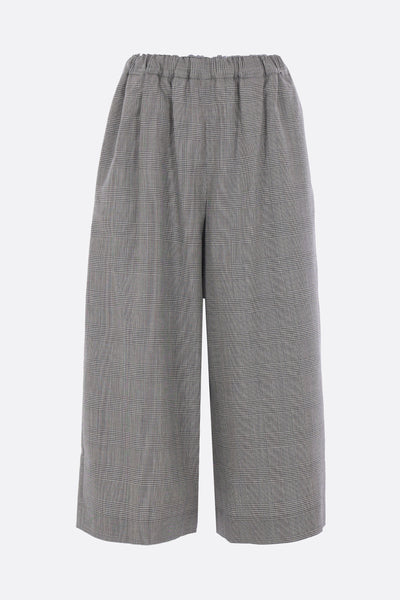 Comme des Garçons culotte trousers made from black and ecru Prince of Wales check wool. Features elasticated waistband with drawstring, hidden side pockets, and unlined interior.