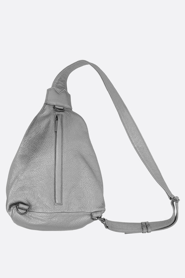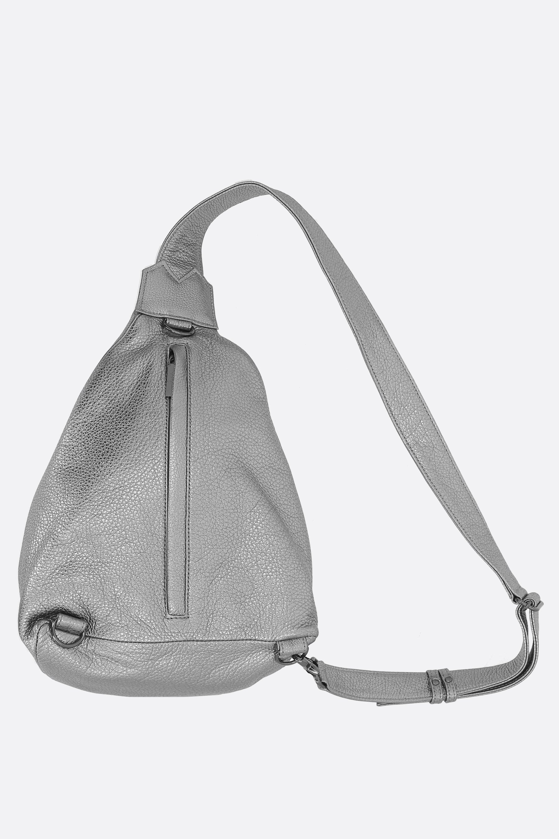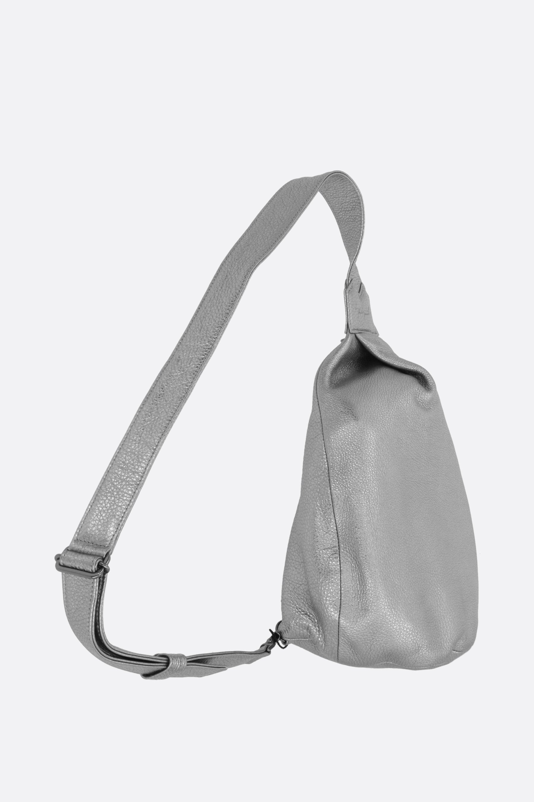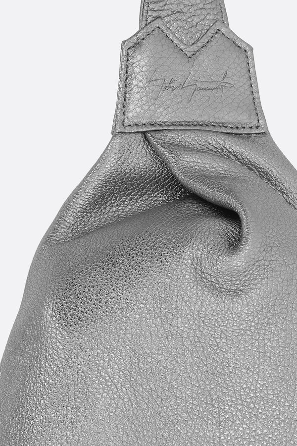 Discord Yohji Yamamoto sling bag crafted from silver pebbled leather. Featuring ruthenium-tone hardware, zip closure, and an adjustable shoulder strap. The black canvas-lined interior includes a zip pocket. The design is completed by the embossed signature on the front.