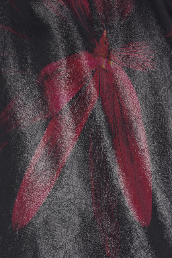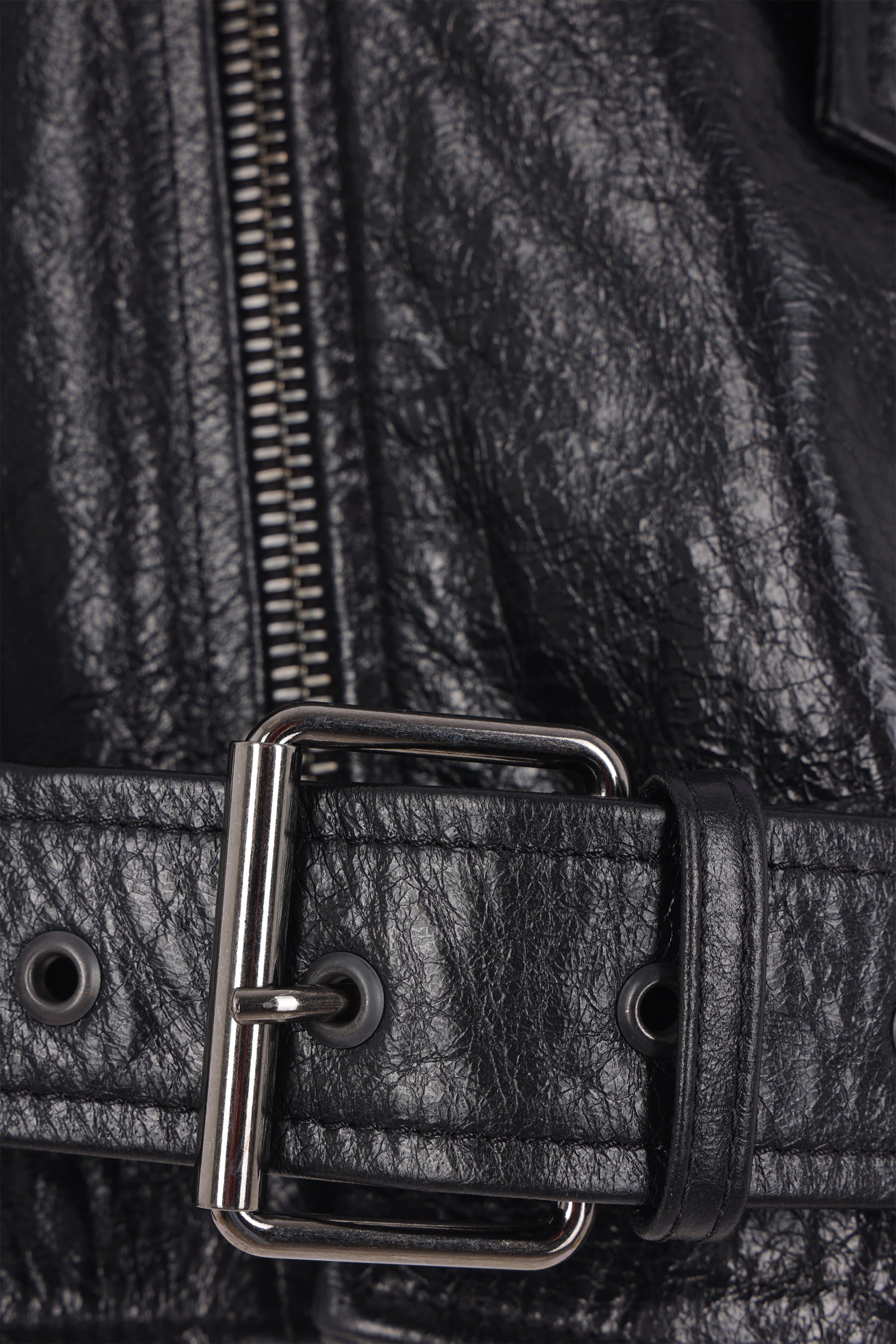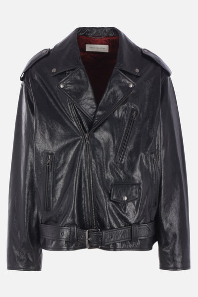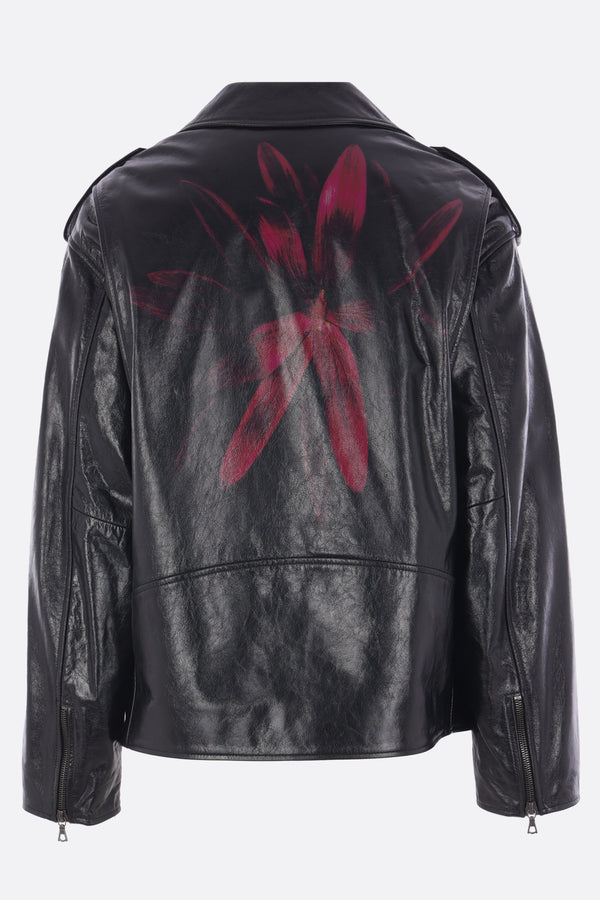 Dries Van Noten oversized biker jacket crafted from black leather with floral print on the back. Featuring a biker collar, off-center zip closure, multiple pockets, long sleeves with zipped cuffs, shoulder epaulettes, waist belt, and quilted lining.