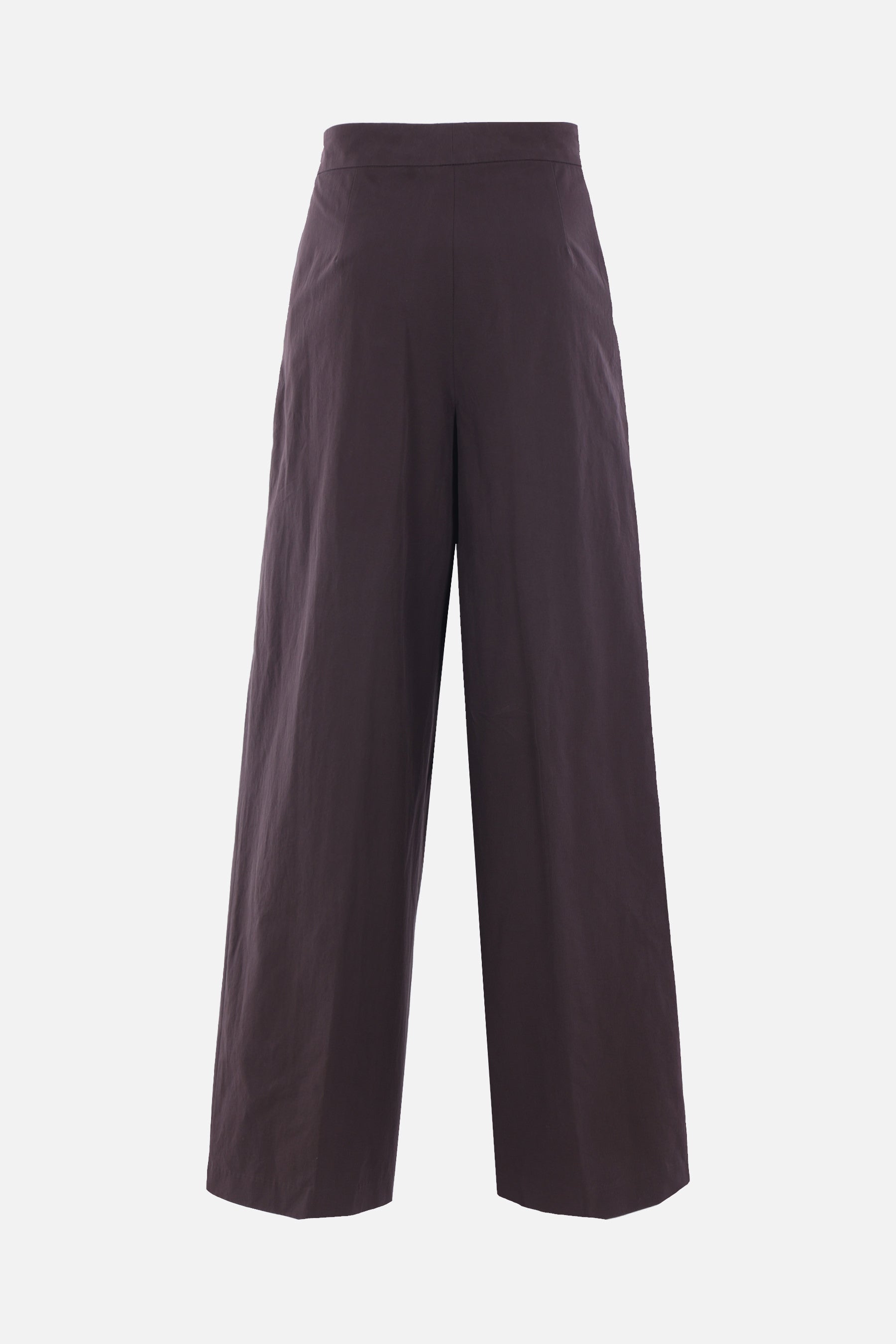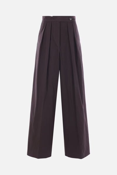 Dries Van Noten wide-leg trousers made of dark brown cotton poplin. Featuring front button and zip closure, multiple pockets, double pleats, central crease, and unlined interior.