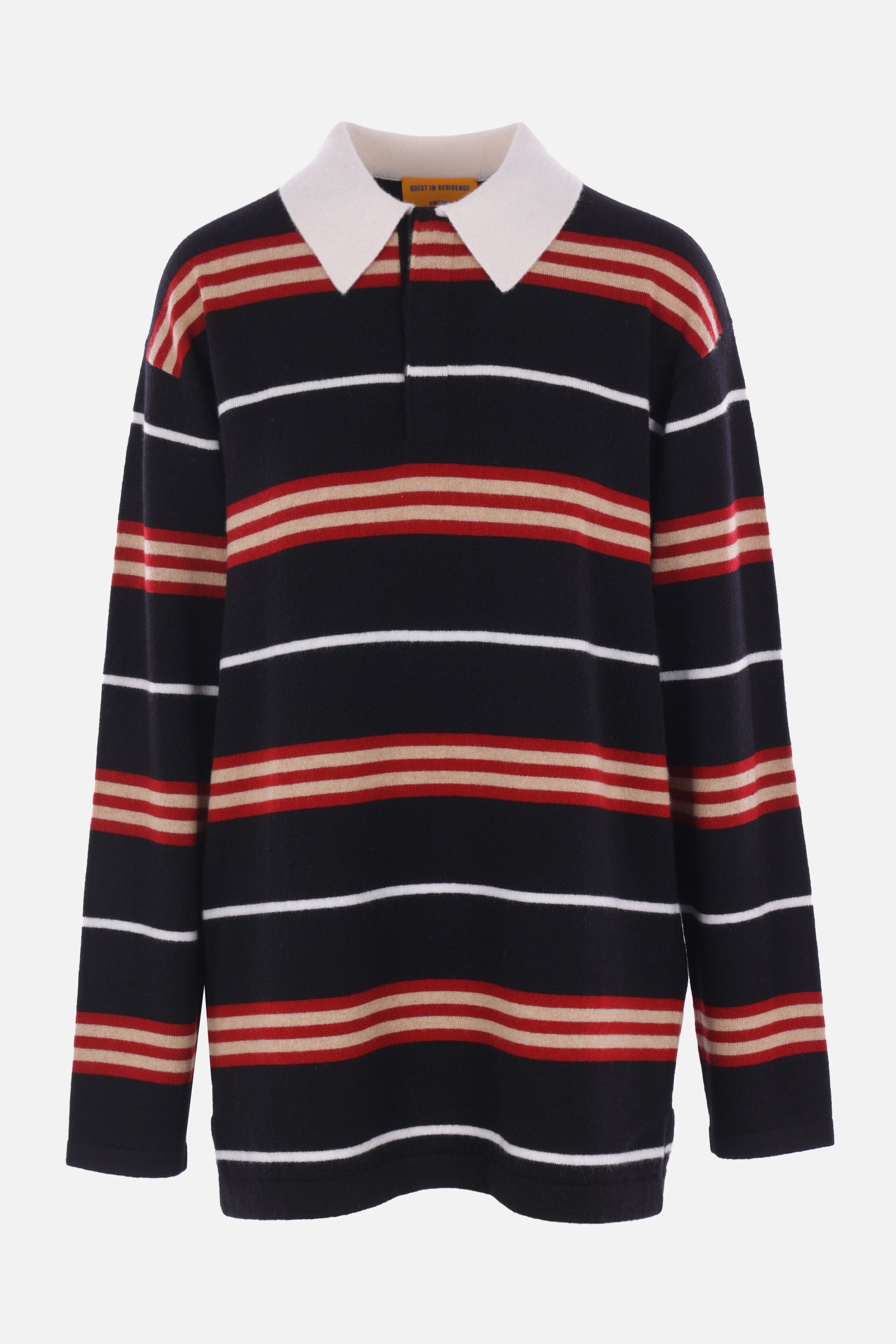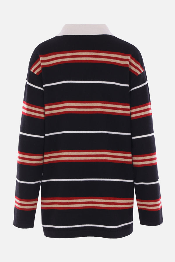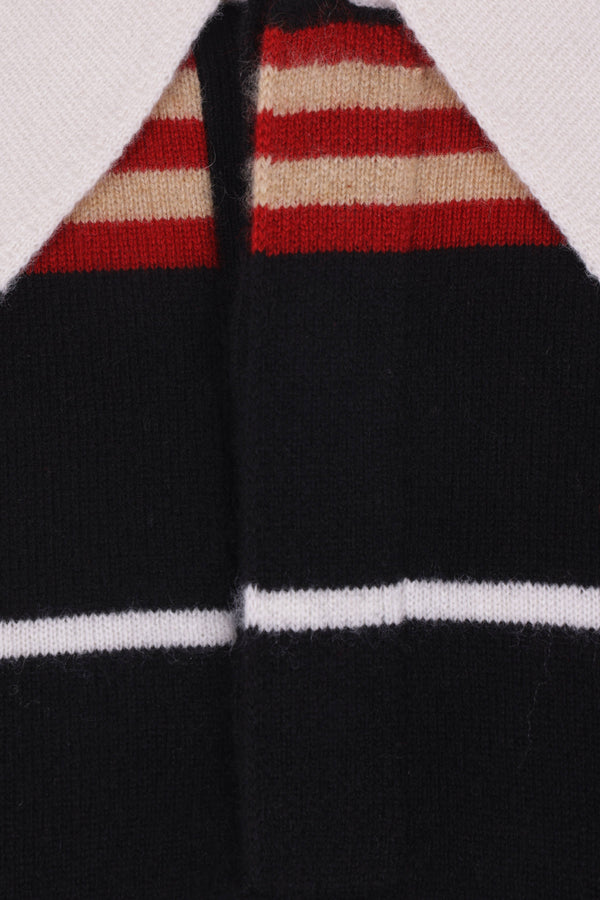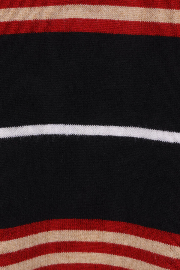 Guest In Residence striped polo sweater crafted from cashmere knit in shades of black, red, and beige. Featuring a polo collar, front closure with three buttons, long sleeves, and a straight hem with small side slits.