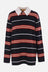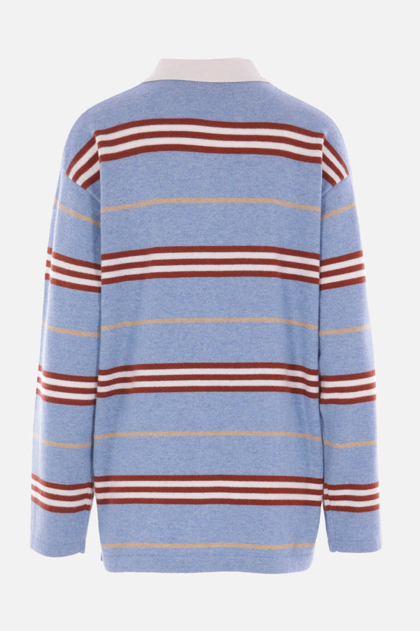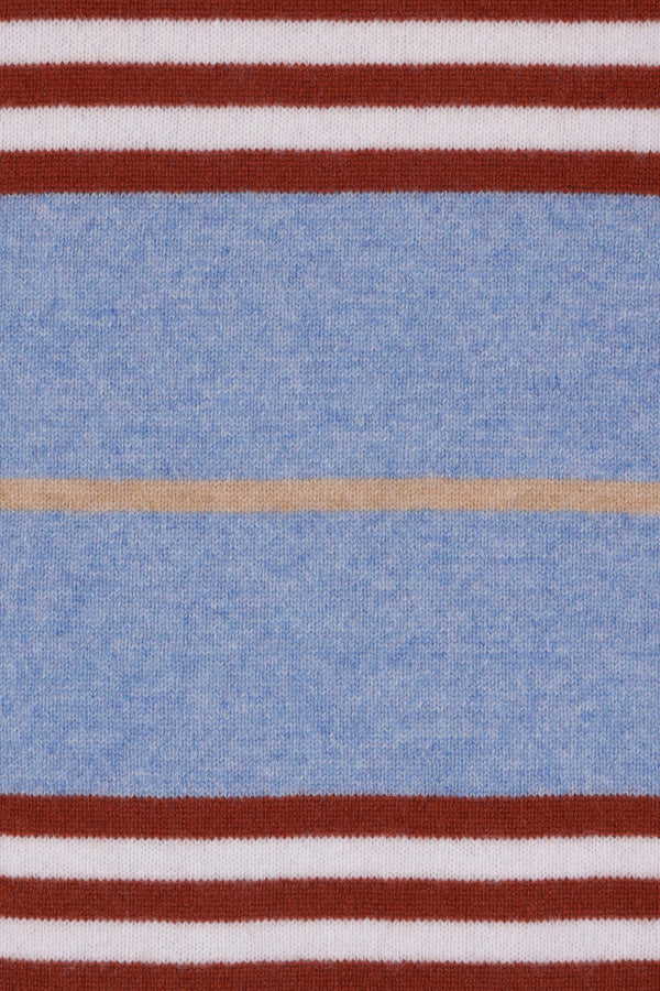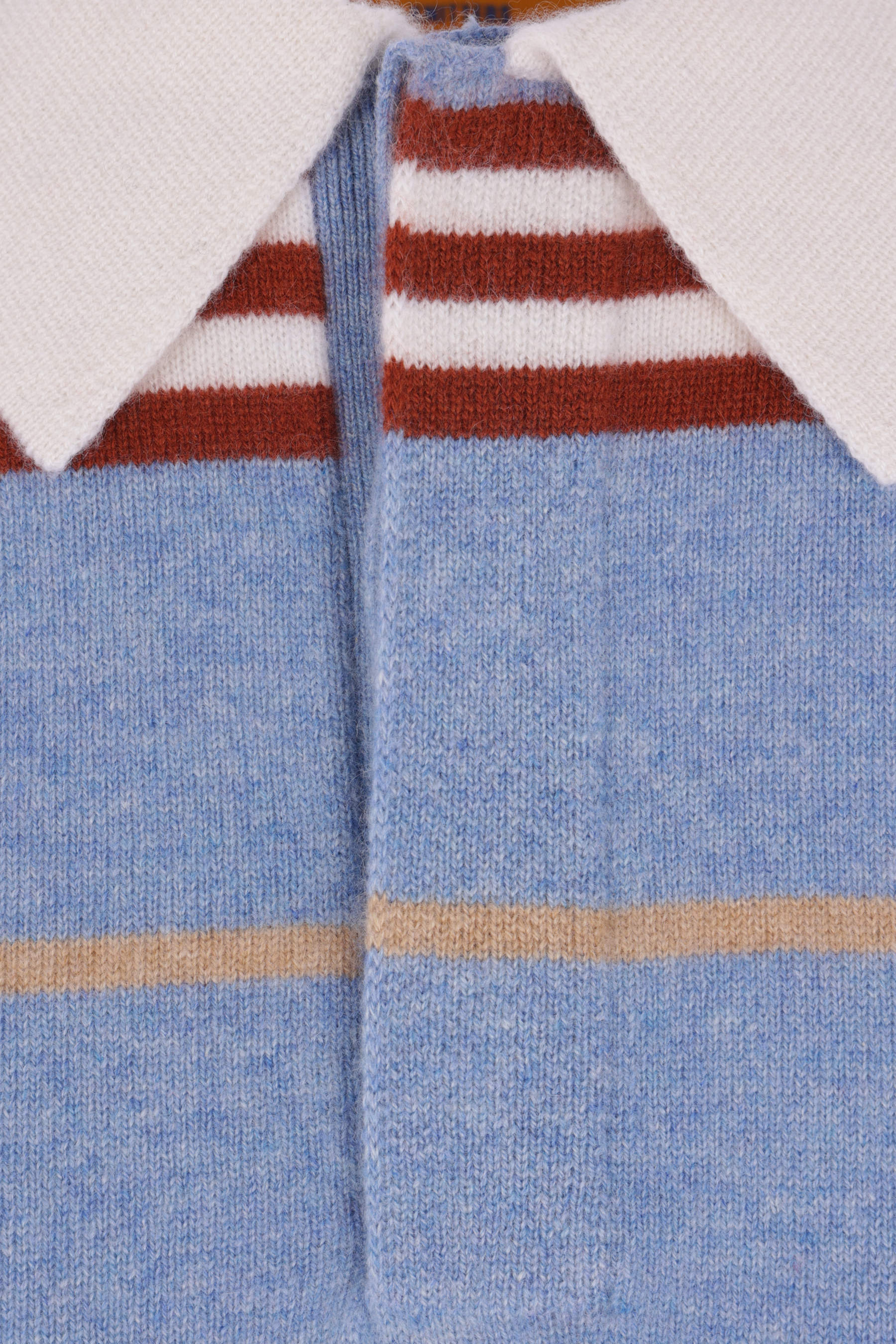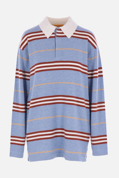 Guest In Residence striped polo sweater crafted from cashmere knit in shades of blue, brown, and white. Featuring a polo collar, front closure with three buttons, long sleeves, and a straight hem with small side slits.