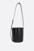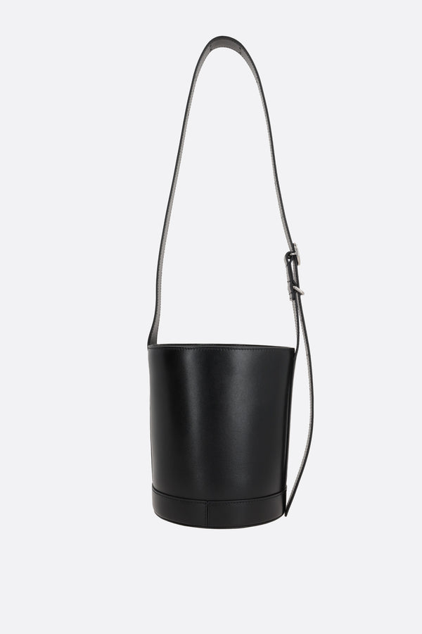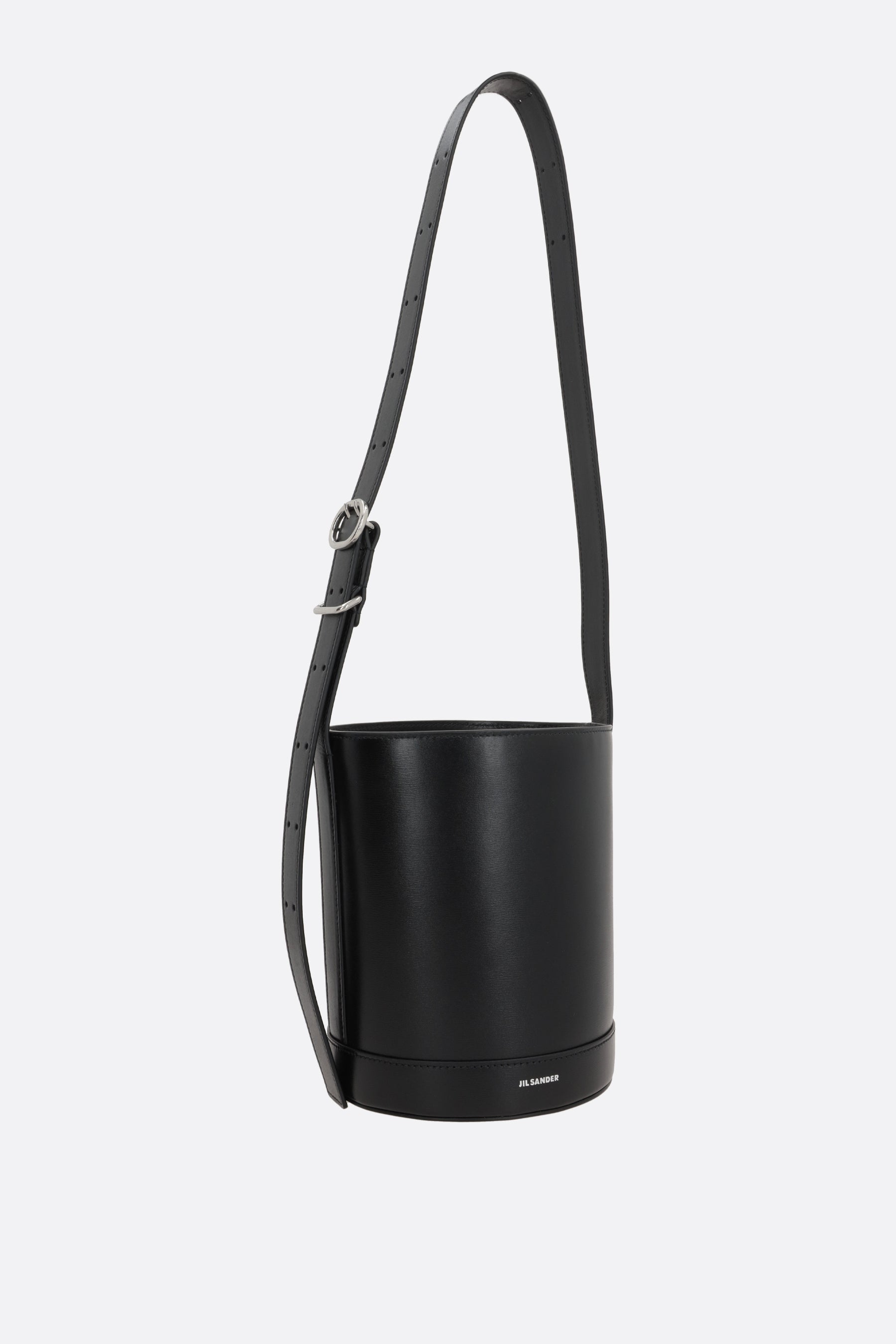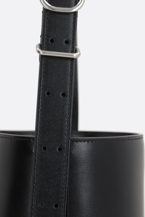 Jil Sander bucket bag crafted from smooth black leather. Featuring silver-tone hardware, internal hook closure, and an adjustable shoulder strap. The tone-on-tone nappa leather-lined interior includes a matching coin purse. The design is completed with the distinctive embossed front logo lettering.