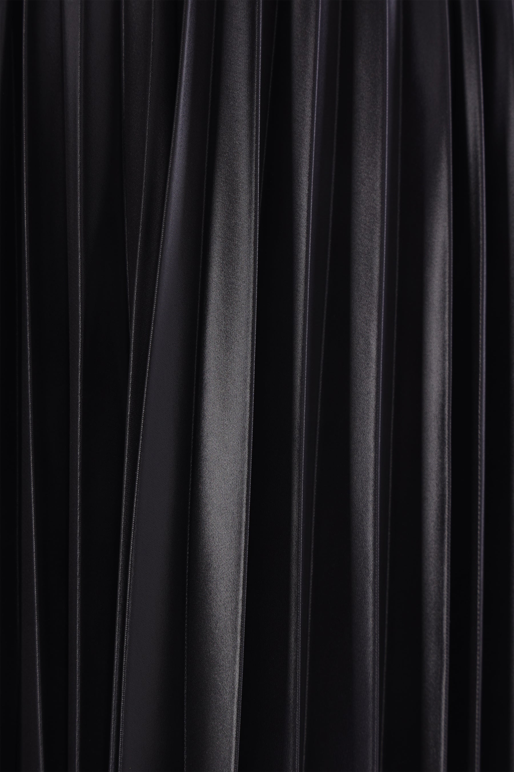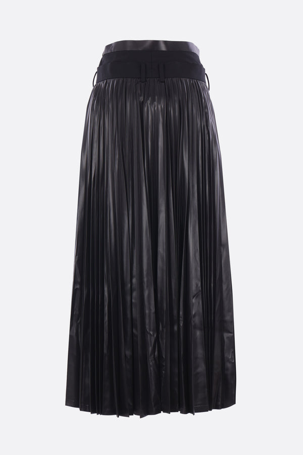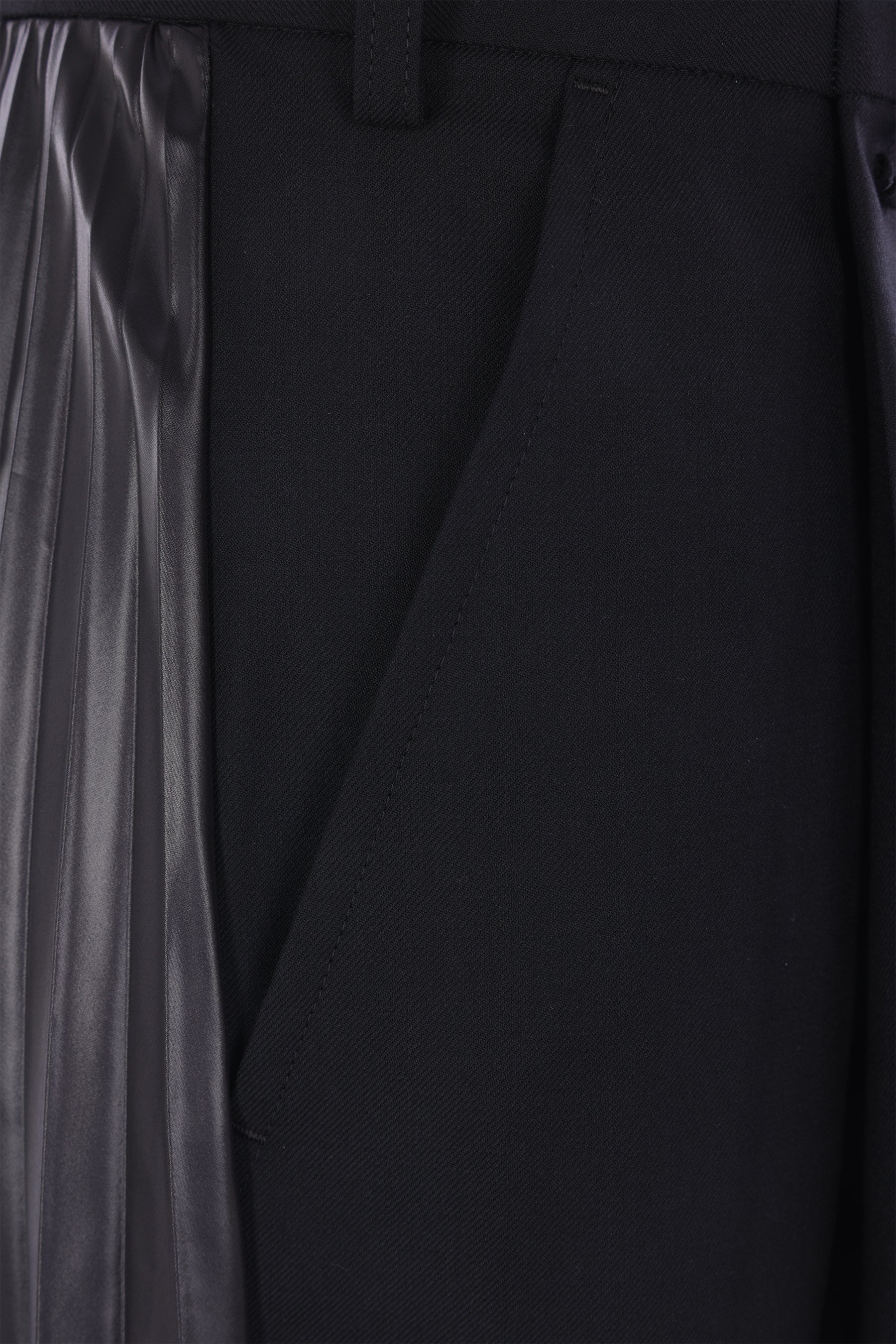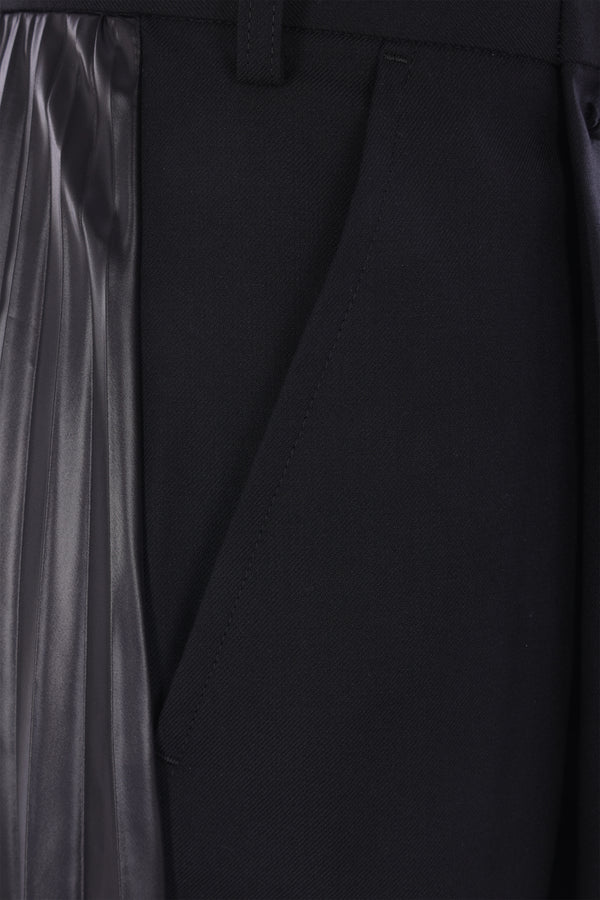 Junya Watanabe cropped trousers made from black wool-blend with shiny nylon pleated back panel. Features double-waist design, front hook, button, and zip closure, belt loops, slanted pockets, front pleats, central crease, cuffed hem with side vents, and partially lined interior.