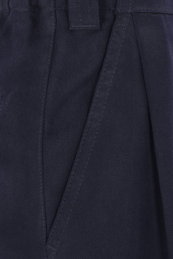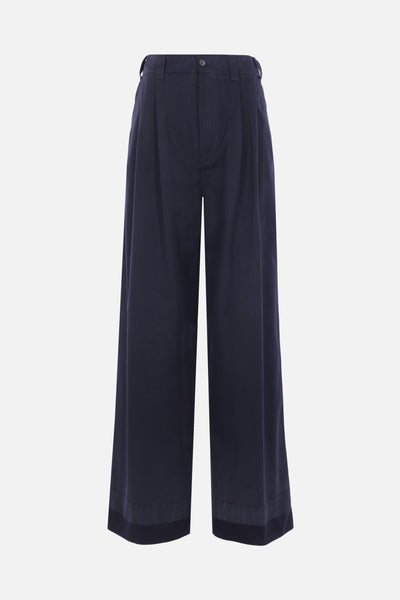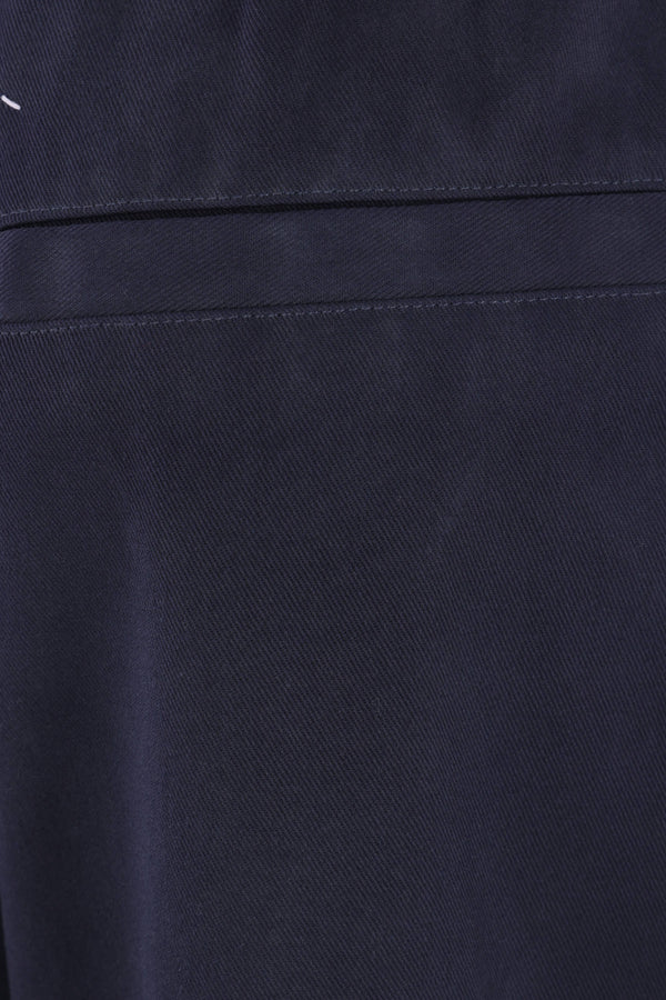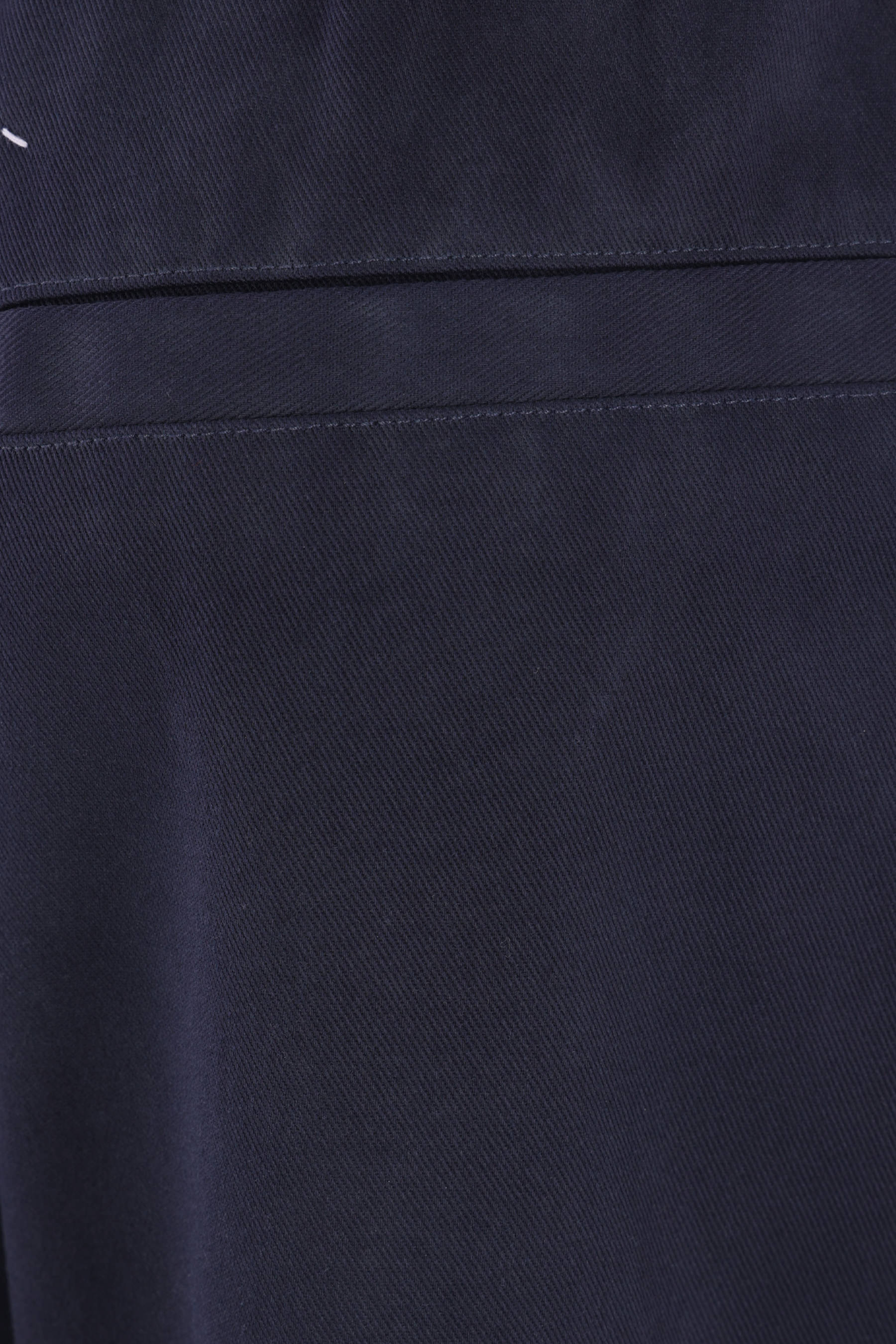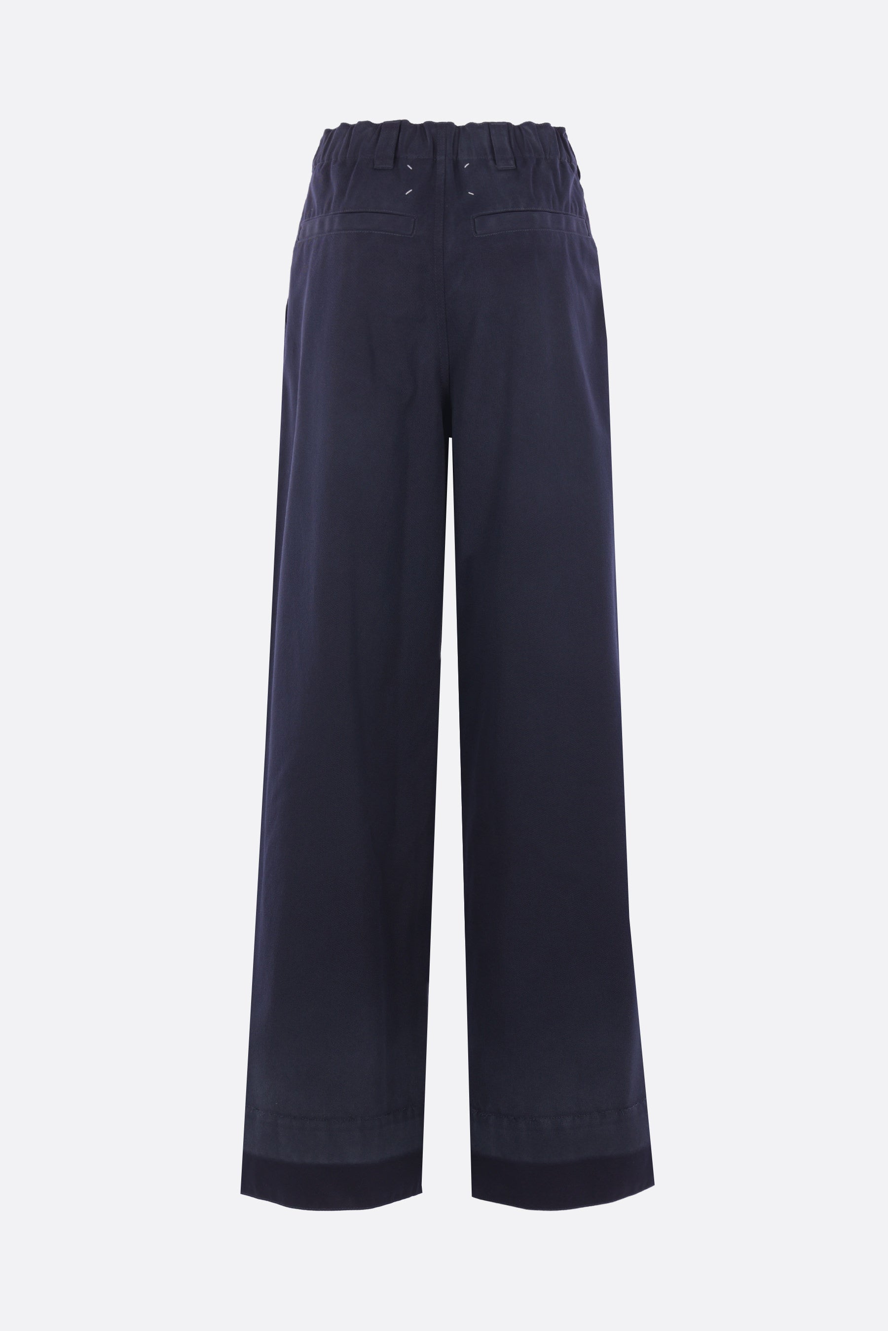 Maison Margiela wide-leg chino trousers crafted from blue cotton-blend gabardine. Featuring an elasticated waistband, front button and zip closure, belt loops, double pleats, and raw-edged cuffs with a washed effect. The design is completed with the Maison's signature four white stitches on the back.