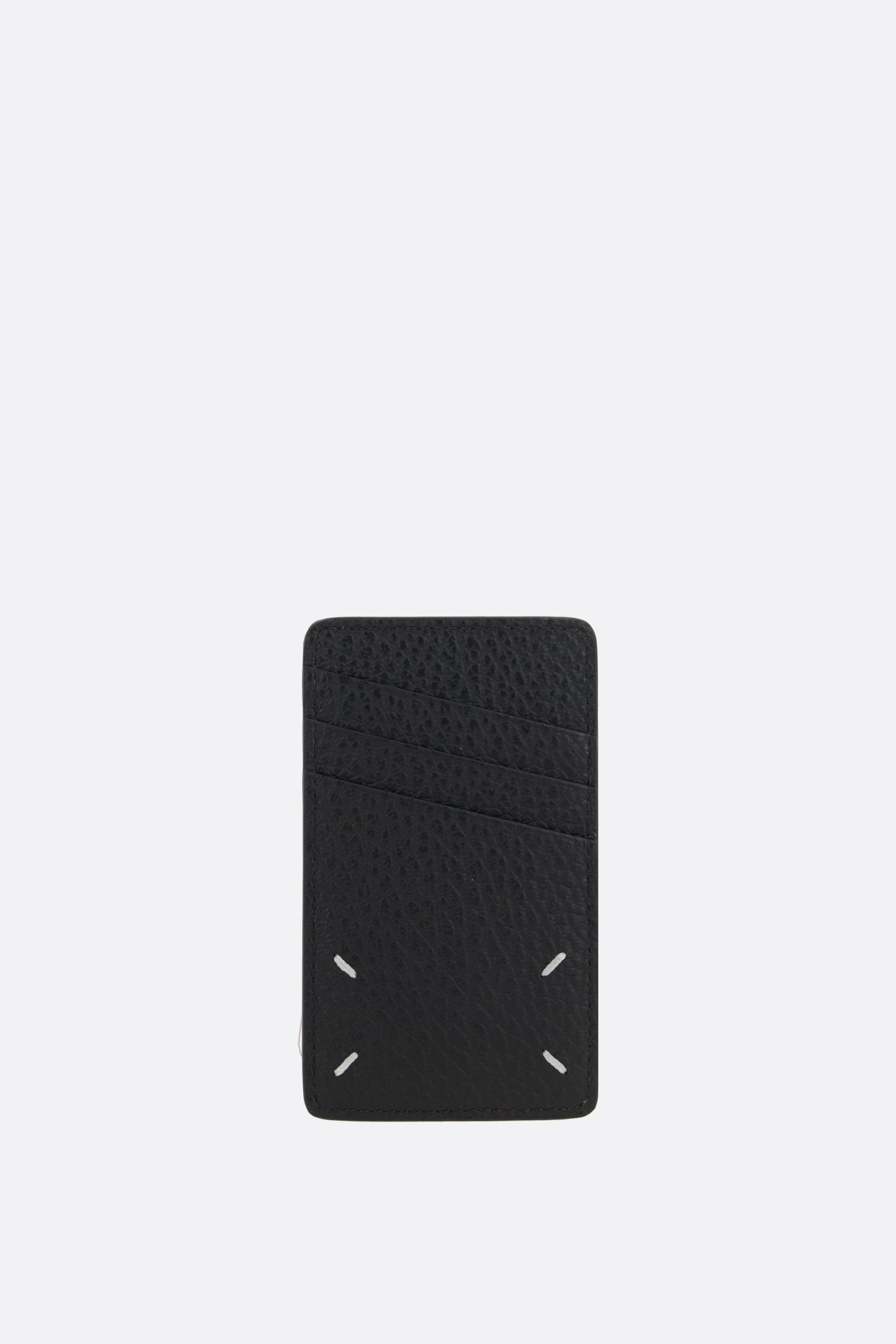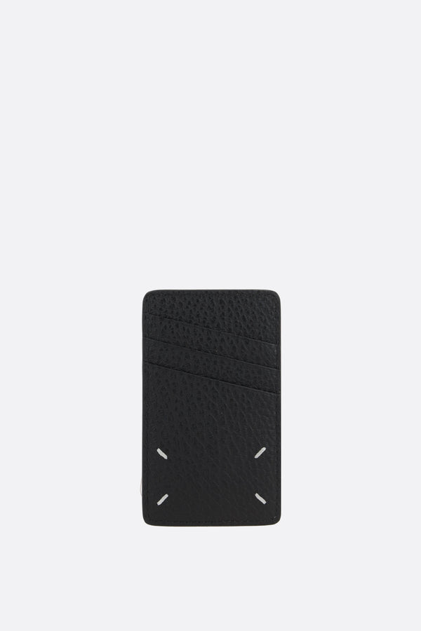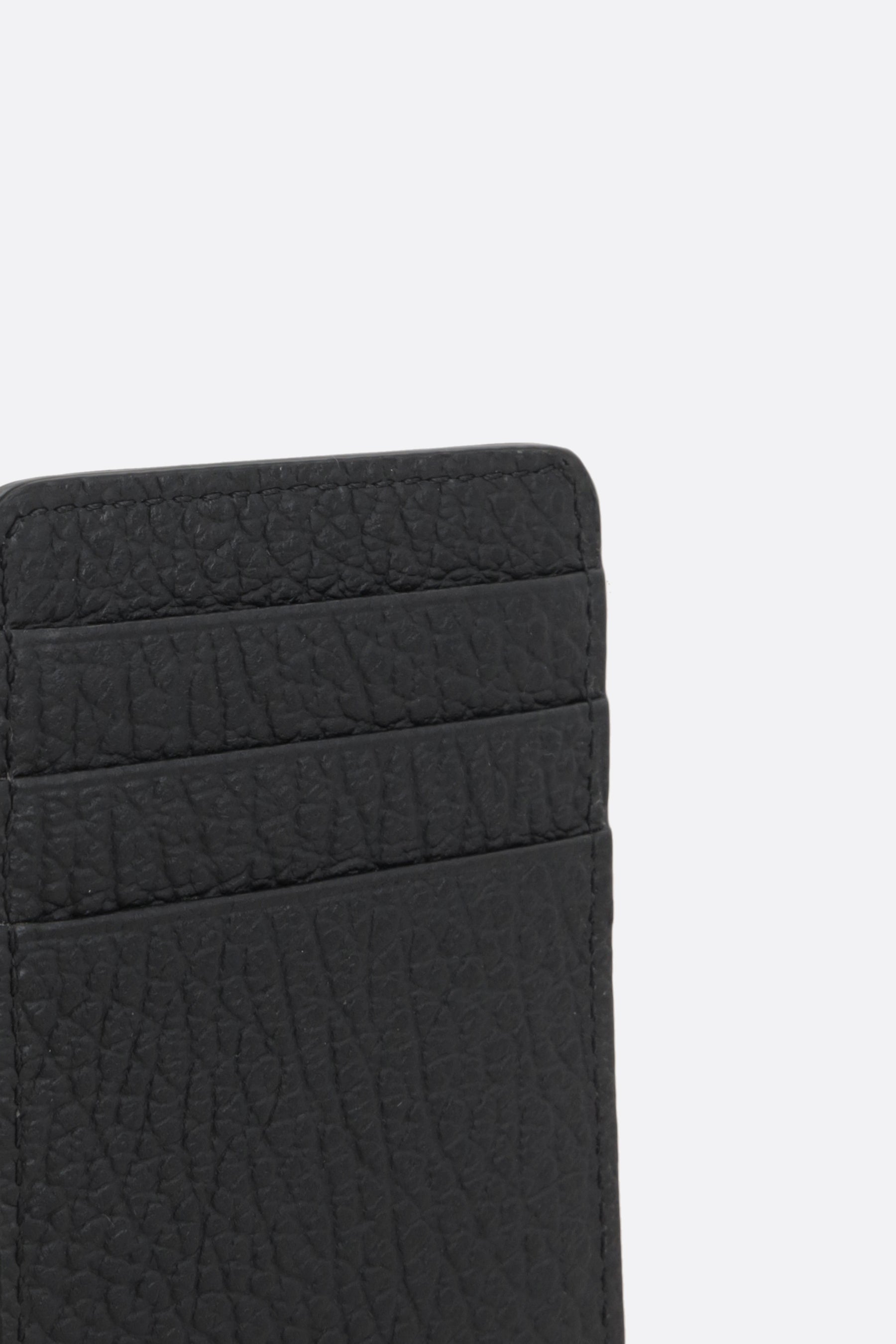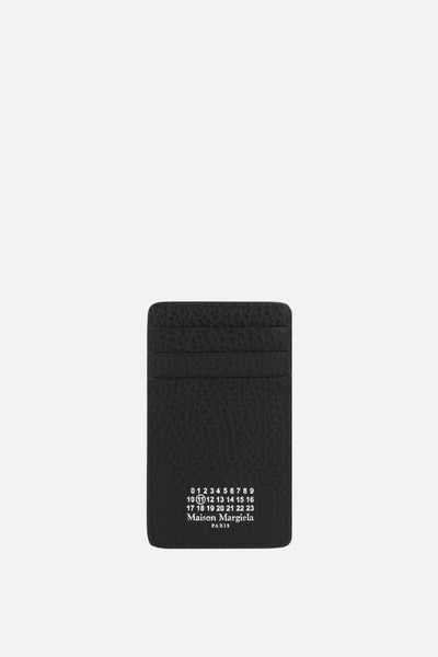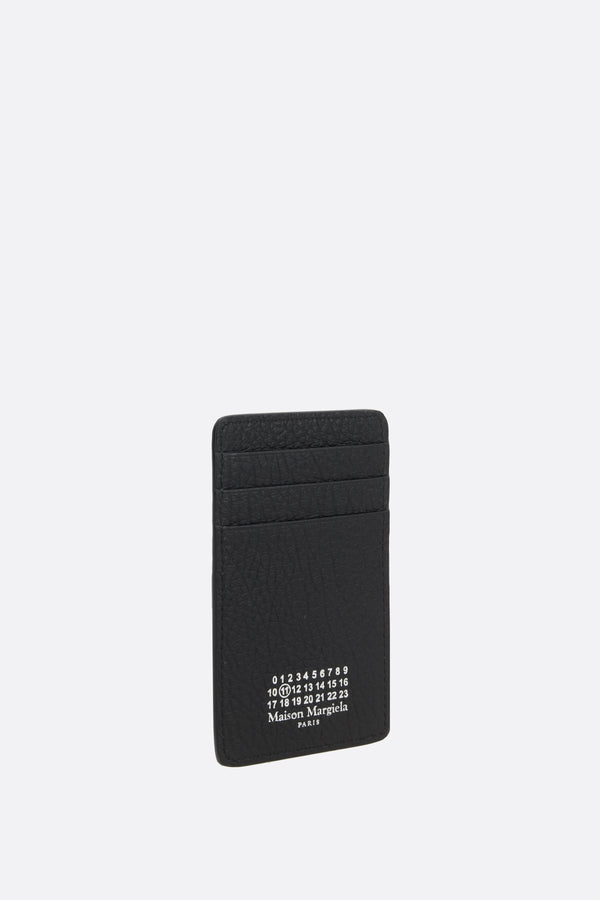 Maison Margiela credit card holder made of black grained leather with an embossed numeric logo on the front. The leather/fabric-lined interior features six card slots. The design is completed by Maison's signature stitching on the back.