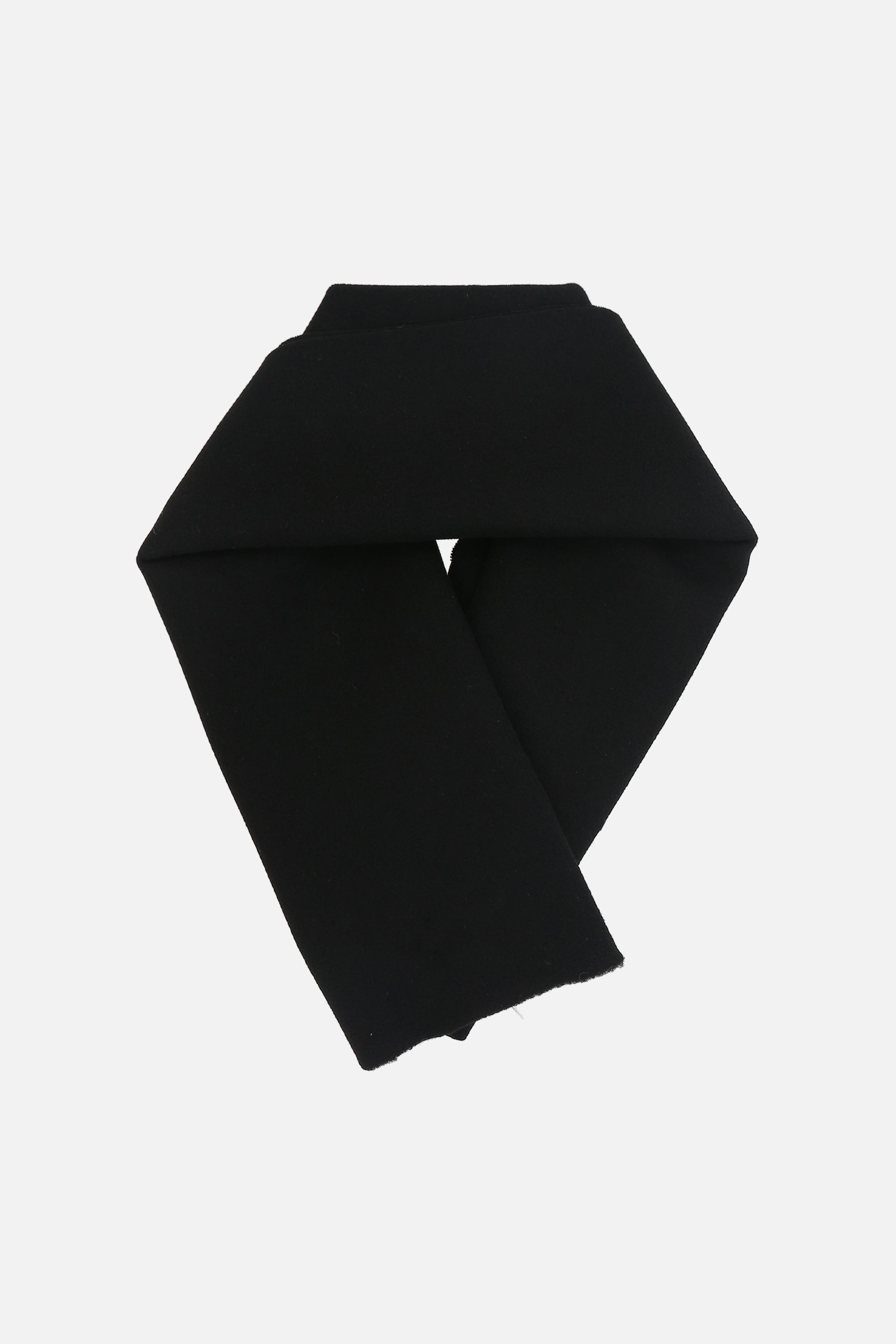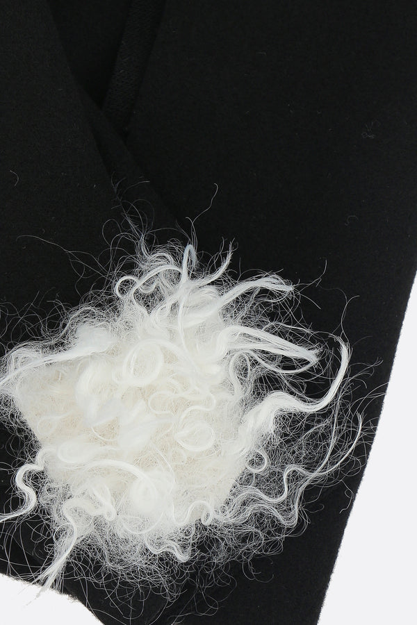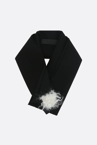 Maria Calderara collar made of cloth, featuring raw-cut edges, a snap button at the front, and a contrasting eco-shearling patch.