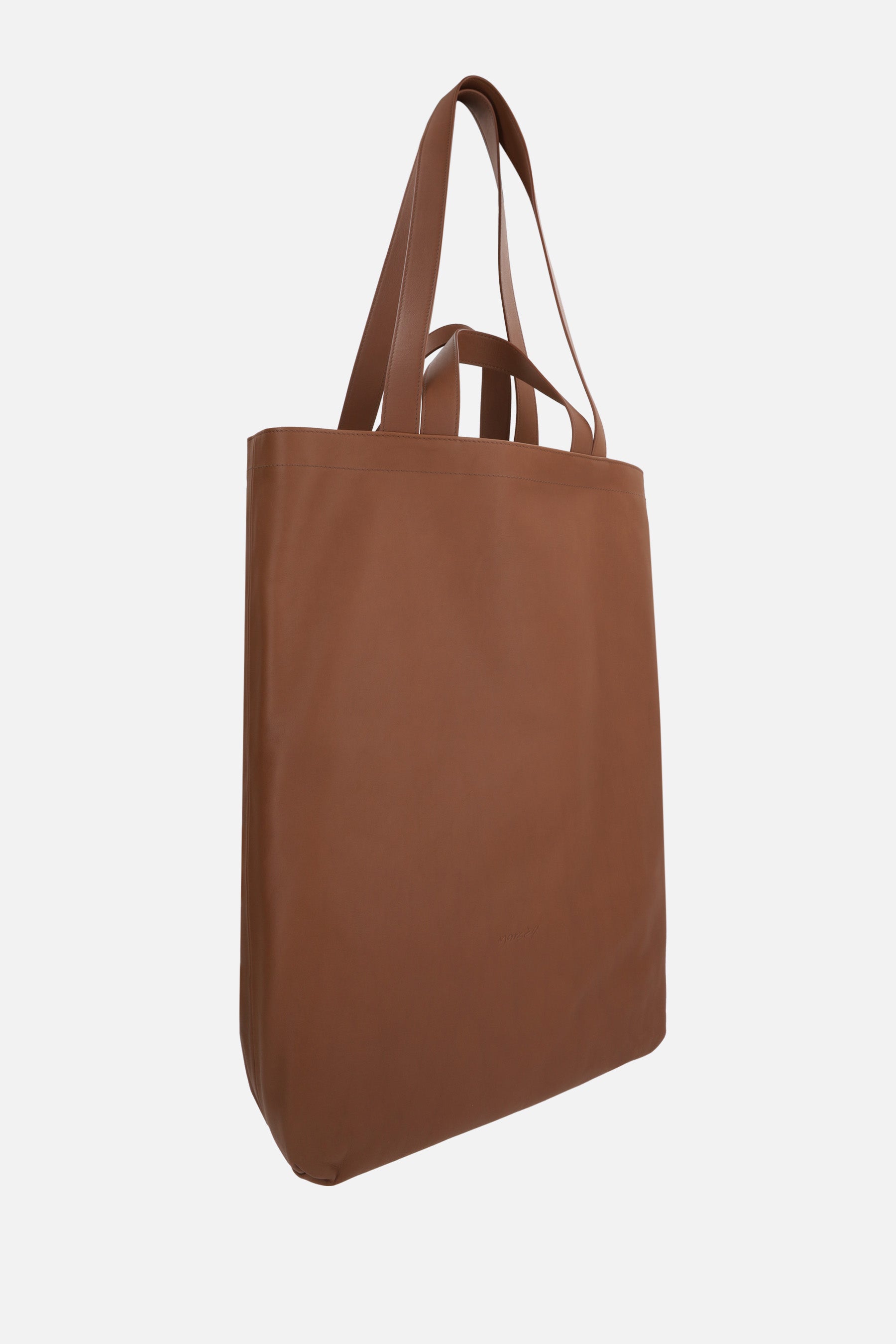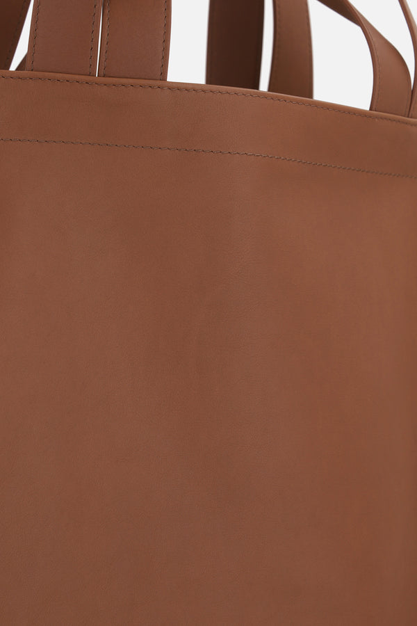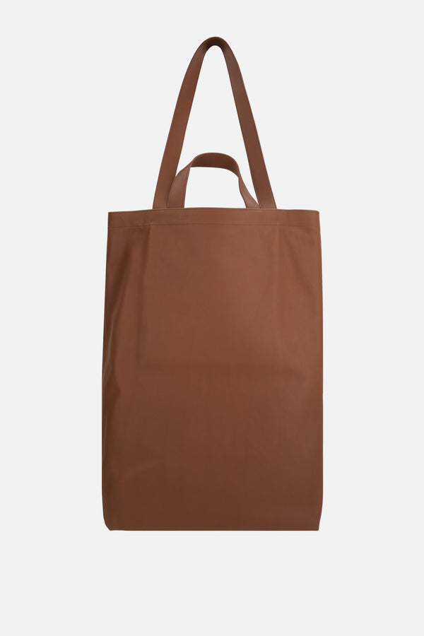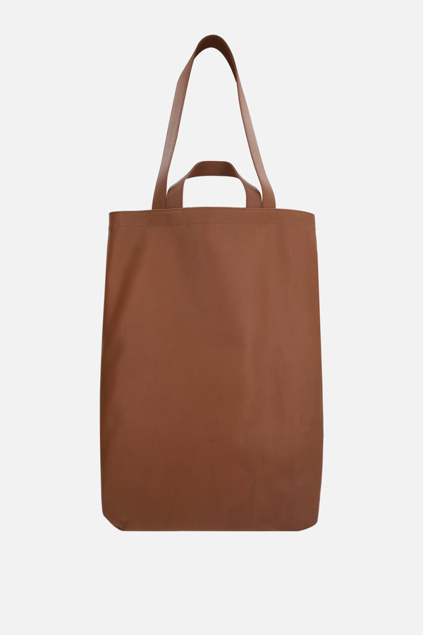 Marsèll shopping bag crafted from smooth tan-colored leather with embossed logo lettering. Featuring ruthenium-tone hardware, short handles, and long handles. The unlined interior includes a zip pocket.