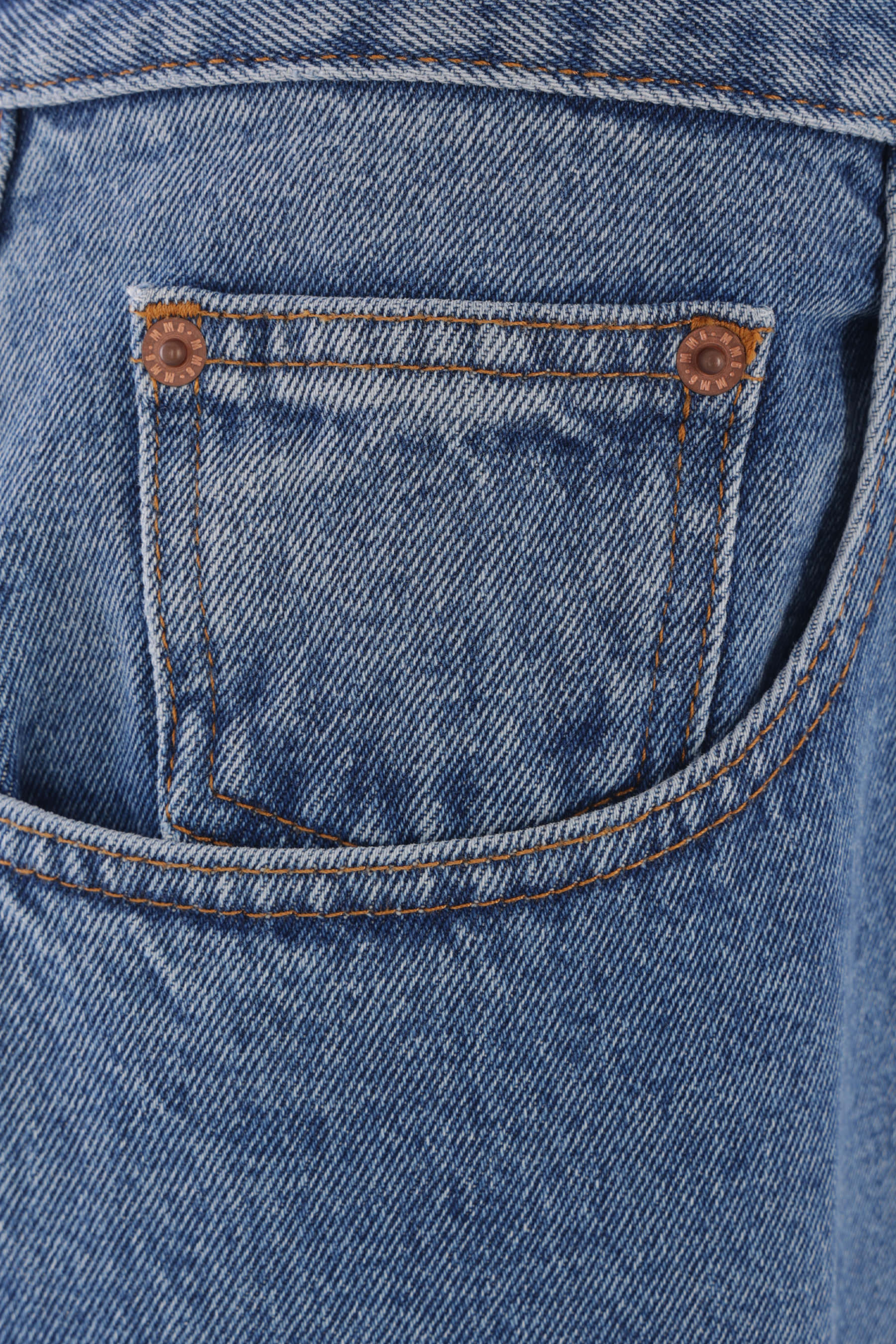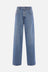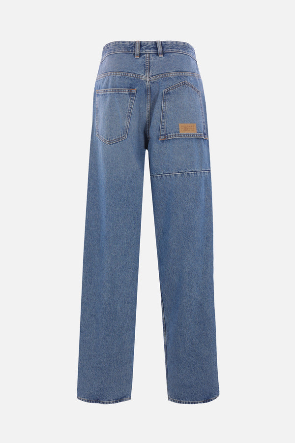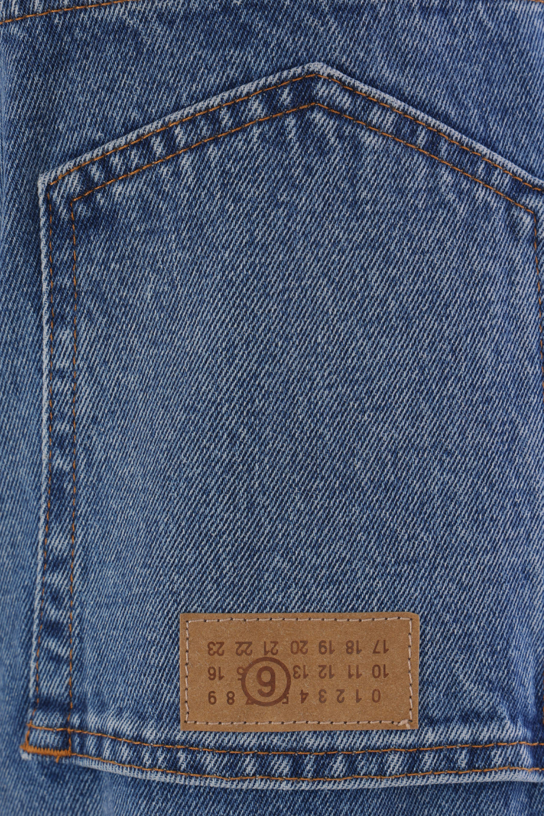 MM6 wide-leg jeans crafted in blue cotton denim, featuring a horizontal seam across the back of the leg. Designed with a front button and zip closure, belt loops, and five classic pockets. The design is completed by an inverted back pocket with numeric logo patch and the Maison's signature white stitching.