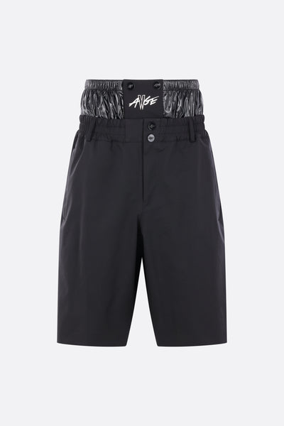 Moncler Genius oversized shorts made of black 4-way stretch nylon with a padded shiny nylon waist gaiter. Featuring an elasticated waistband, front closure with snap buttons and zip, belt loops, and multiple pockets. The design is completed by the iconic logo patch on the back. Collection 1 A$AP Rocky.