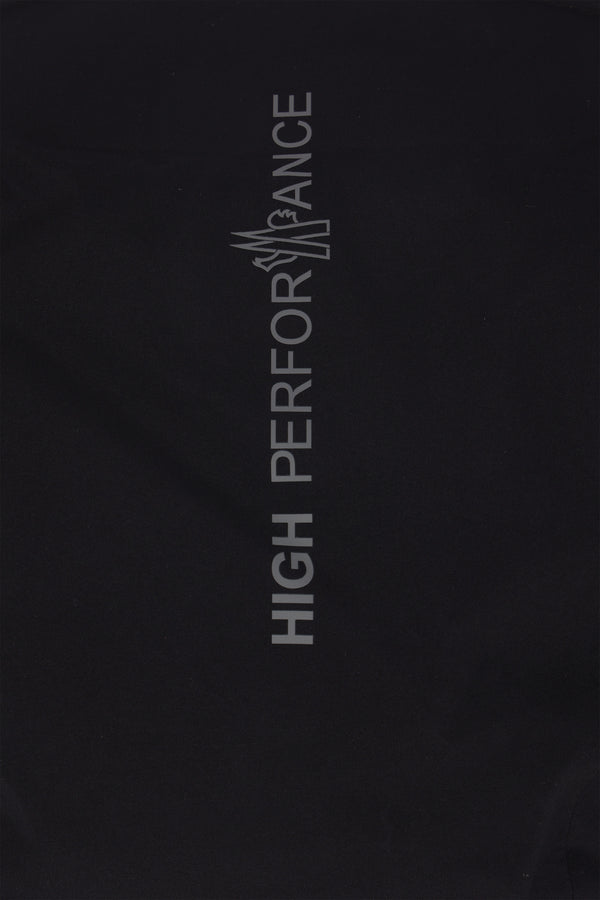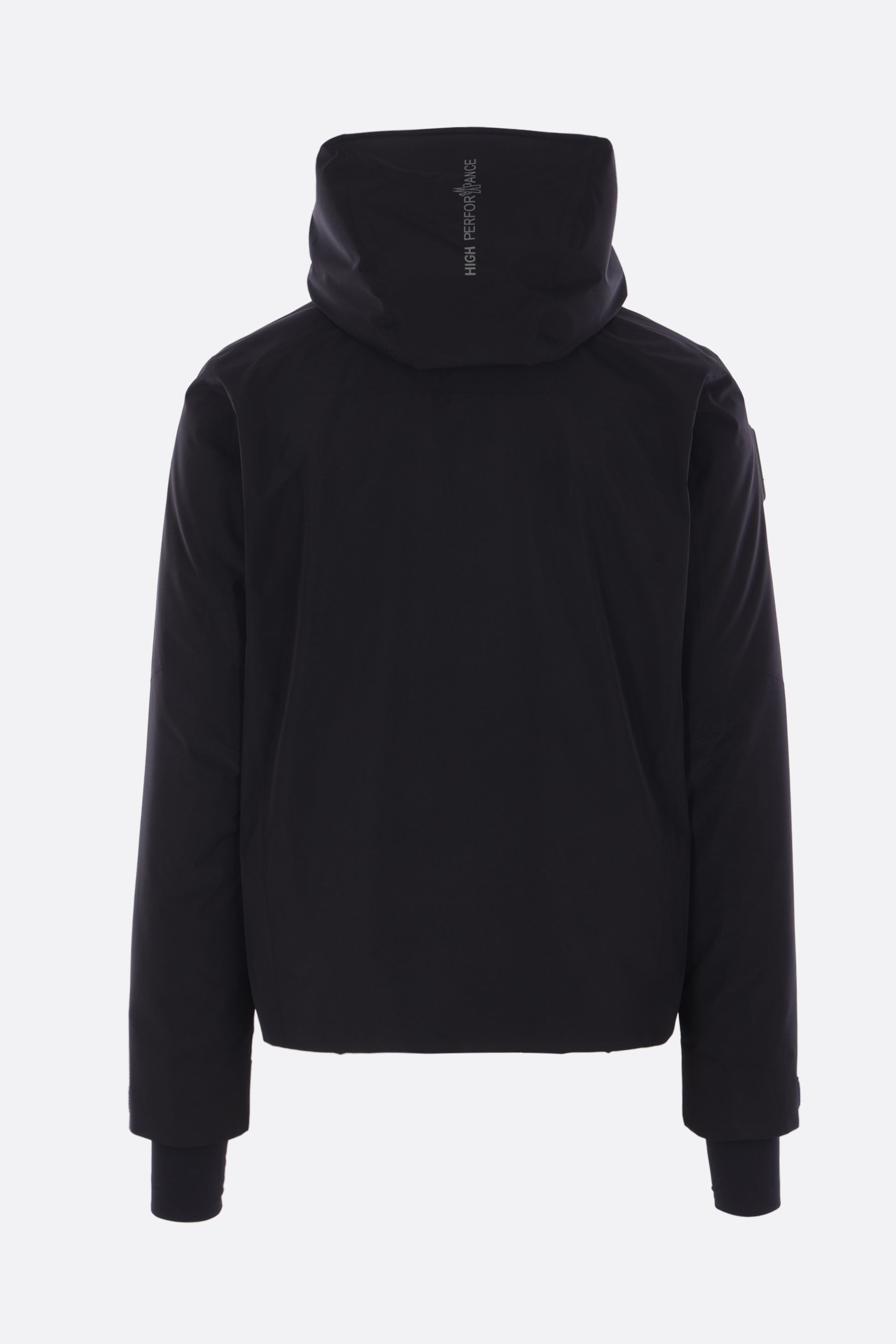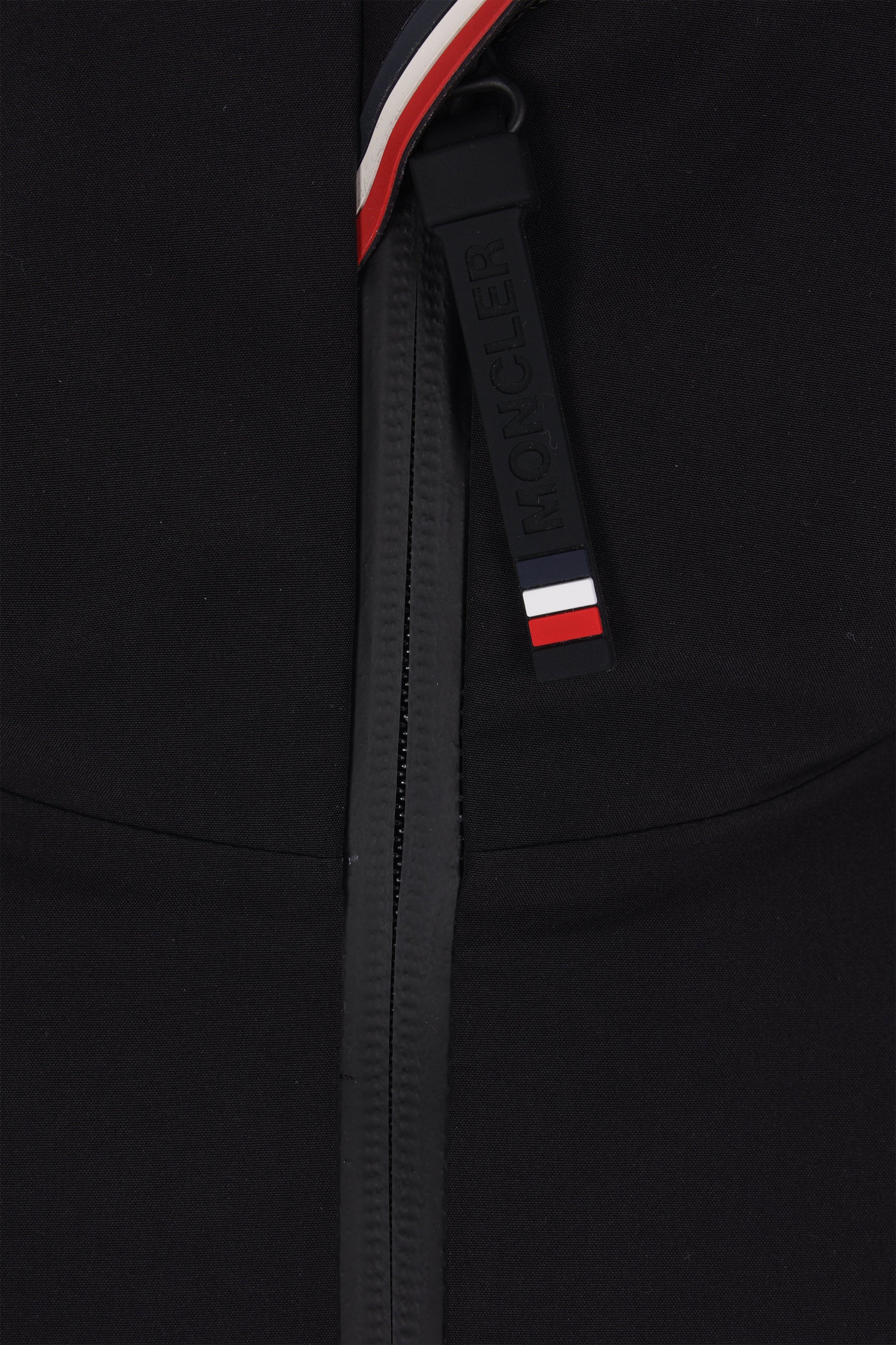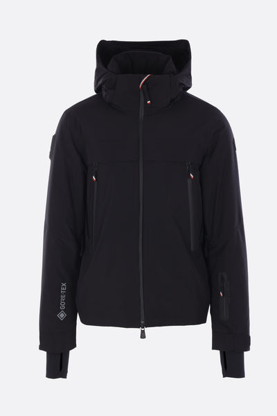 Moncler Grenoble ski down jacket made from black GORE-TEX fabric. Features a high collar, removable hood with drawstring and visor, double-slider zip front closure, multiple pockets, long sleeves, cuffs with stretch jersey gaiters, and straight hem with wind skirt. The design is completed with the iconic logo patch on the left sleeve.