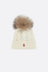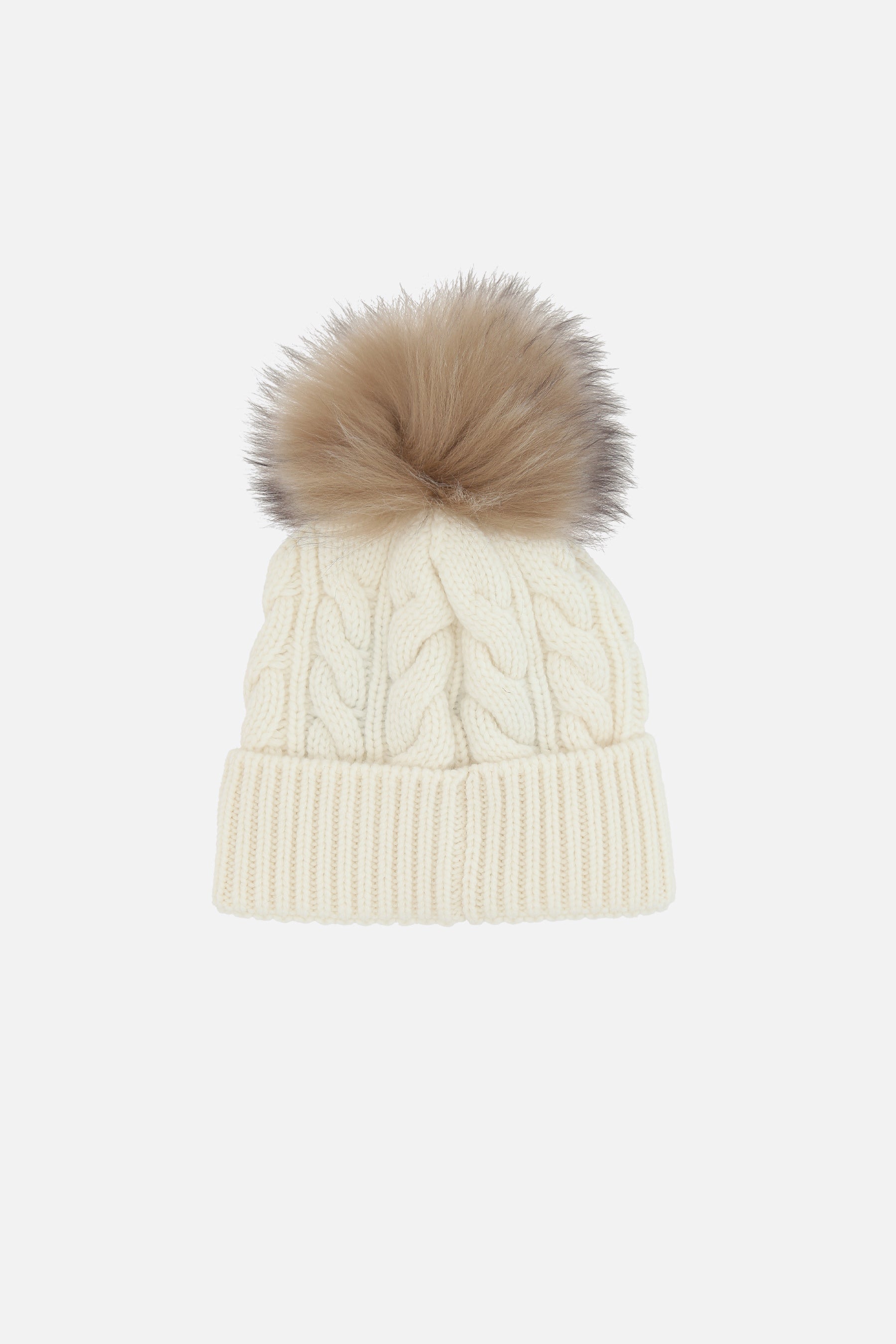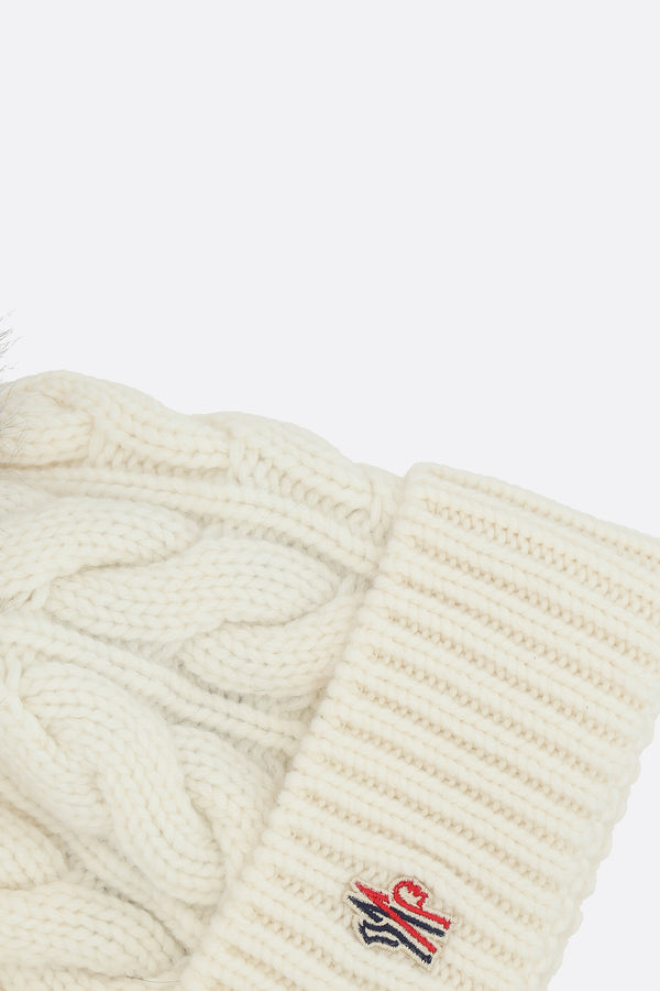 Moncler Grenoble beanie crafted from natural white cable-knit wool and cashmere with a ribbed cuff featuring a logo patch and a long-haired sheepskin pompom.