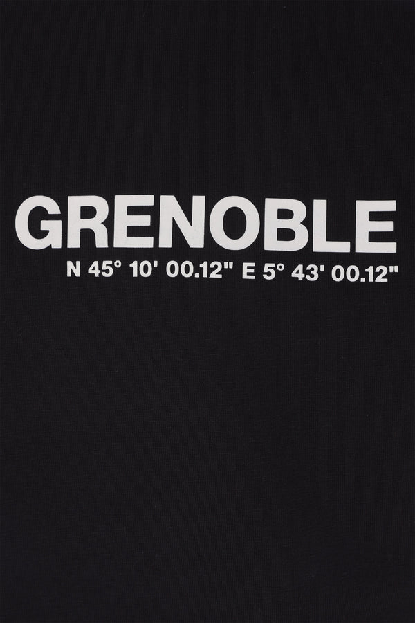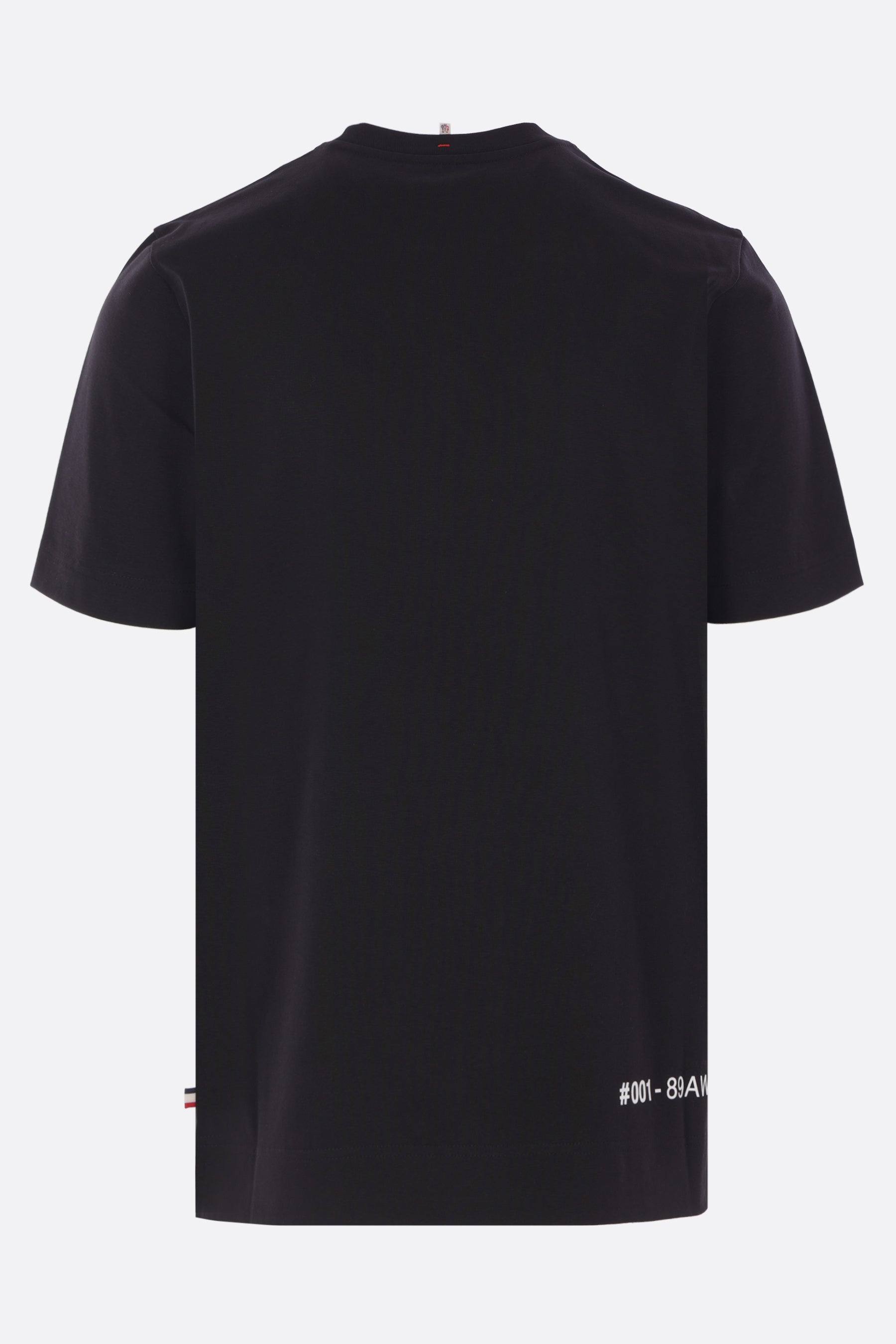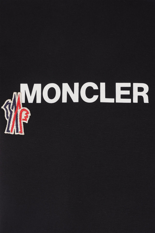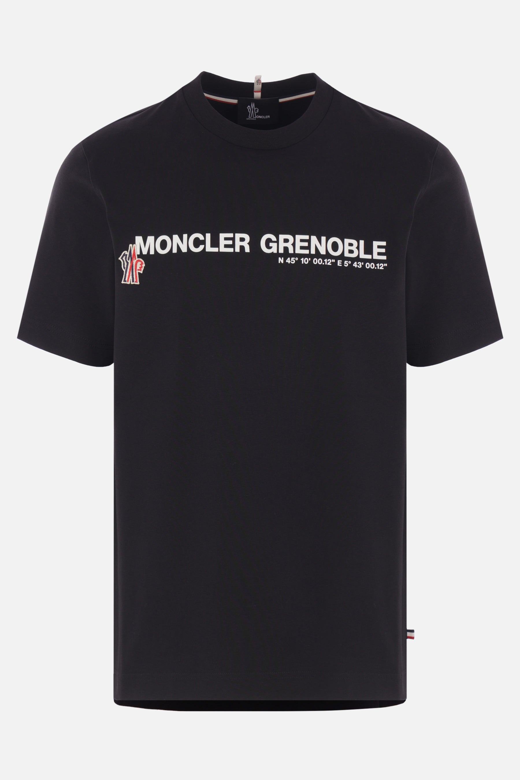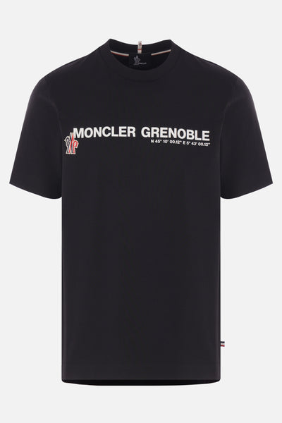 Moncler Grenoble t-shirt crafted from black stretch cotton jersey with logo lettering print on the chest. Featuring crew neckline, short sleeves, and straight hem longer at the back with side slits.