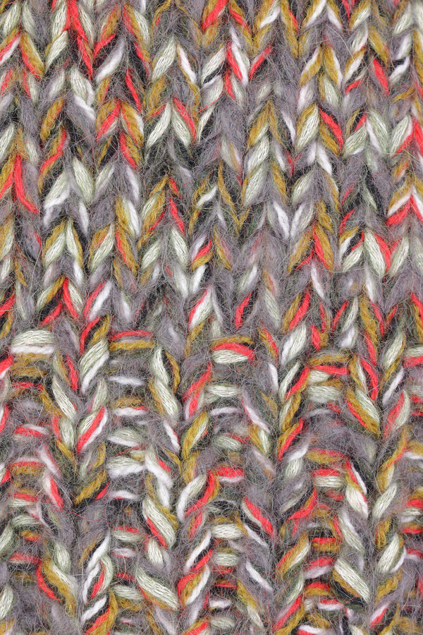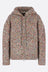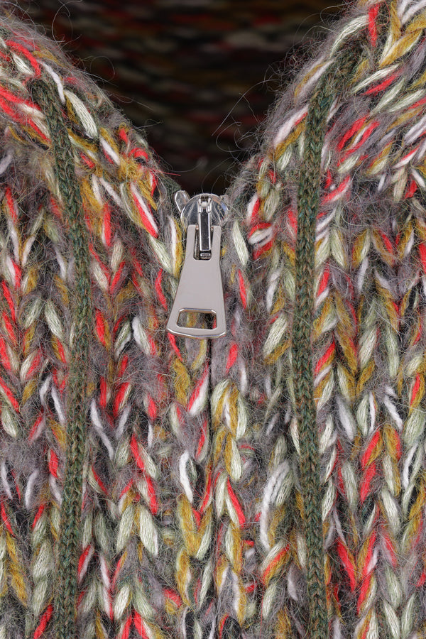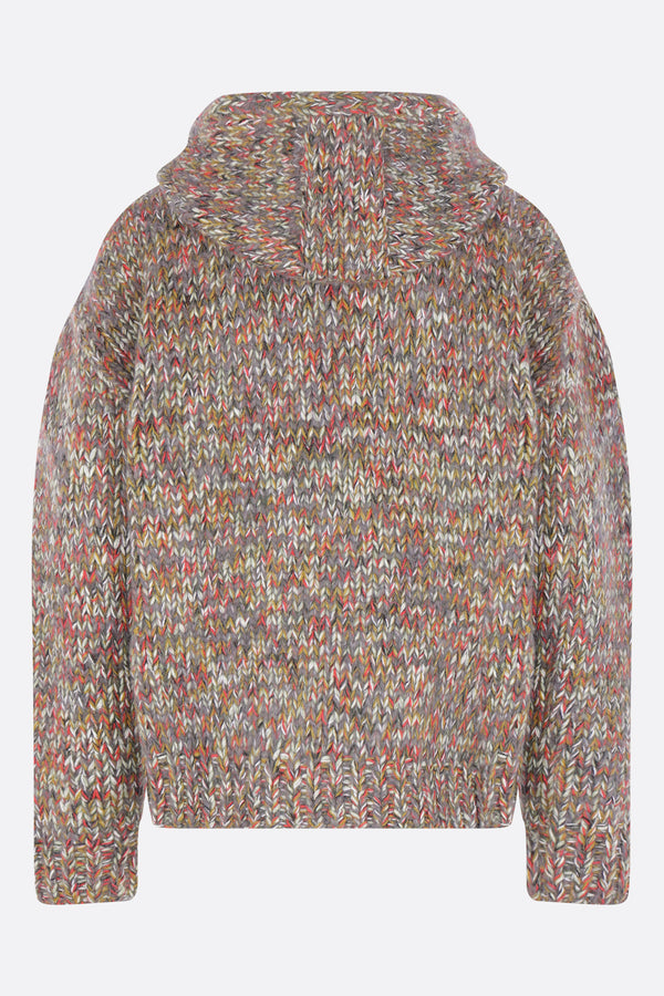 Namacheko cardigan made of green melange wool-blend knit. It features a drawstring hood, double-slider zip closure, kangaroo pockets, long sleeves, and ribbed edges.
