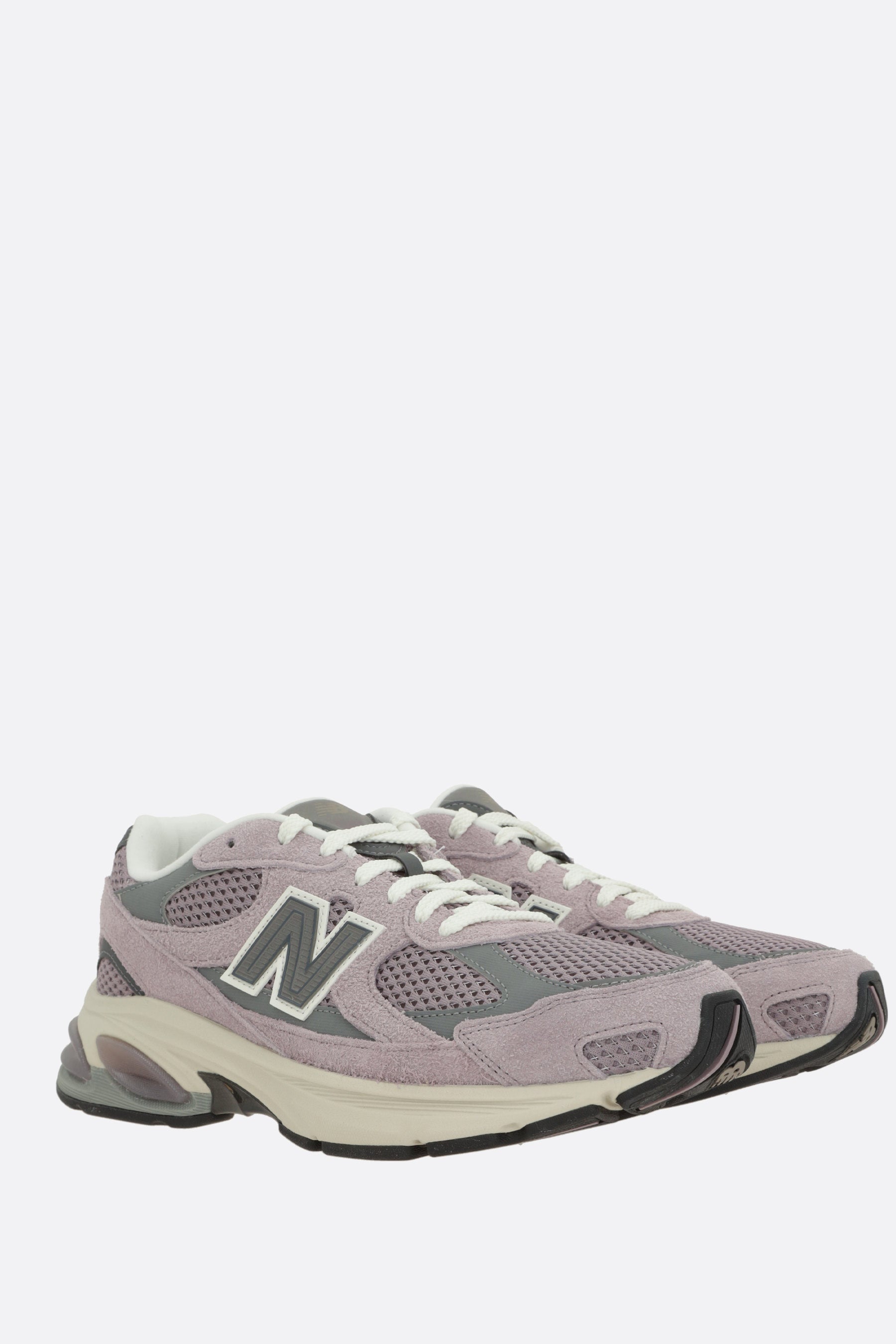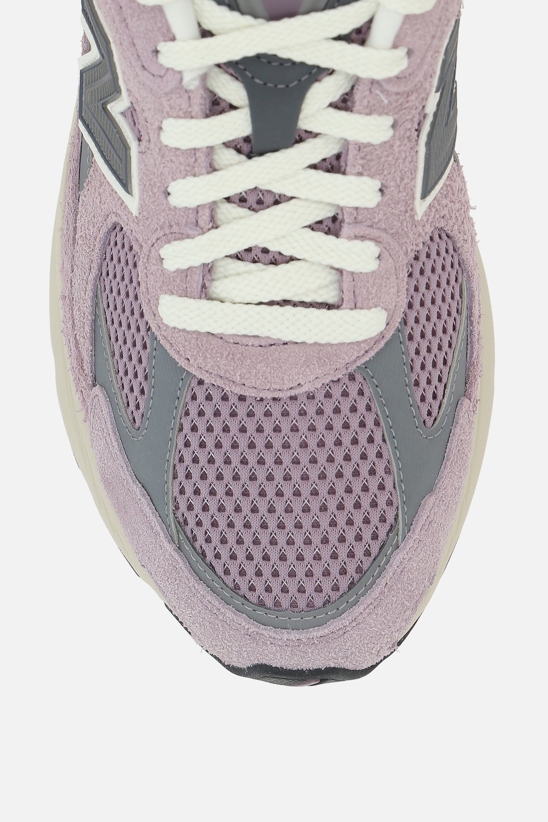 New Balance low-top sneakers crafted from lilac mesh and suede with reflective details. Featuring lace-up closure, round toe, fabric lining, ABZORB midsole, and rubber sole. The design is completed with reflective embroidered “N” patches on the sides and NB detailing on the heel and tongue.