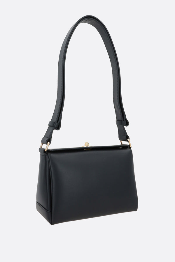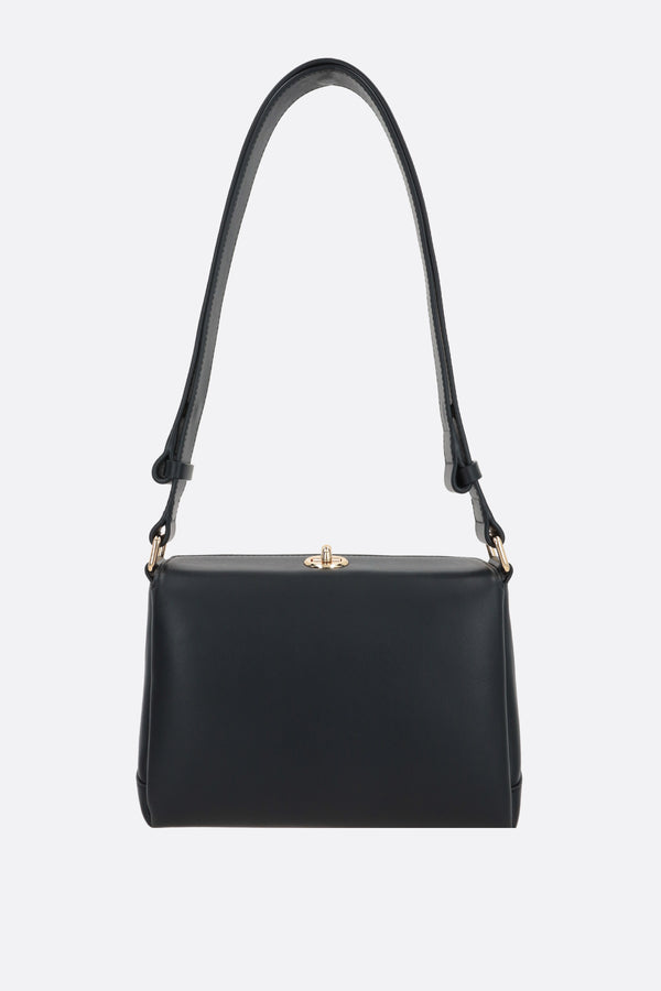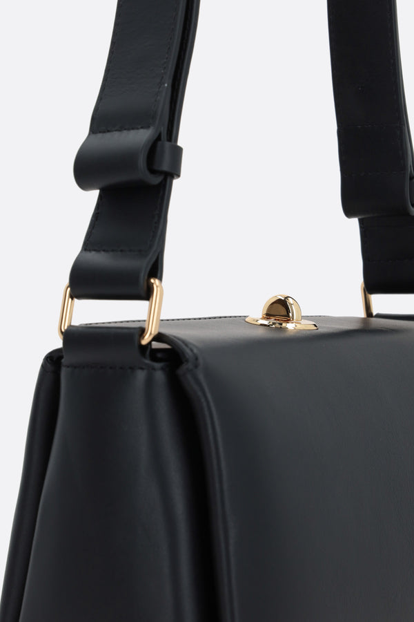Plan C shoulder bag crafted in black smooth leather. Features gold-tone hardware, twist-lock closure, and adjustable shoulder strap. The interior, lined in ecru fabric, includes three separate compartments and multiple pockets. The design is completed with protective metal feet and the logo printed under the flap.