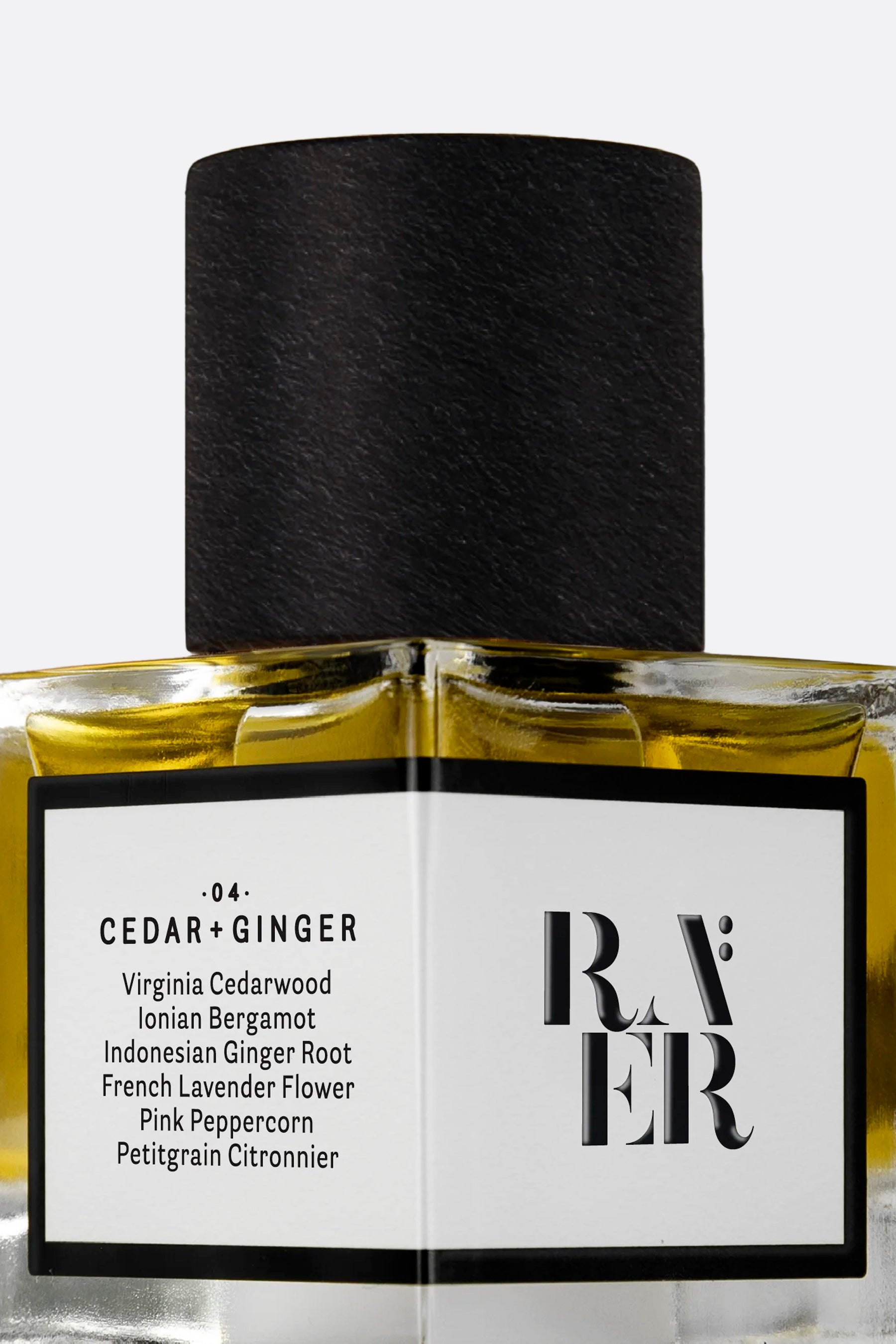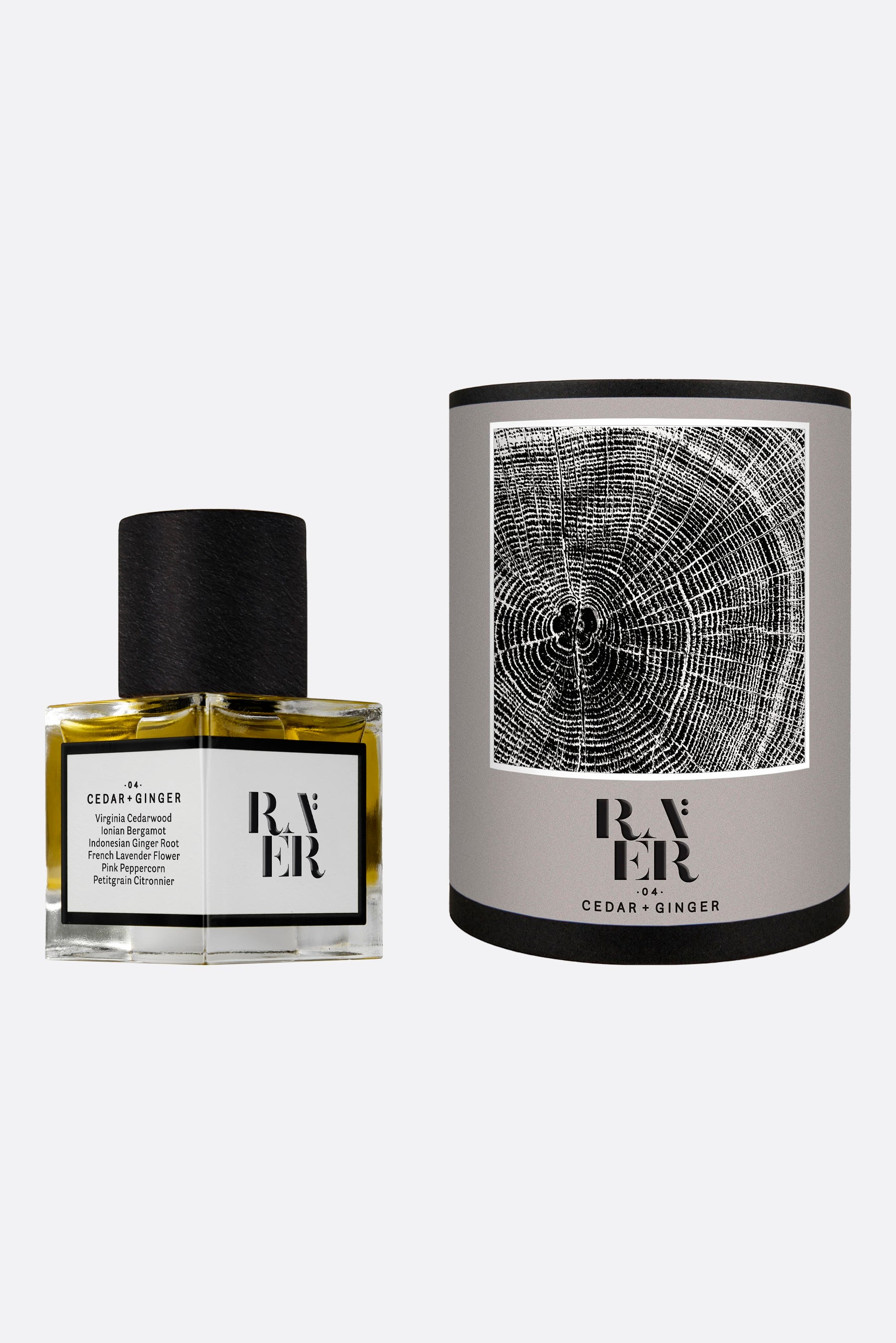 Raer 30 ml botanical parfum featuring the following fragrance notes: Virginia cedarwood, red buddhawood, ionian bergamot from Calabria, Indonesian ginger root, French lavender flower, pink peppercorn, and petitgrain citronnier.