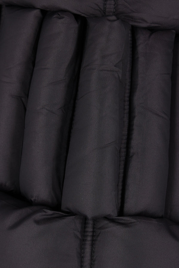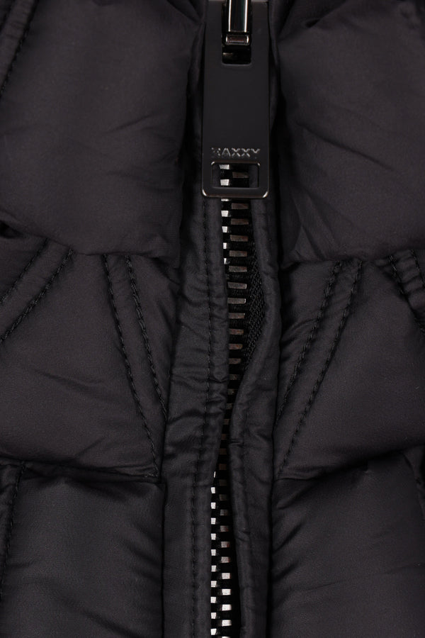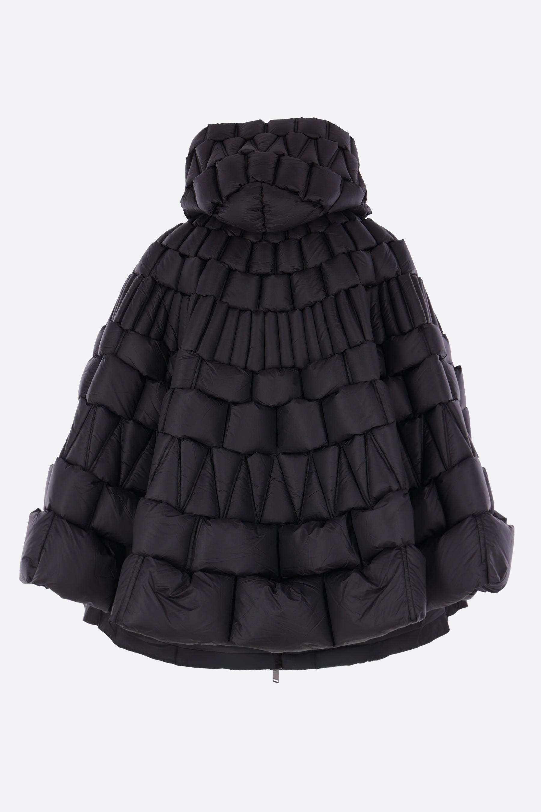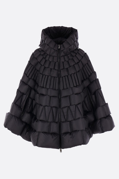Raxxy down-filled cape crafted from black nylon with a woven pattern. Featuring a high collar with hood, double-zip front closure, zippered arm openings, and a rounded hem.