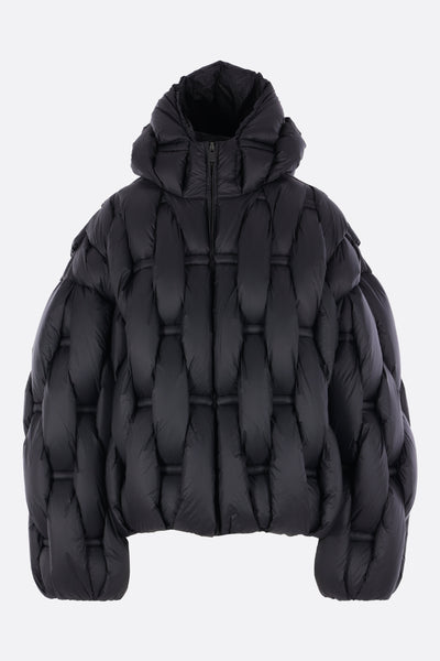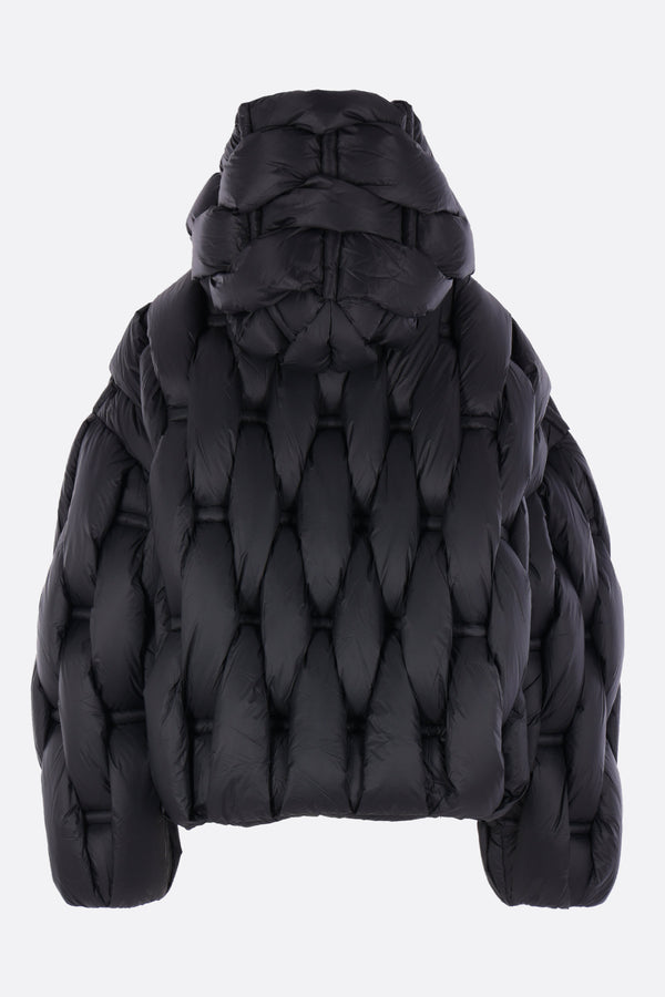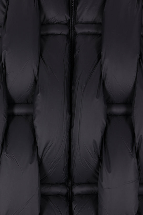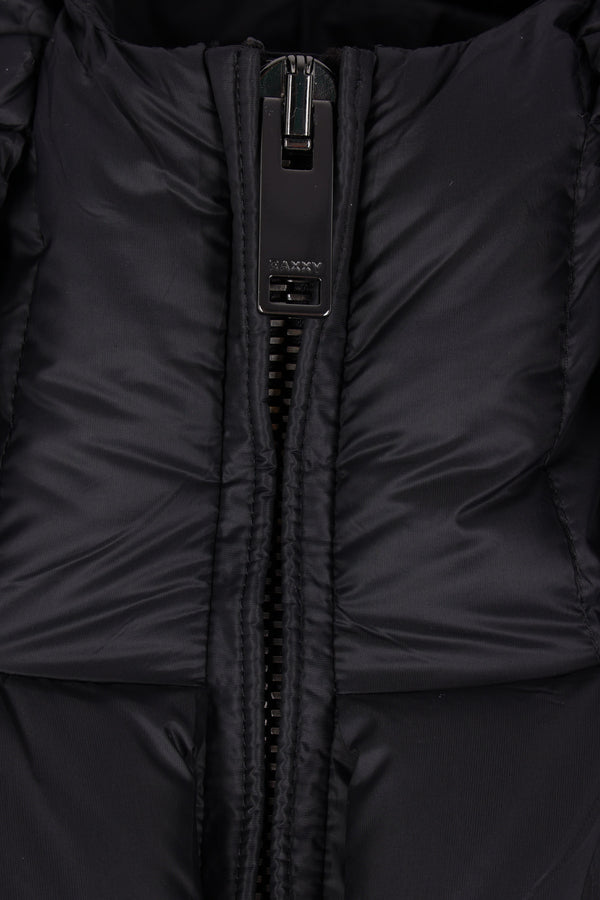 Raxxy down jacket crafted from black nylon with a woven pattern. Featuring a high collar with hood, front zip closure, concealed side pockets, long sleeves, and a straight hem with drawstring.