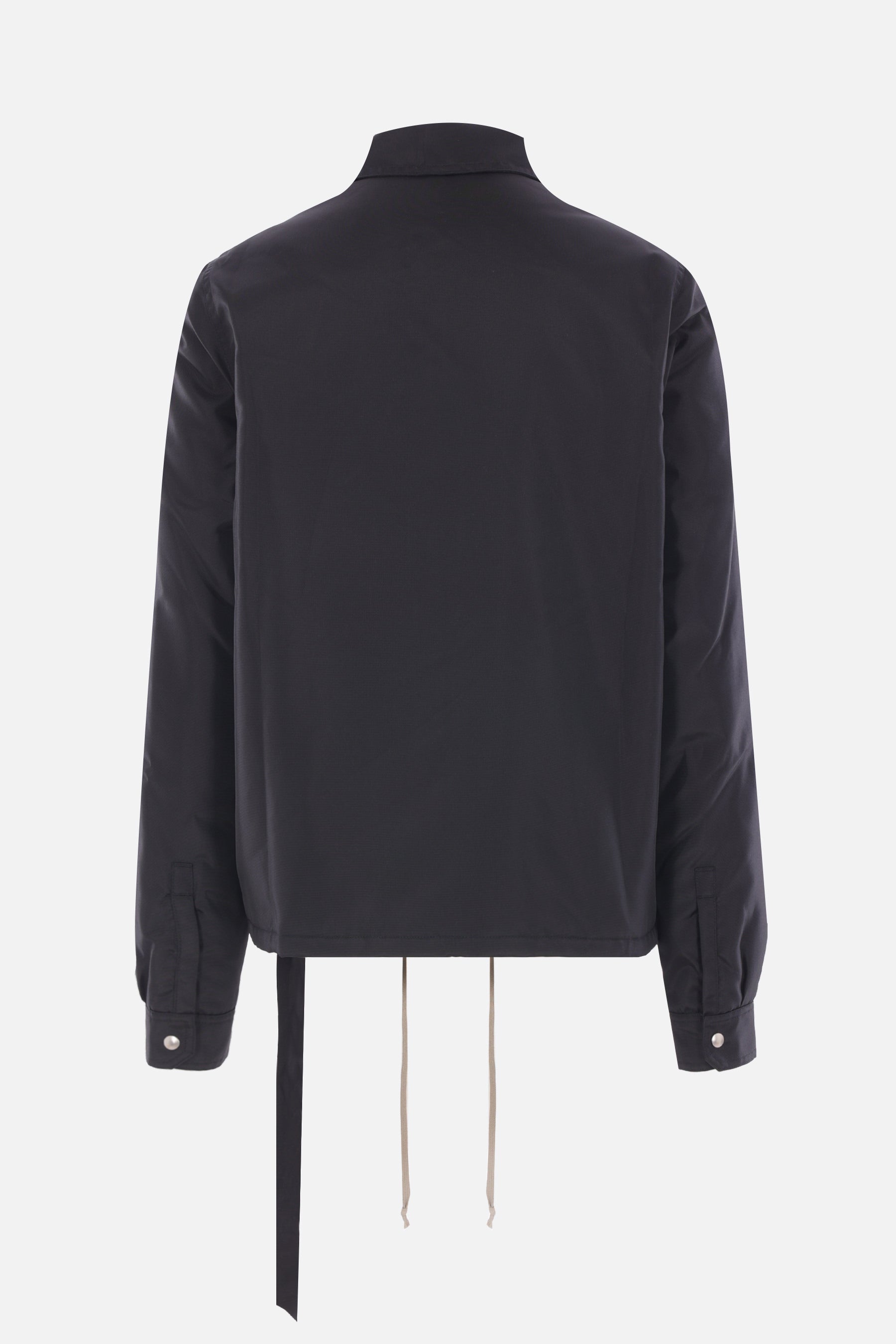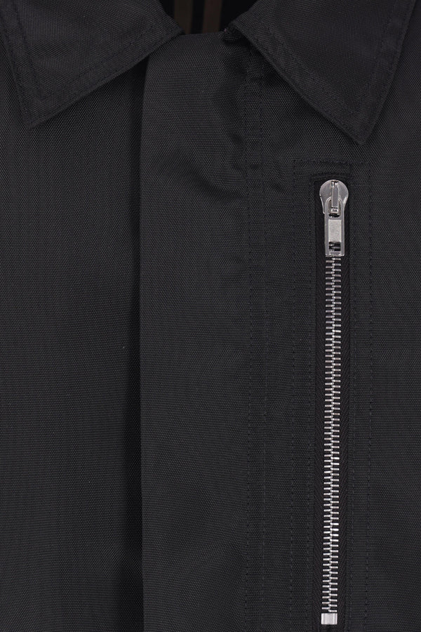 Rick Owens DRKSHDW lightly padded jacket crafted from black nylon. Featuring a pointed collar, concealed front zip fastening, zippered pockets, long sleeves with buttoned cuffs, and a straight hem with drawstring. The design is completed with tone-on-tone logo tape.