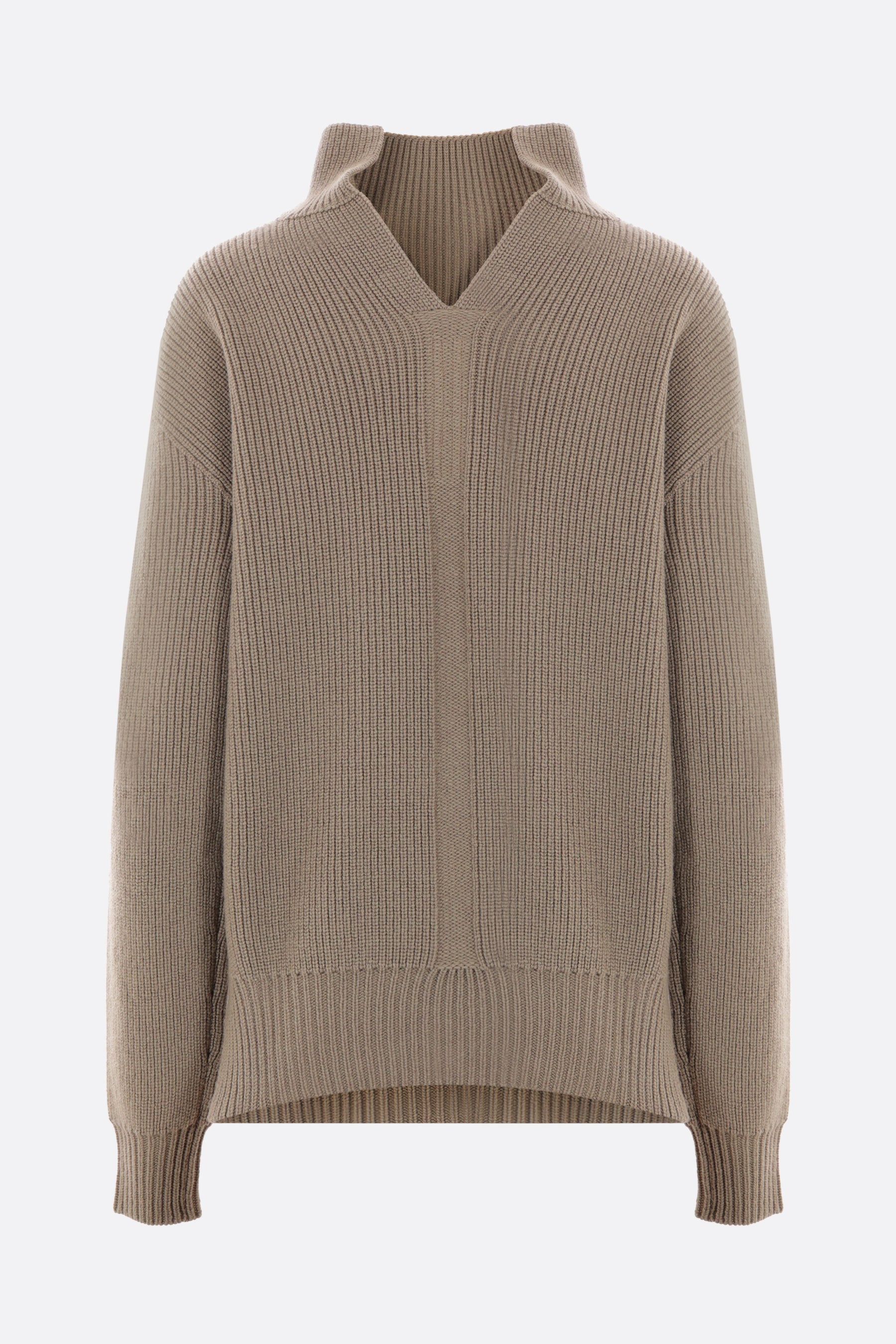 Rick Owens' pullover crafted in dust grey ribbed-knit wool. It features high neck with back V-neckline, long sleeves and straight hem with small side slits.