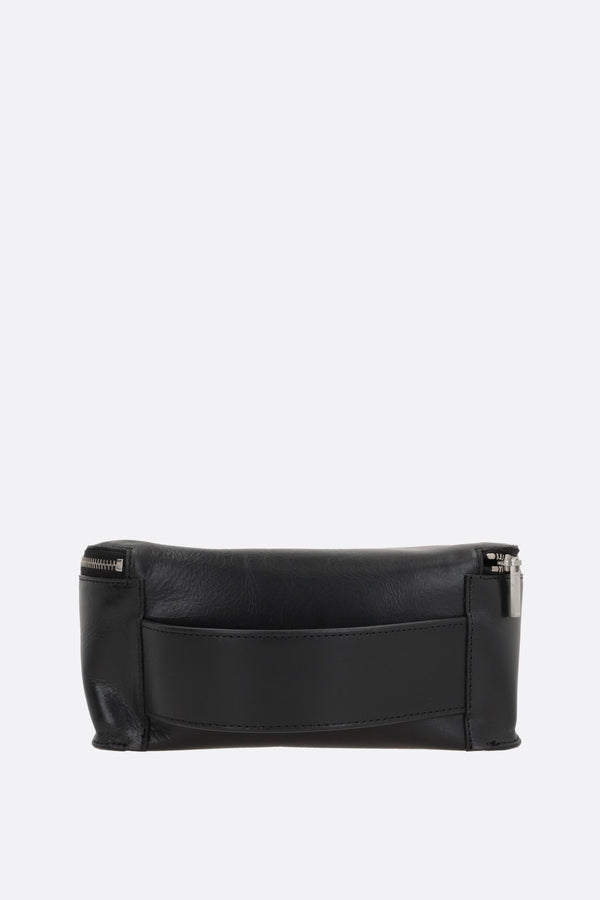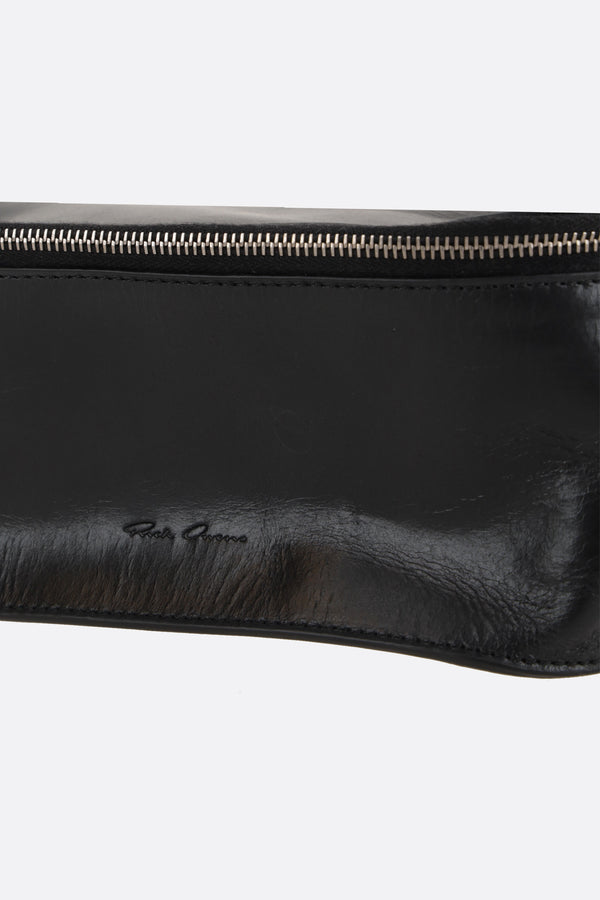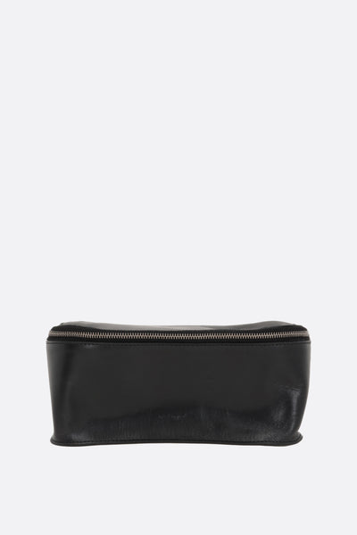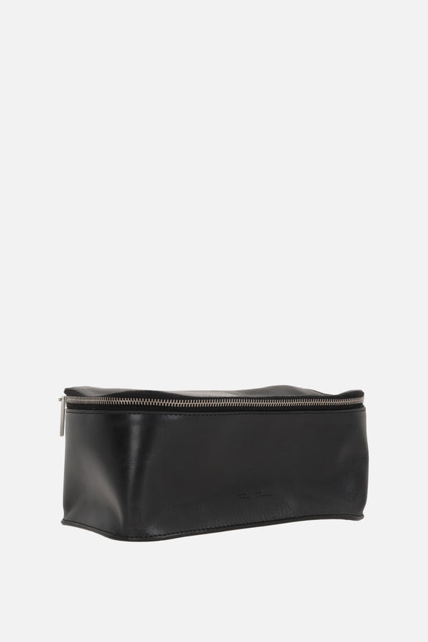 Rick Owens beauty case made of smooth black leather with embossed logo lettering on the front. Featuring silver-tone hardware, zip closure, and flat handle. Unlined interior.