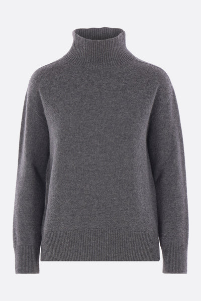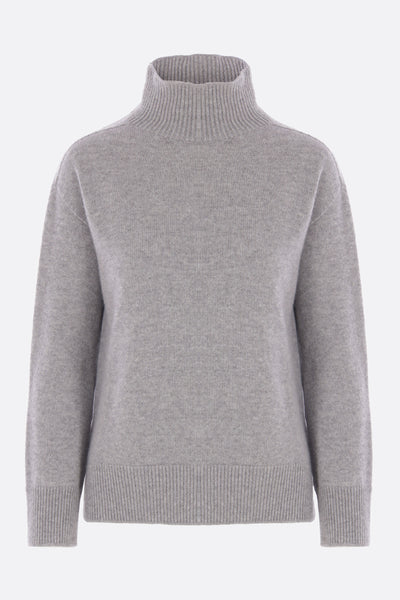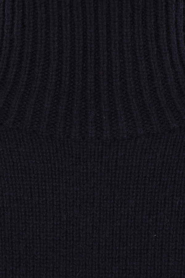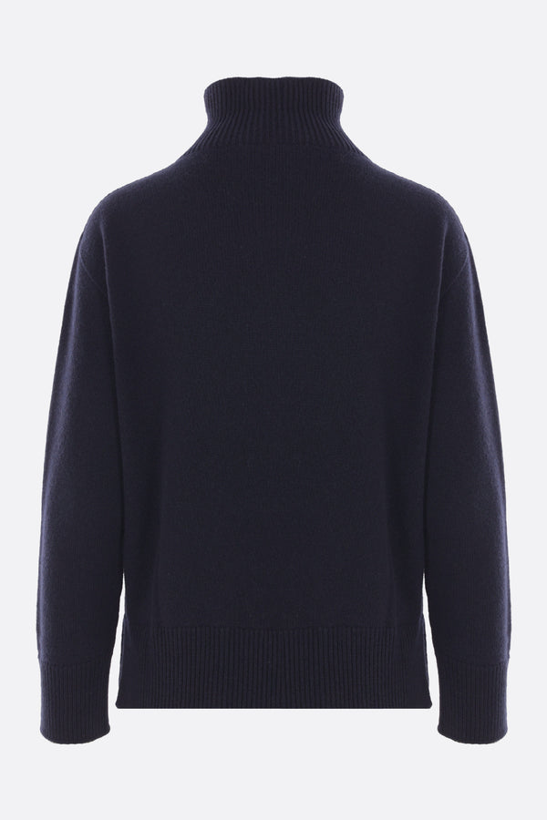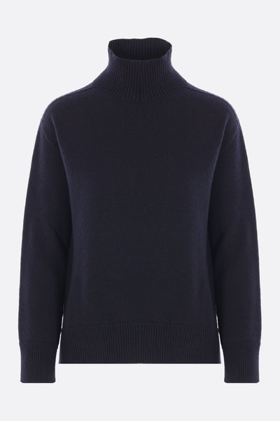 'S Max Mara sweater made of blue cashmere knit. Featuring a mock neck, long sleeves, ribbed trims, and a straight hem with side slits.