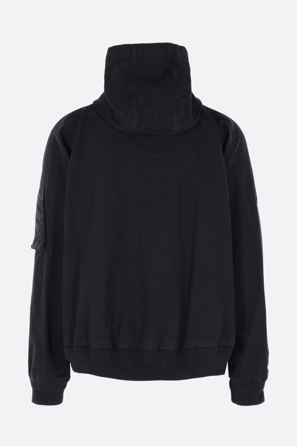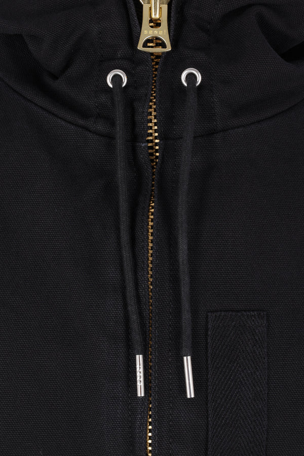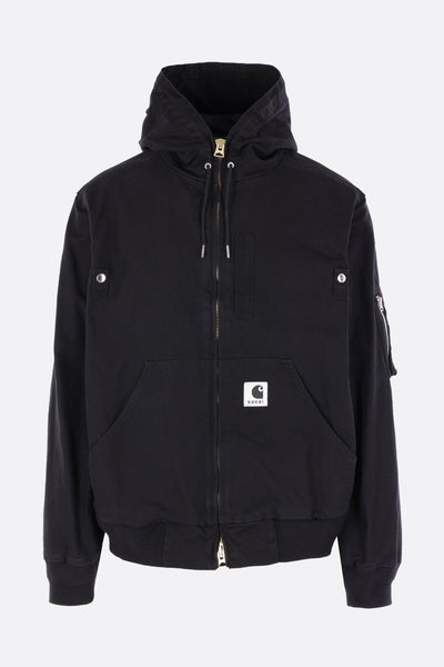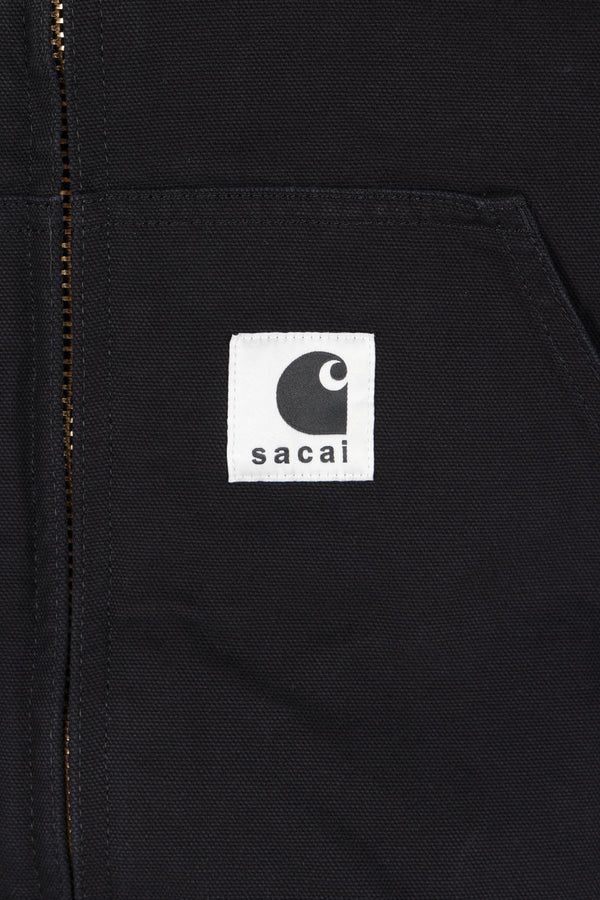 Sacai x Carhartt WIP jacket crafted from black cotton canvas with front-applied Sacai/Carhartt logo patch. Featuring hood with drawstring, double-zip front closure, kangaroo pockets, long sleeves, ribbed knit edges, and unlined interior. The design is completed by a cargo pocket on the left sleeve.