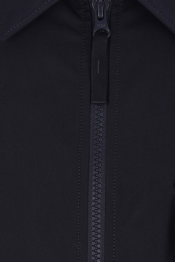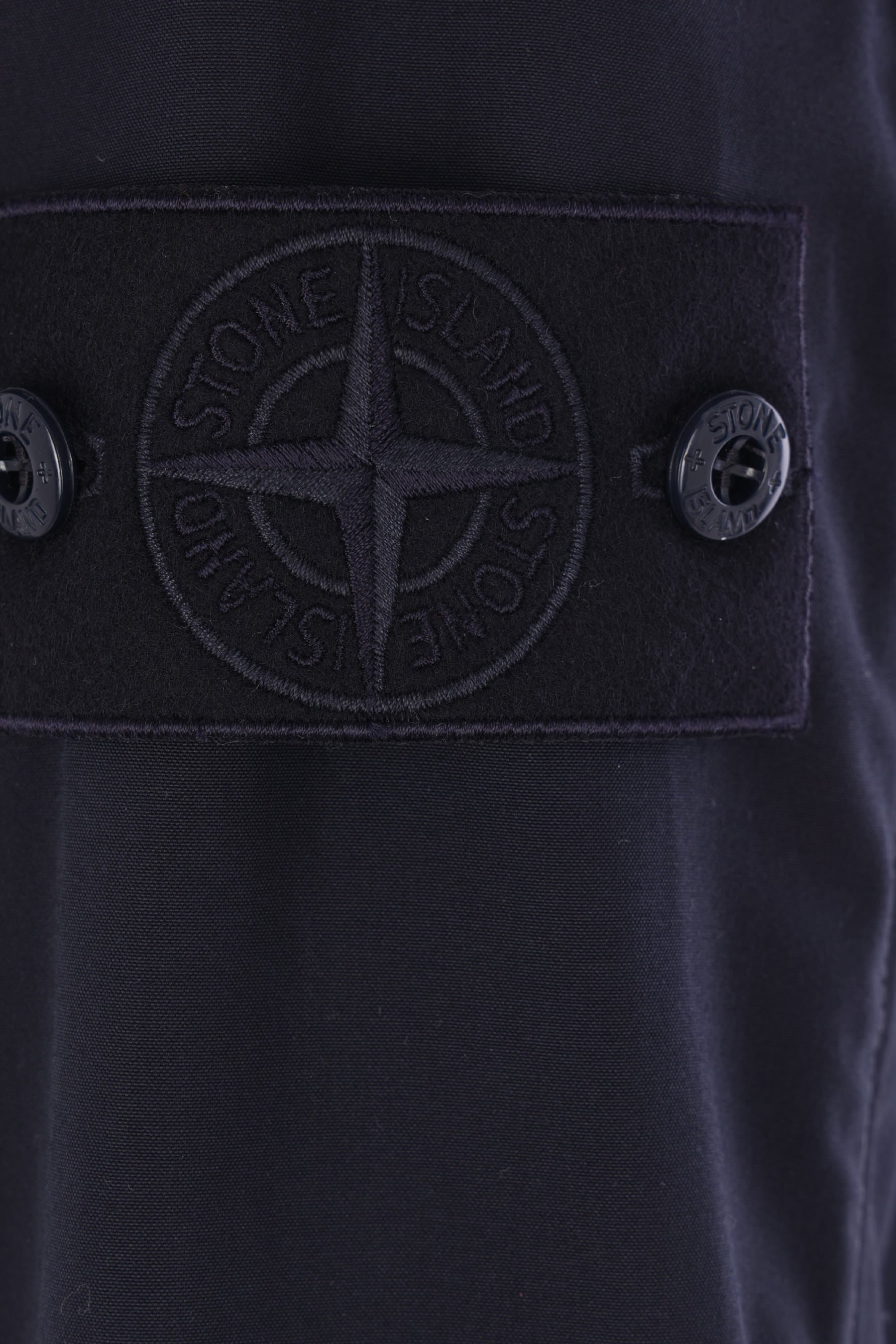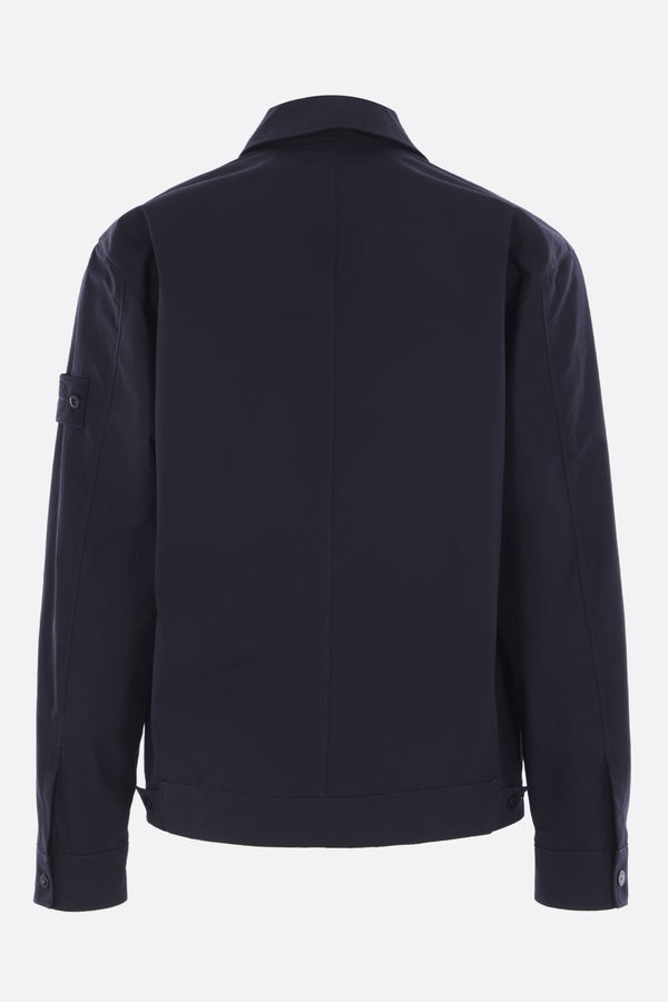Stone Island overshirt made of blue cotton canvas. Featuring a pointed collar, front double-slider zip closure, multiple pockets, long sleeves with buttoned cuffs, and a straight hem with adjustable side tabs and elastic band. Unlined interior. The design is completed by the iconic removable logo badge.