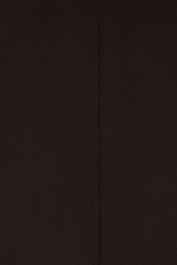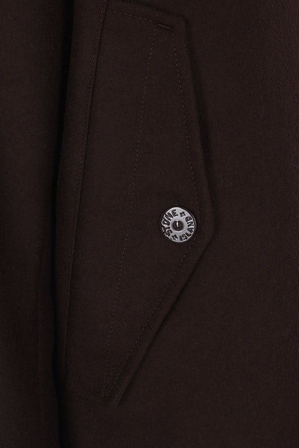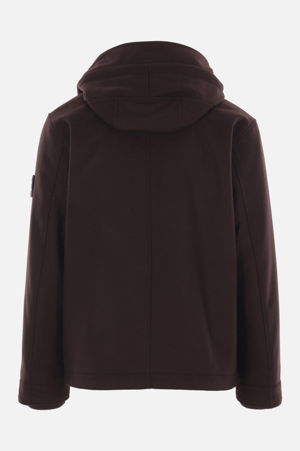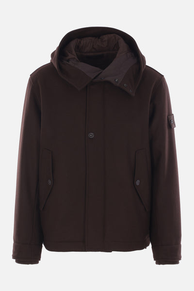 Stone Island padded parka crafted from dark brown wool flannel and nylon, featuring a removable logo badge. Designed with a high collar, hood with drawstring, two-way zip and snap-button front closure, flap pockets, long sleeves with ribbed cuffs, straight hem with drawstring, and quilted interior.