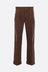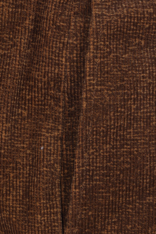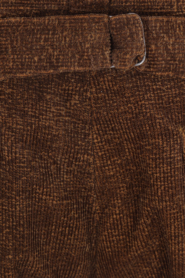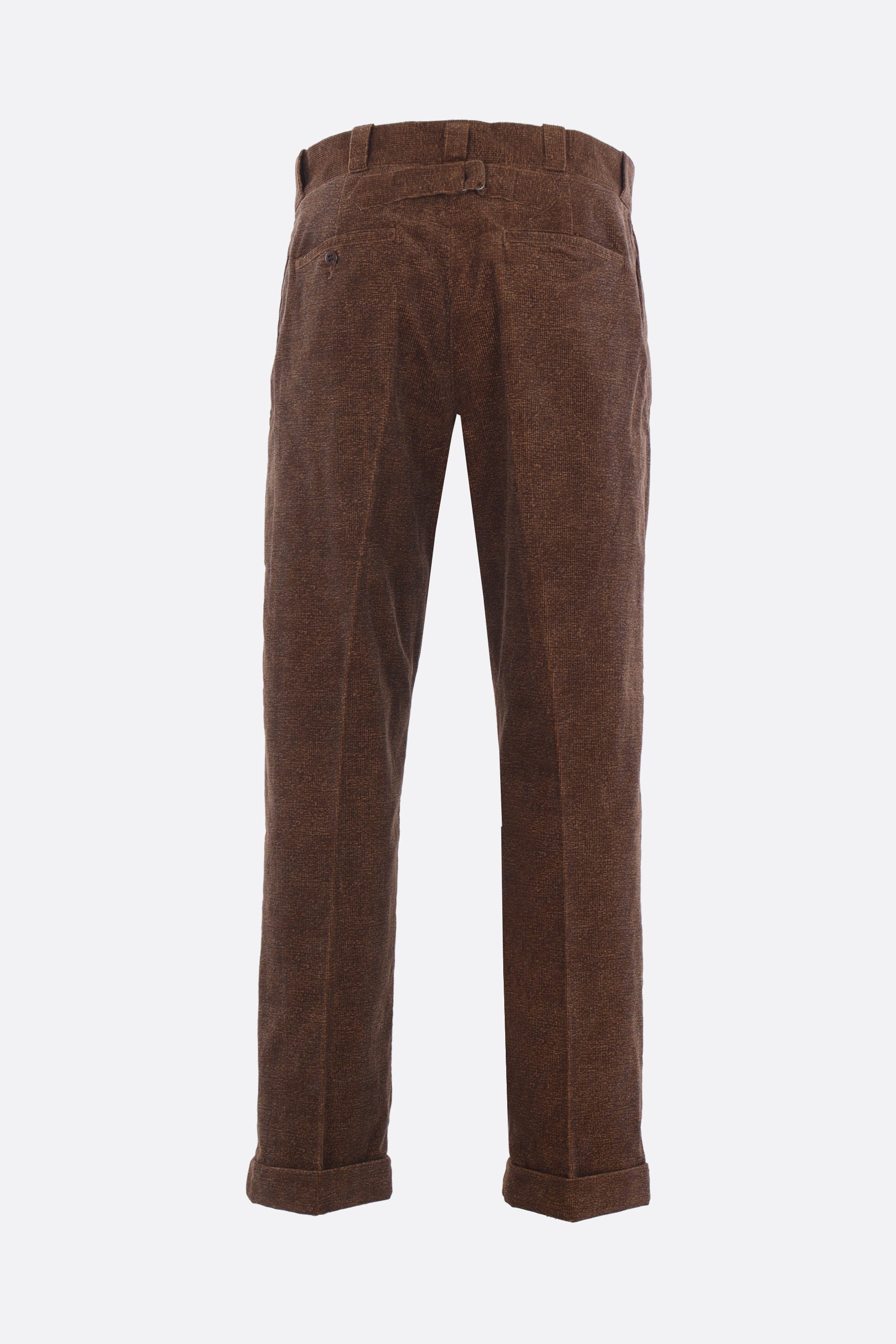 Taiga Takahashi trousers made of brown mélange corduroy with a tweed-effect print. Featuring front button closure, belt loops, multiple pockets, double pleats, center crease, back martingale, and cuffed hems. Unlined interior.