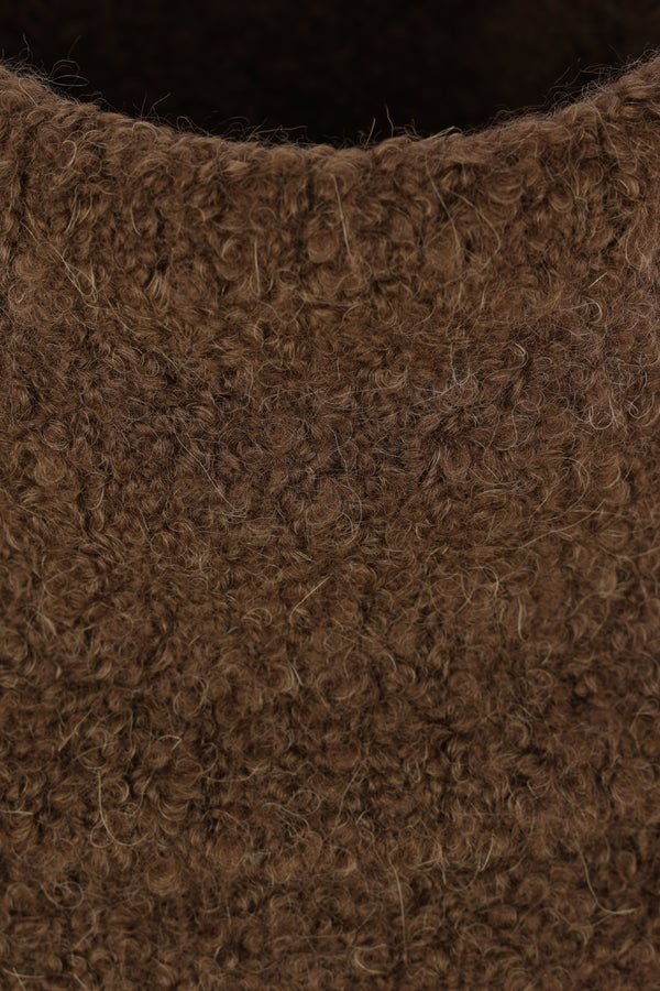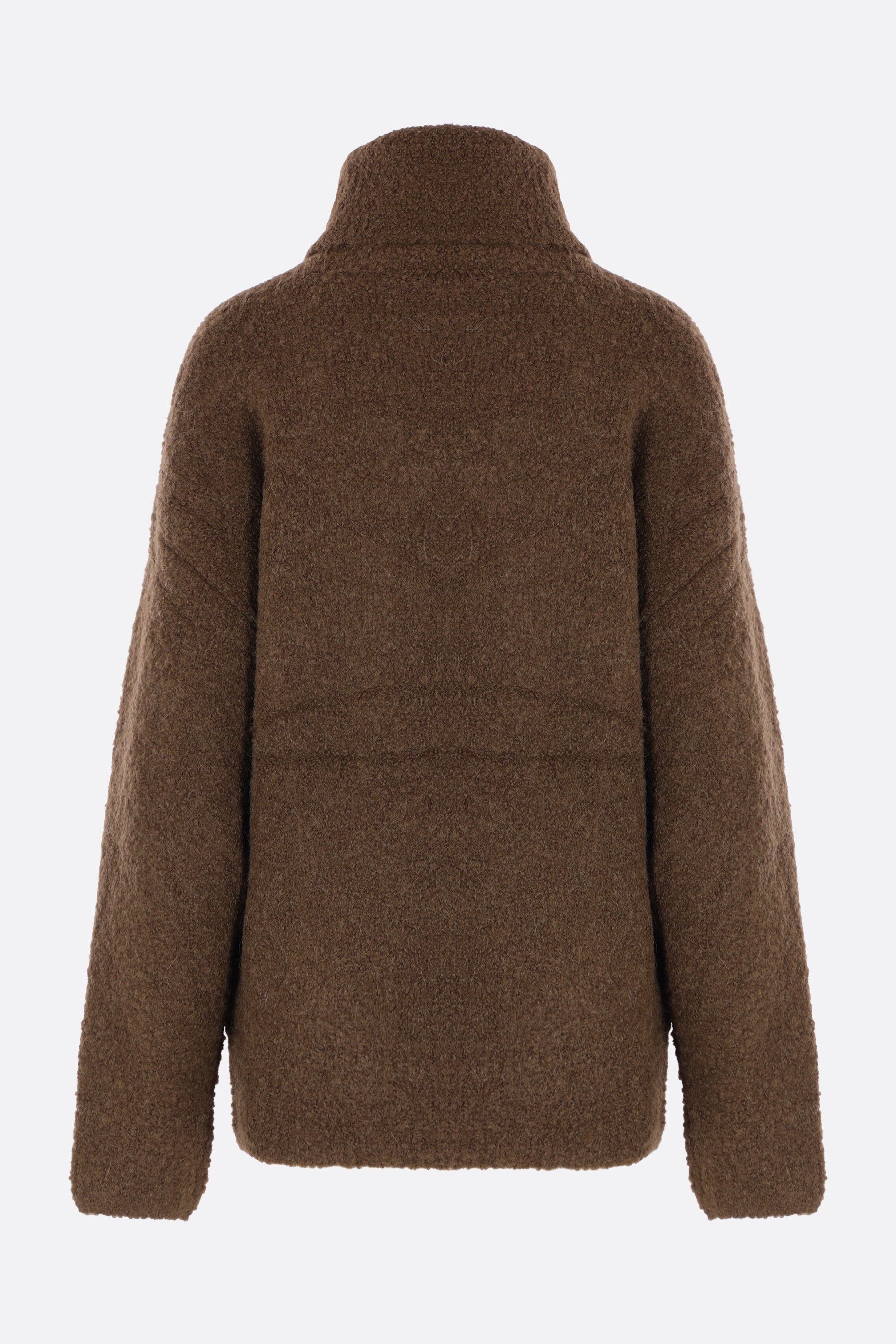 Toteme turtleneck sweater crafted in brown khaki alpaca-wool blend bouclé. Featuring a high neck, long sleeves, and straight hem.