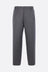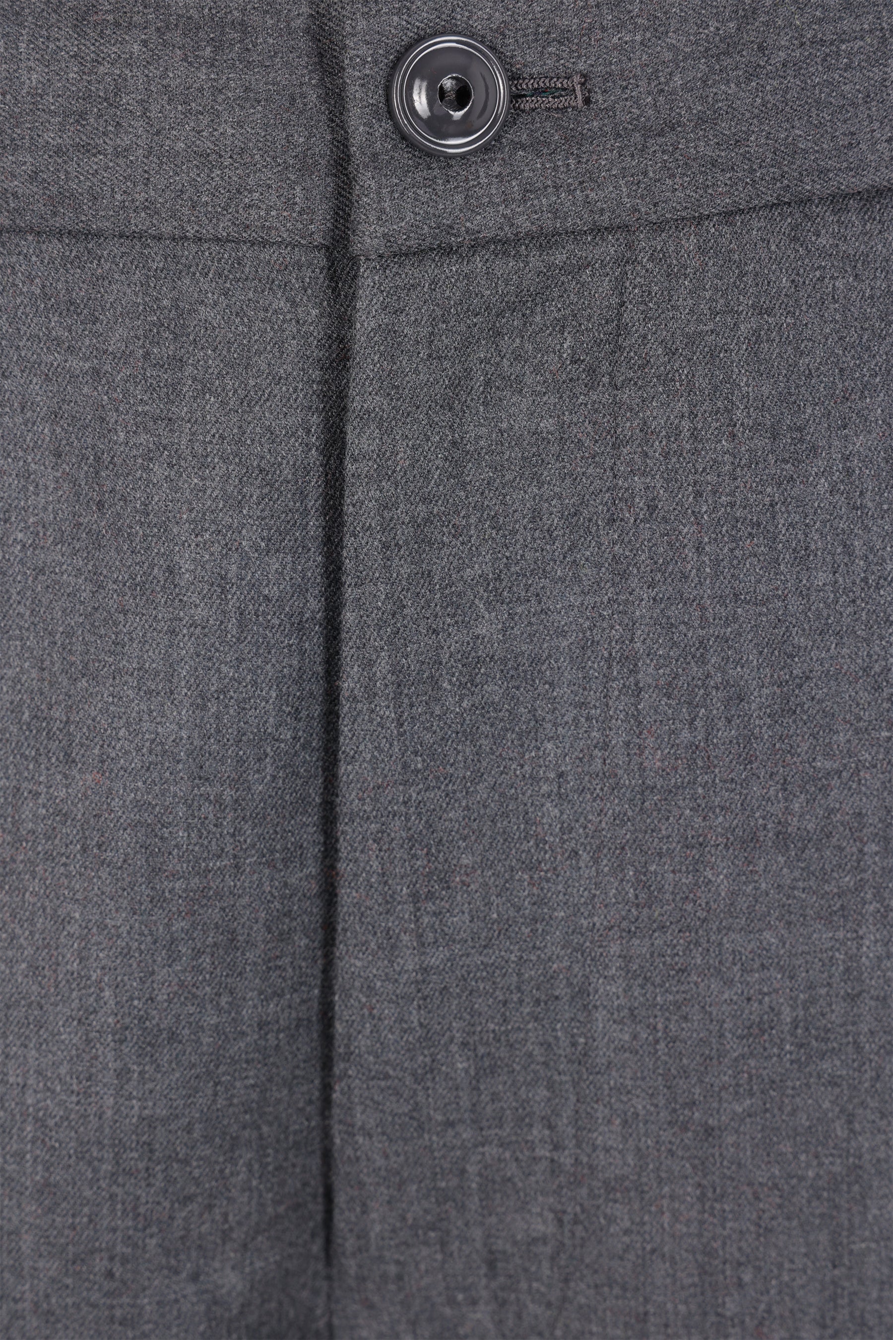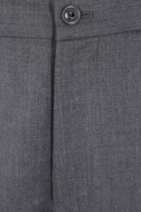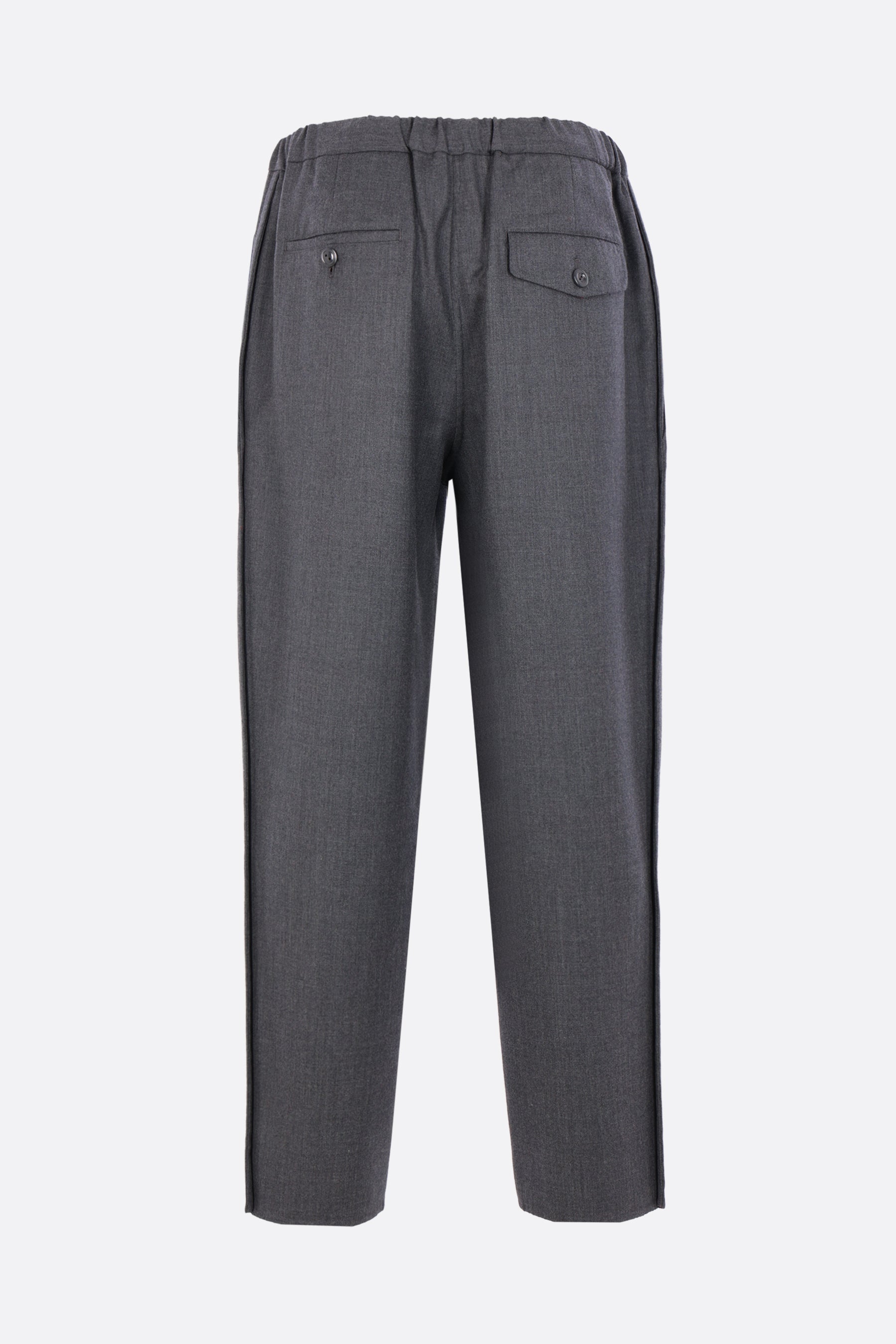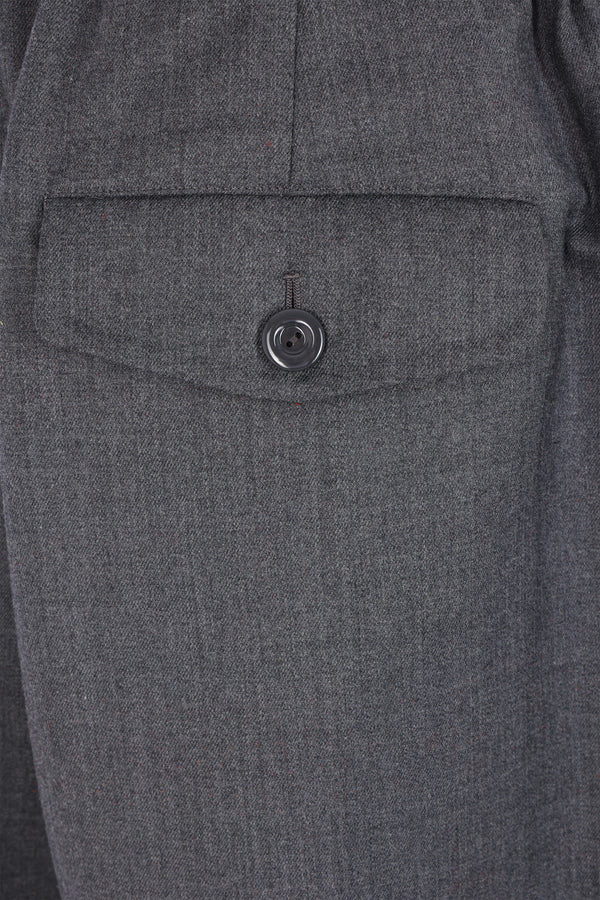 Undercover trousers crafted from dark gray wool. Featuring an elasticated waistband with drawstring, front button/zip closure, multiple pockets, and tartan-patterned lined interior.