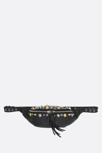 Valentino Garavani belt bag made of black hammered leather and decorated with studs of various shapes and sizes. Featuring silver-tone metal hardware, a double-zip closure, and an adjustable belt. The black suede-lined interior includes a card slot. The design is completed by the metal VLogo Signature detail.