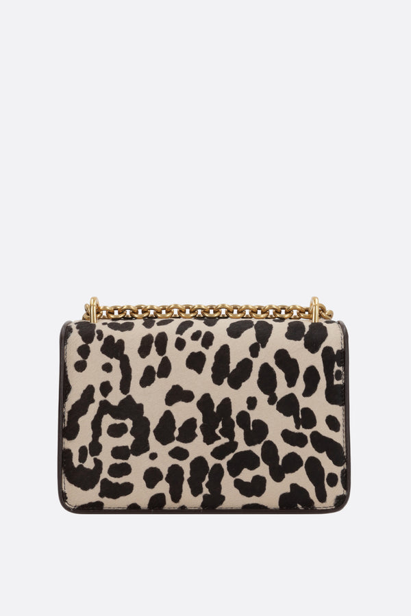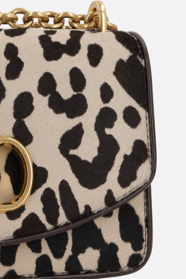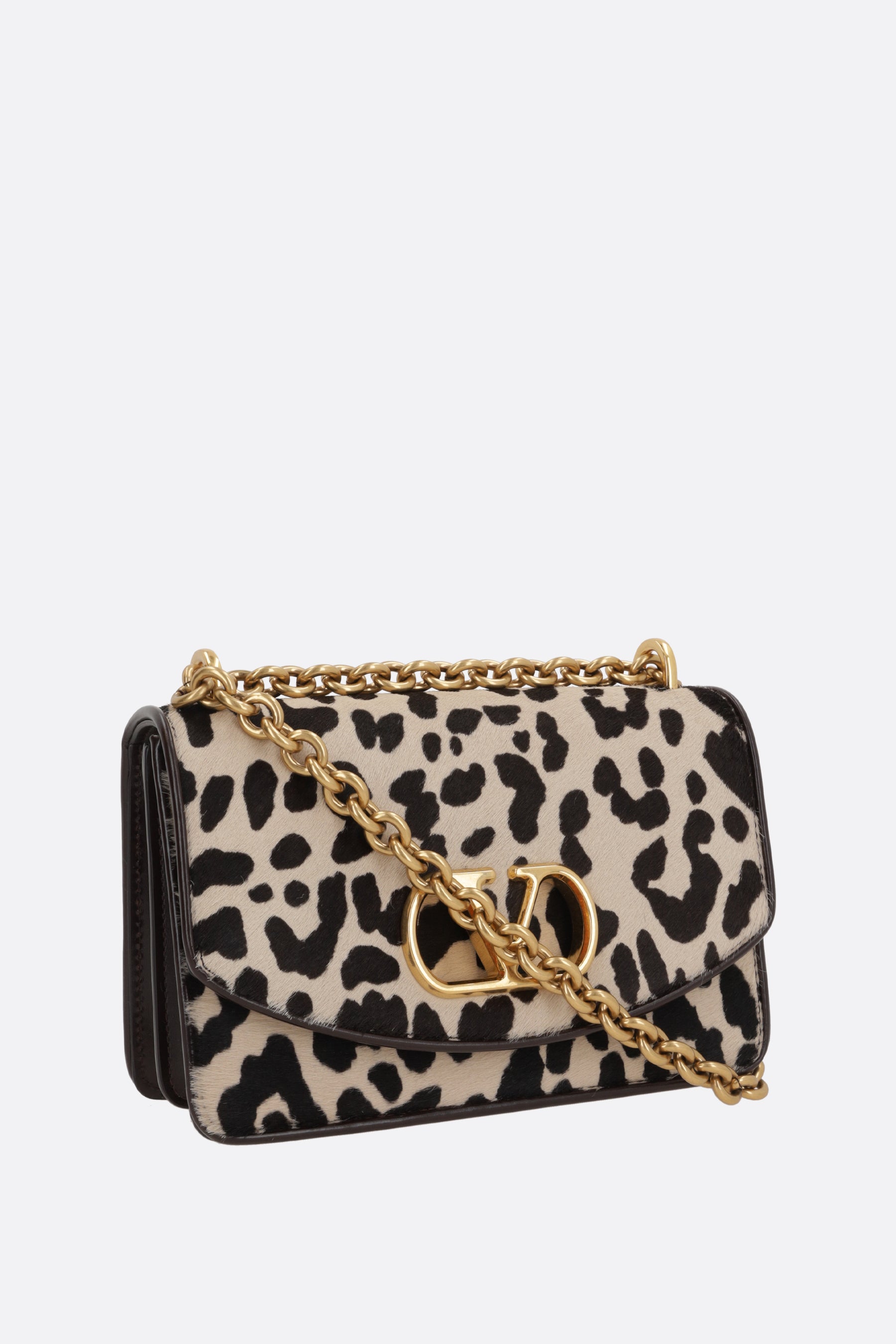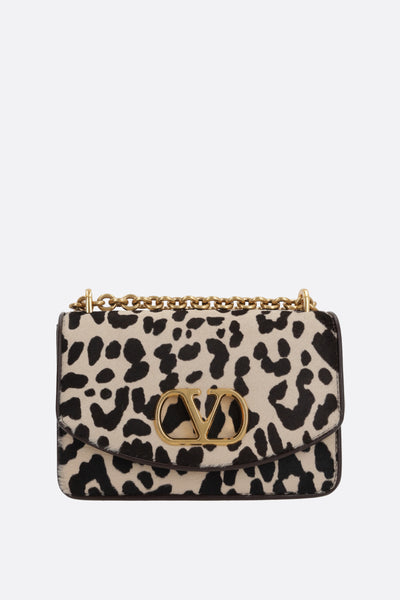 Valentino Garavani shoulder bag crafted from animal-print pony hair with smooth brown leather trim. Featuring antique gold-tone hardware, a magnetic button closure on the flap, and an adjustable chain shoulder strap with two length options. The brown nappa-lined interior includes two separate compartments, a zip pocket, and a card slot. The design is completed with a metallic VLogo Signature detail.