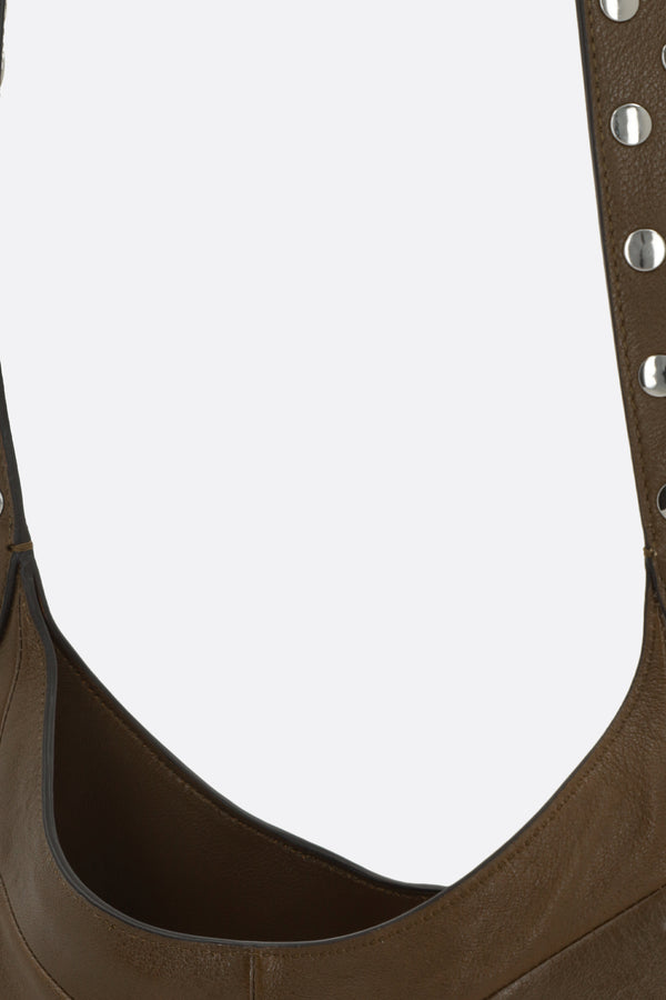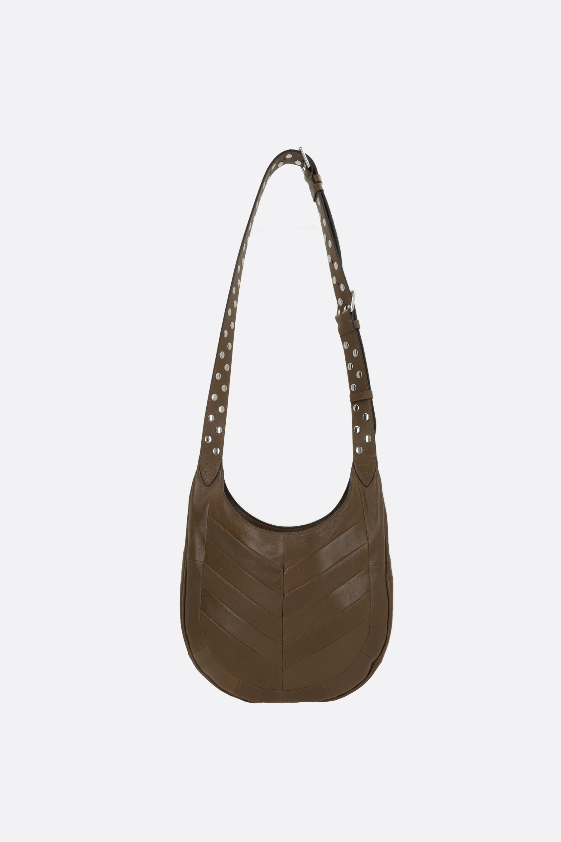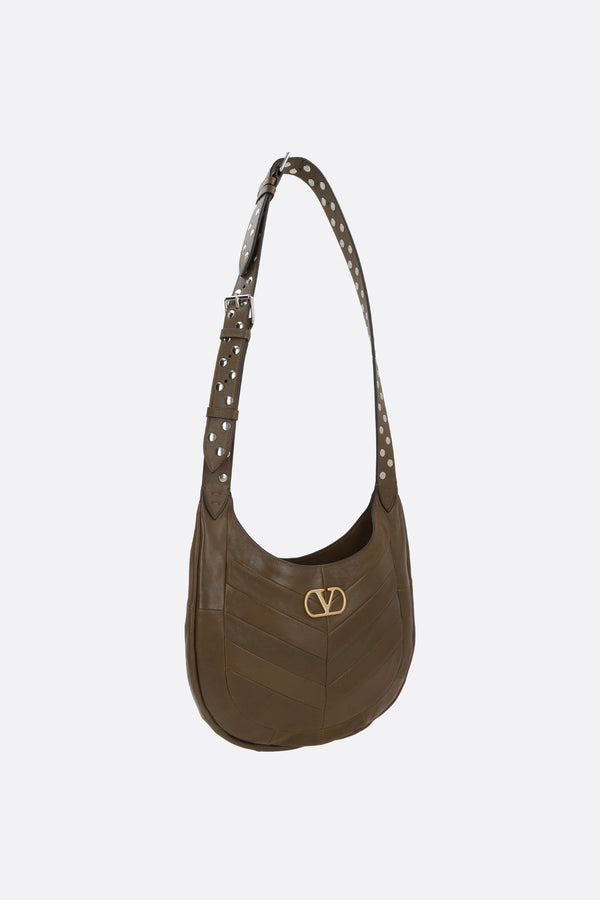 Valentino Garavani hobo bag crafted from a chevron-patterned patchwork of glossy and matte nappa leather. Features silver-toned hardware, adjustable studded shoulder strap, and a tone-on-tone nappa-lined interior. The design is completed with an antique gold-tone VLogo Signature detail.