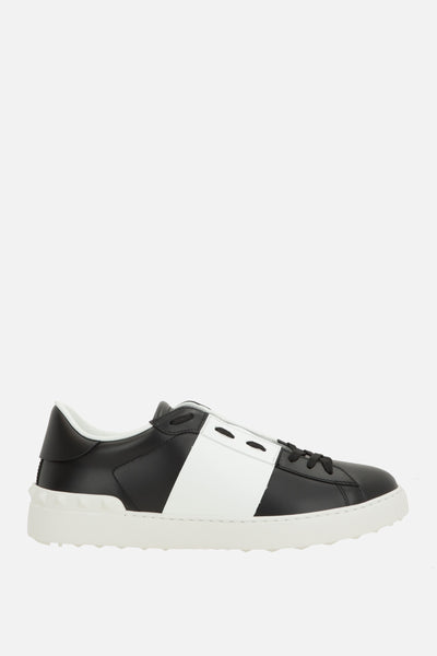 Valentino Garavani low-top sneaker crafted in white smooth leather with contrasting bands in marine blue leather. Featuring lace-up closure, a round-toe silhouette, leather lining and rubber sole. The design is completed by rubber studs around the heel.