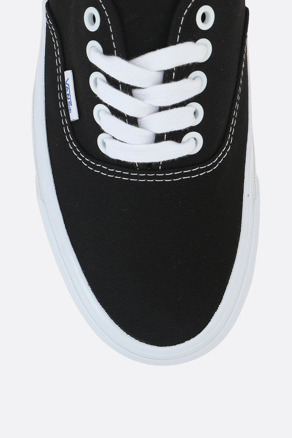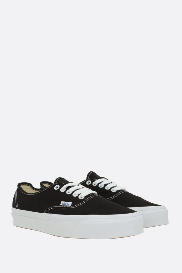 Vans low-top sneakers crafted from black canvas with contrast stitching. Featuring a lace-up closure, rounded toe, fabric linings, and a rubber sole.