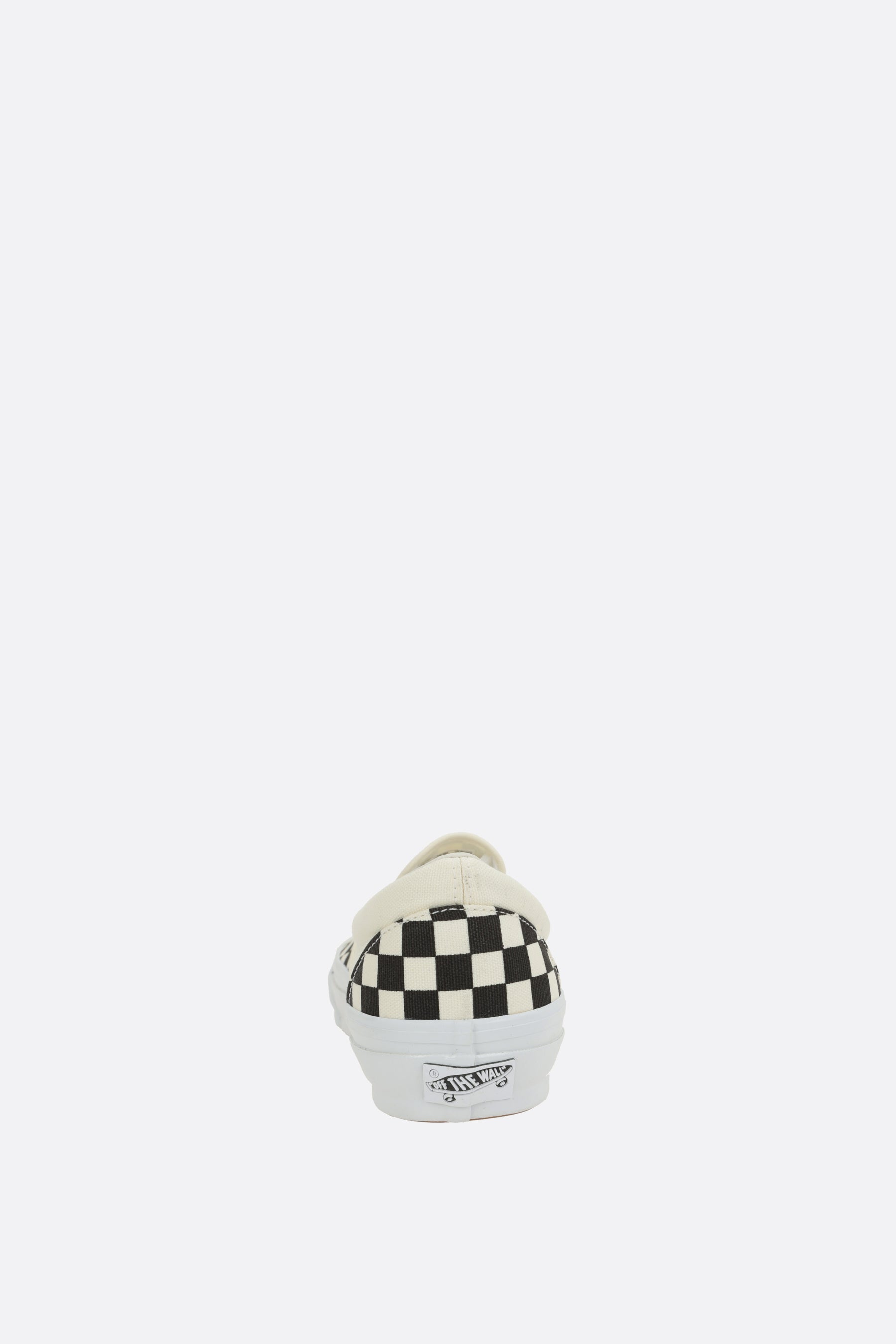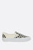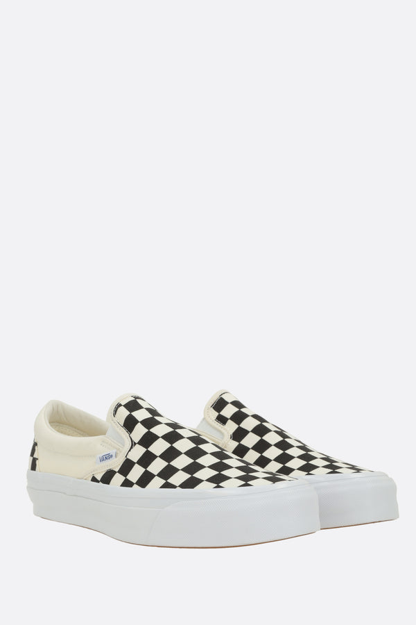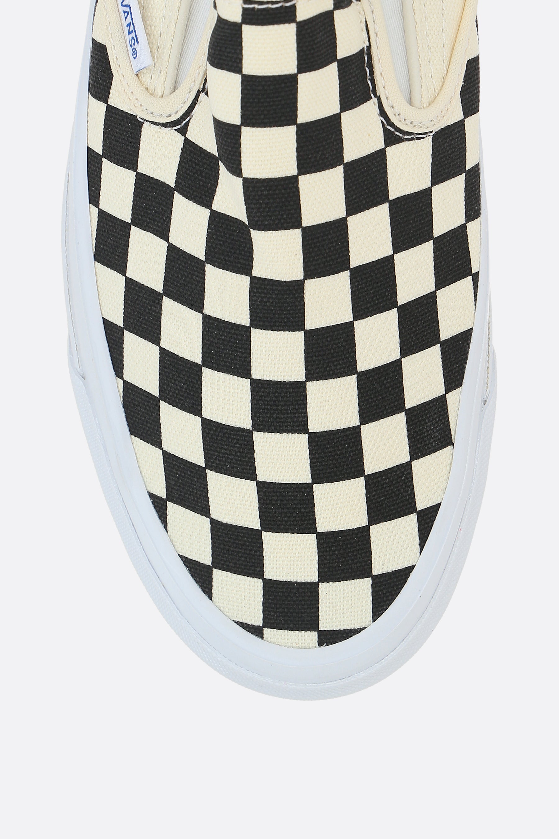 Vans slip-on sneakers crafted from black and ivory checkerboard canvas. Featuring elastic side inserts, a rounded toe, fabric linings, and a rubber sole.