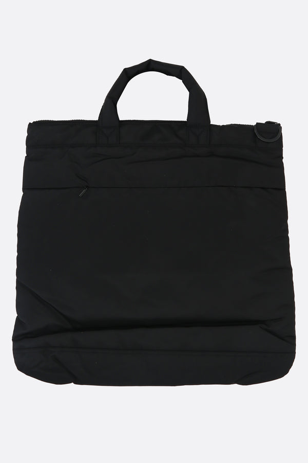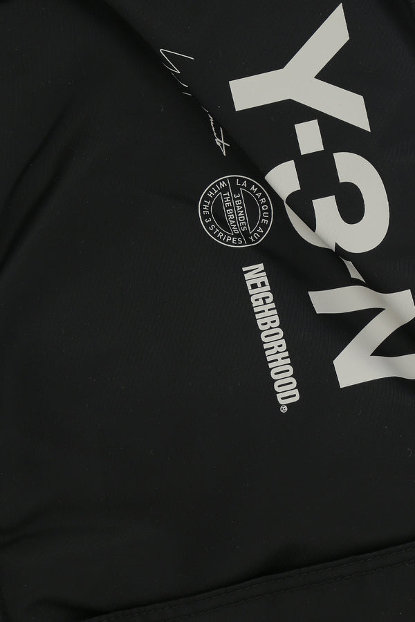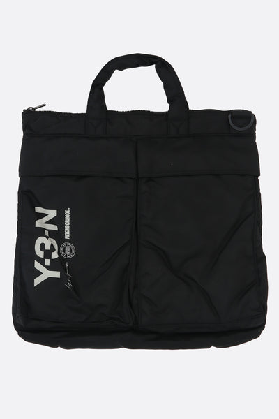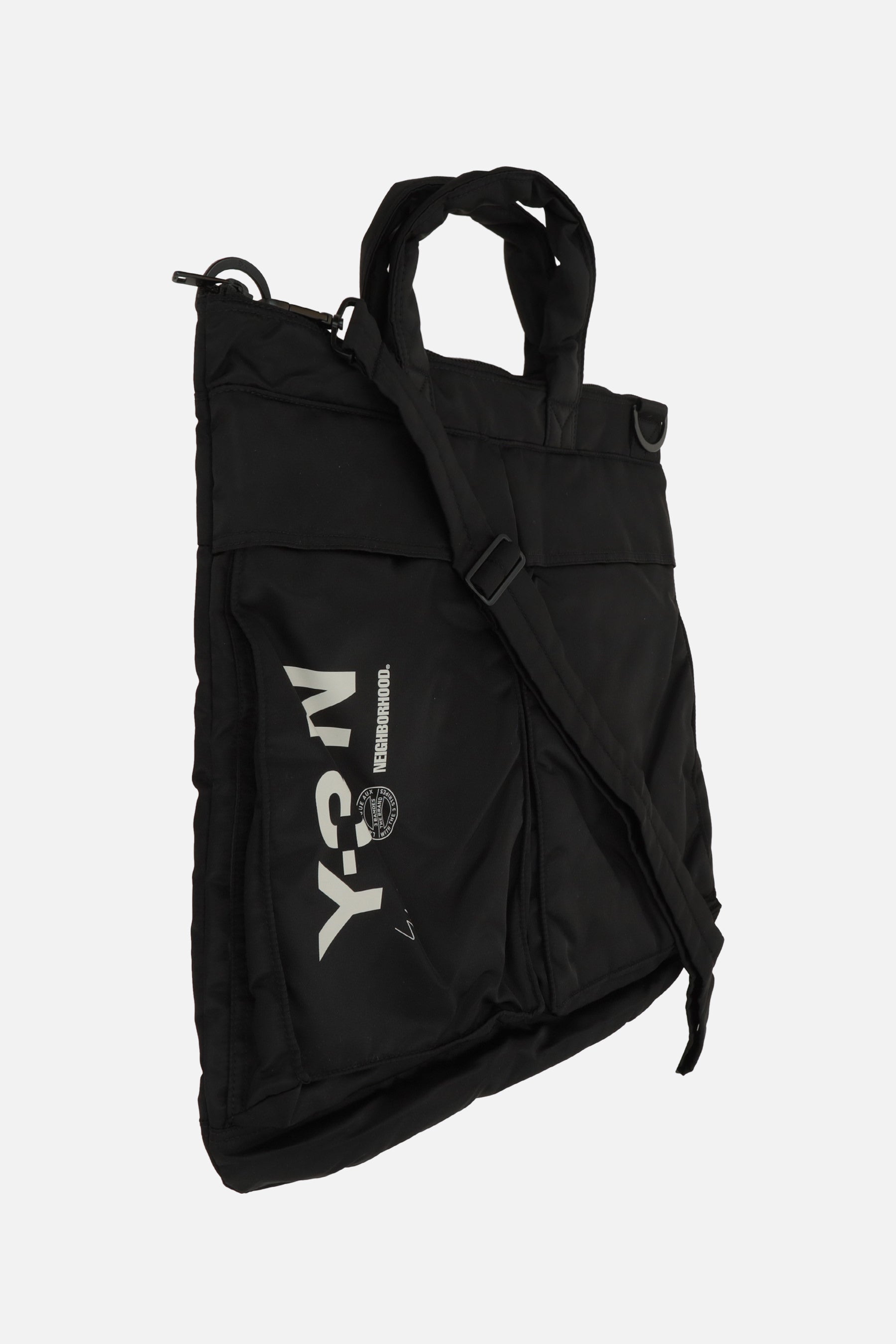 Y-3 x Neighborhood tote bag crafted from black nylon with a front Y-3-N print. Features black-tone hardware, zip closure, double handles, and an adjustable / removable crossbody strap. The tonal nylon-lined interior includes a zip pocket and a laptop compartment. The design is completed with three external pockets.