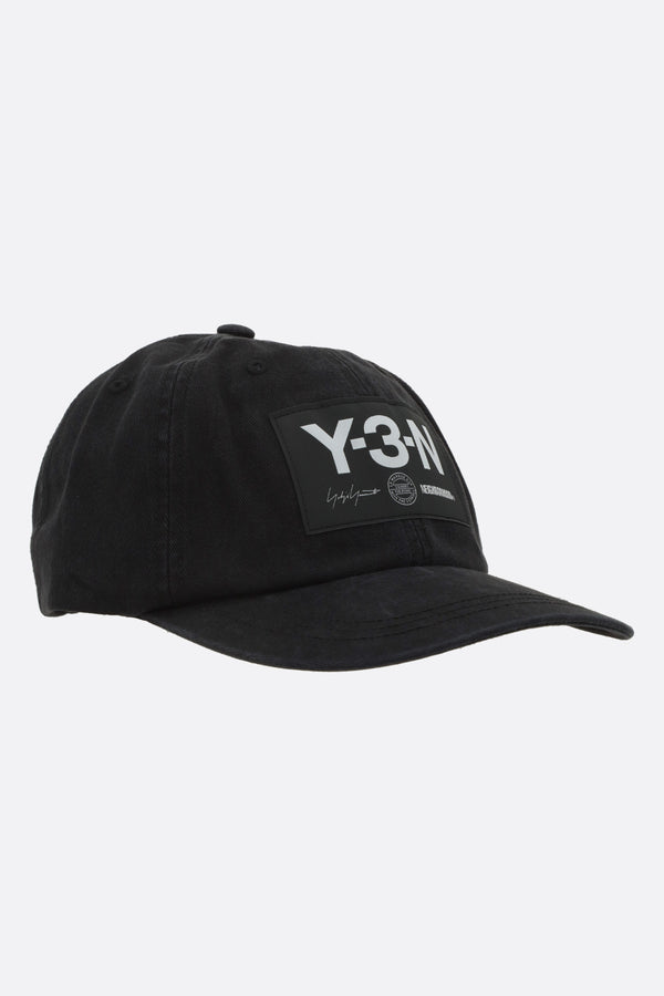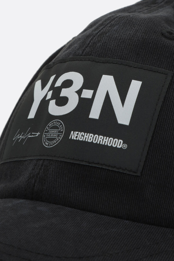 Y-3 x Neighborhood baseball cap crafted from black cotton gabardine with an embroidered Y-3-N patch on the front. Features an adjustable back strap with metal buckle and an unlined interior.