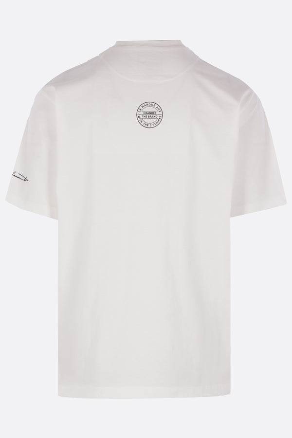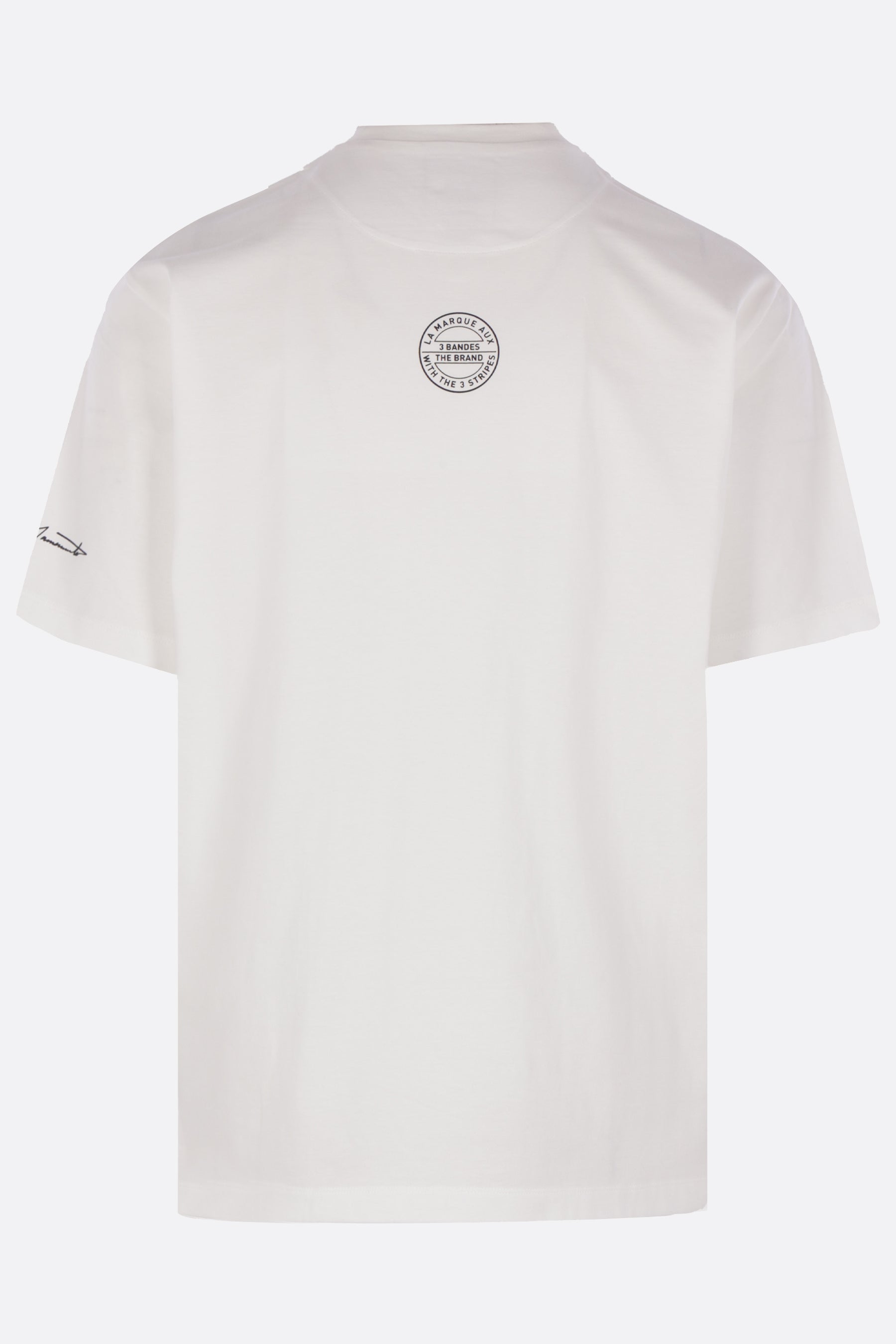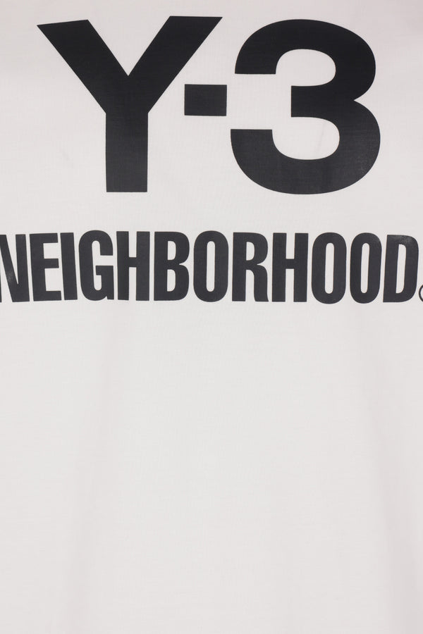 Y-3 x Neighborhood t-shirt crafted from white cotton jersey with a front logo print and Yohji Yamamoto signature on the sleeve. Features a crew neckline, short sleeves, and a straight hem.