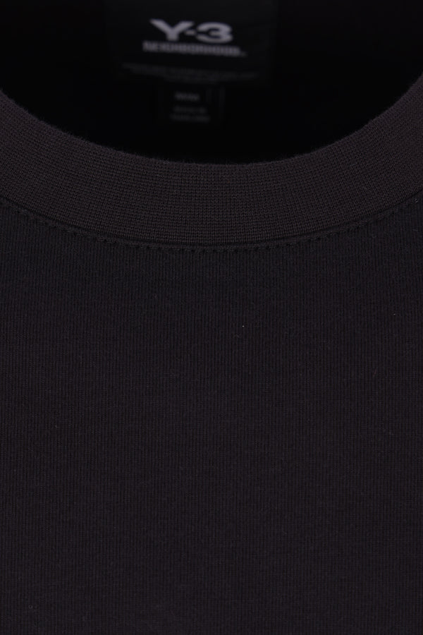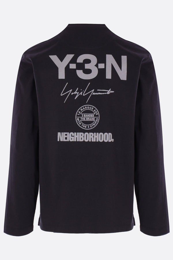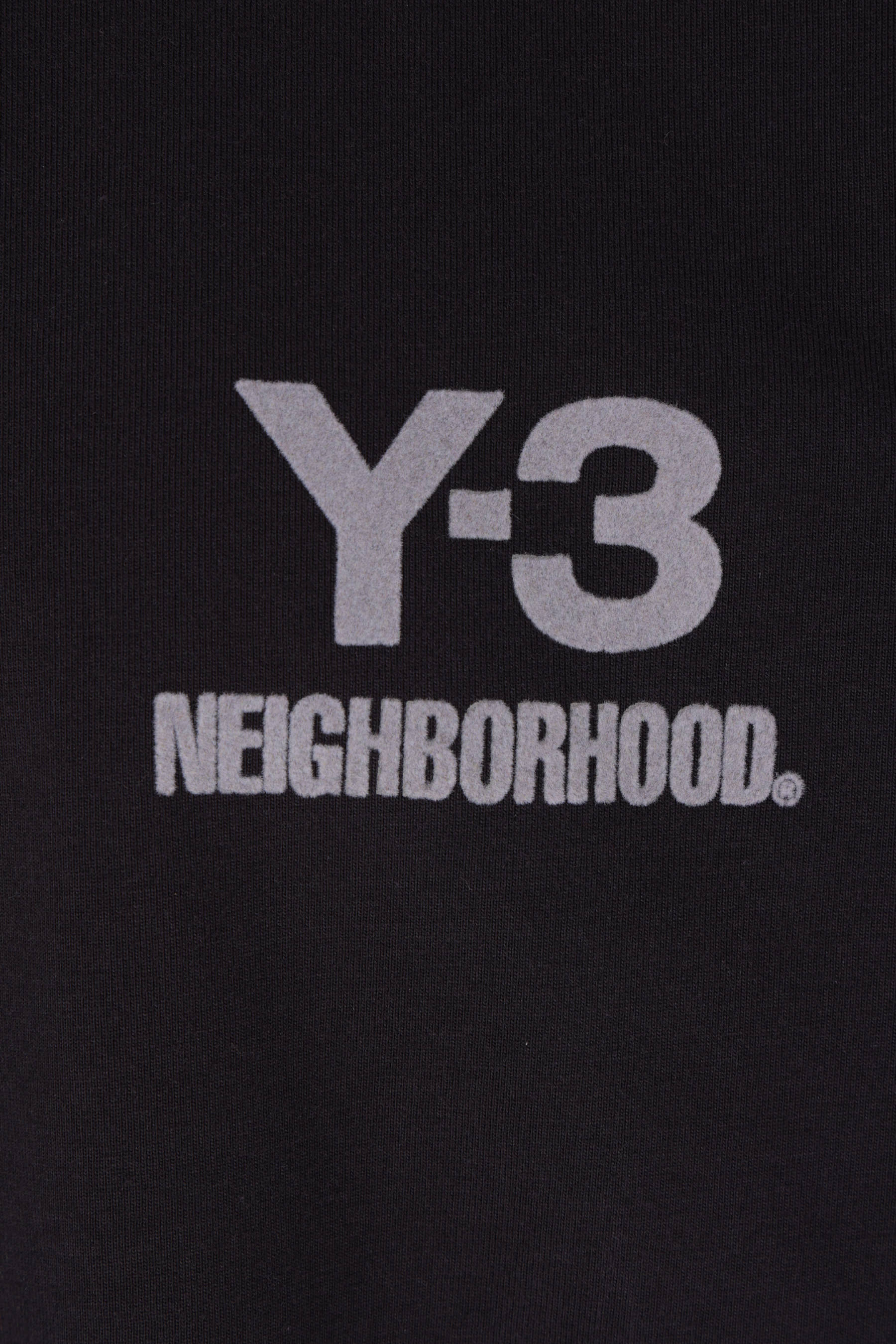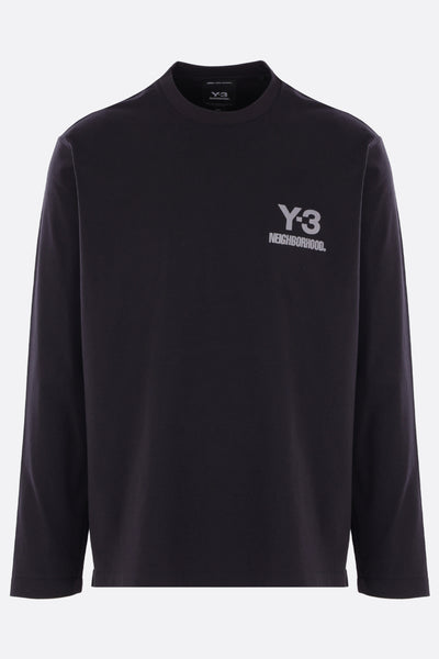 Y-3 x Neighborhood t-shirt crafted from black cotton jersey with logo prints on the chest and back. Features a crew neckline, long sleeves, and a straight hem with small side slits.